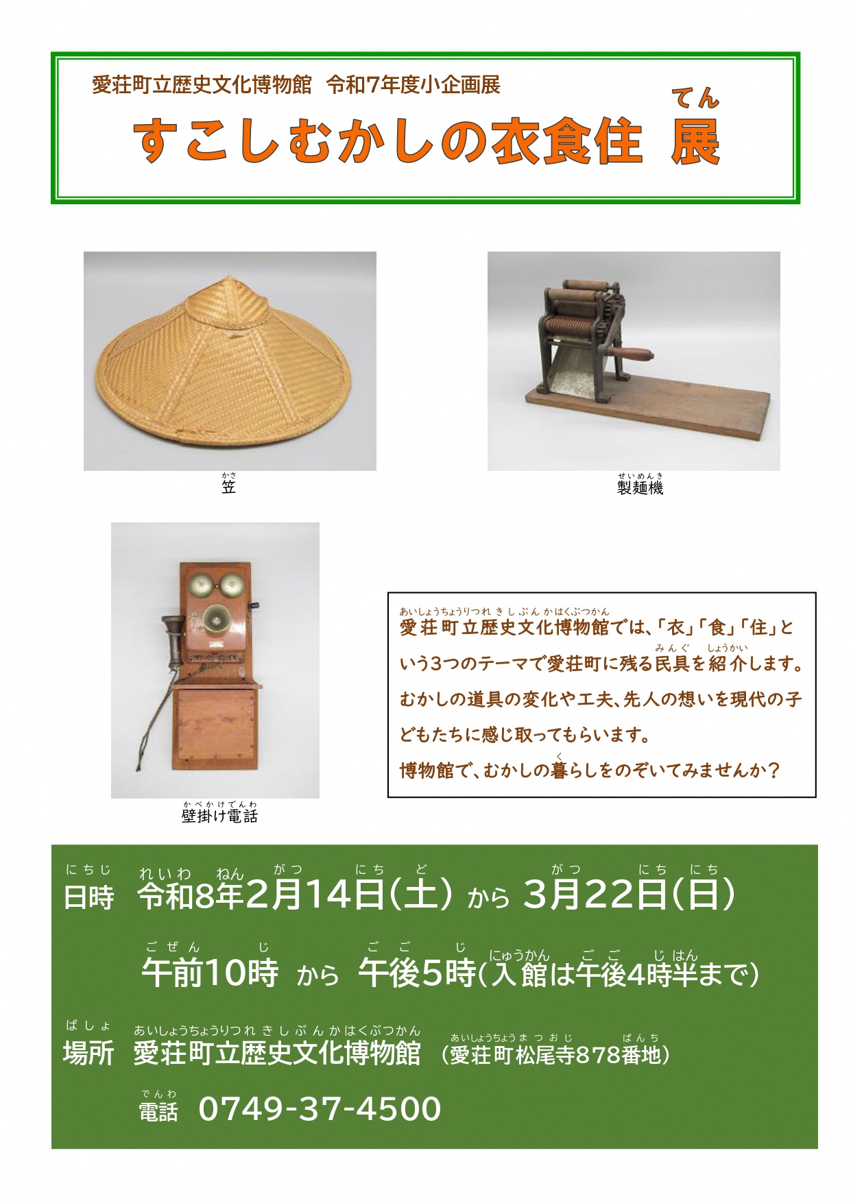 愛荘町立歴史文化博物館では「衣」「食」「住」という3つのテーマで愛荘町に残る民具を紹介します。むかしの道具の変化や工夫、先人の想いを現代の子どもたちに感じ取ってもらいます。