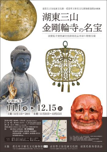 本展では、滋賀県立琵琶湖文化館に寄託されている金剛輪寺の宝物を中心に、愛荘町立歴史文化博物館寄託の宝物も併せて展示し、金剛輪寺の名宝の魅力をお伝えします。また、関連作品として湖東三山最北に位置する西明寺の宝物を展示し、湖東の奥深い歴史と美をご紹介します。