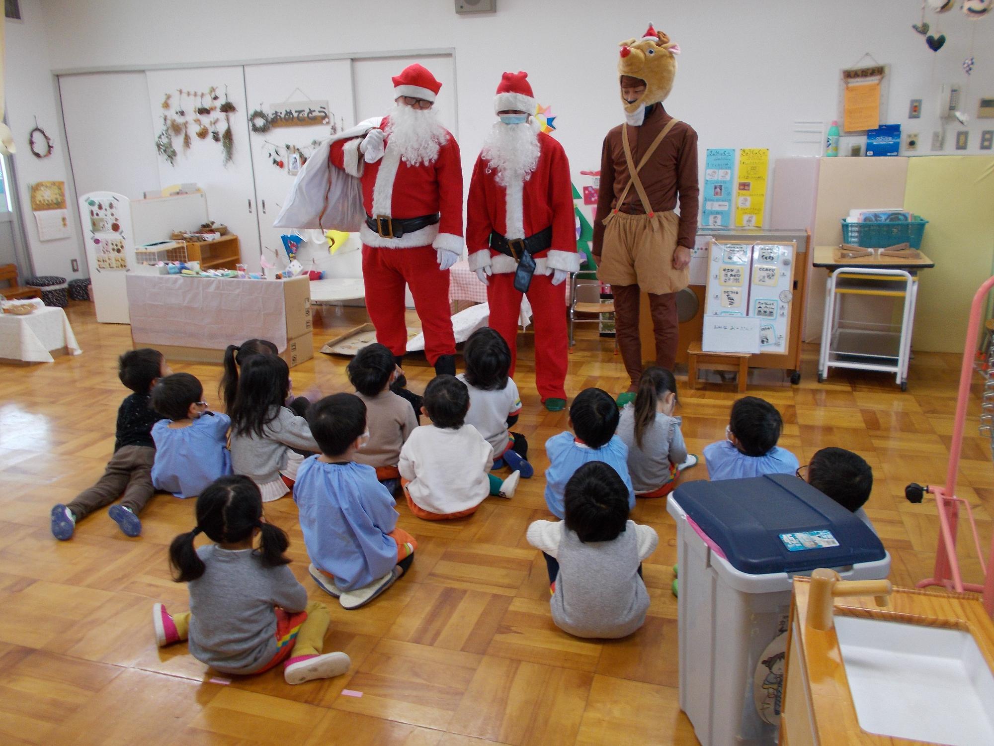 最後に年長の子ども達がお礼に「あかはなのトナカイ」の歌を元気いっぱい歌いました。そしてサンタさんと別れを惜しみながら、楽しいおたのしみ会を閉じました。来年も元気いっぱい、楽しいことがいっぱいの一年になりますように。メリークリスマス!
