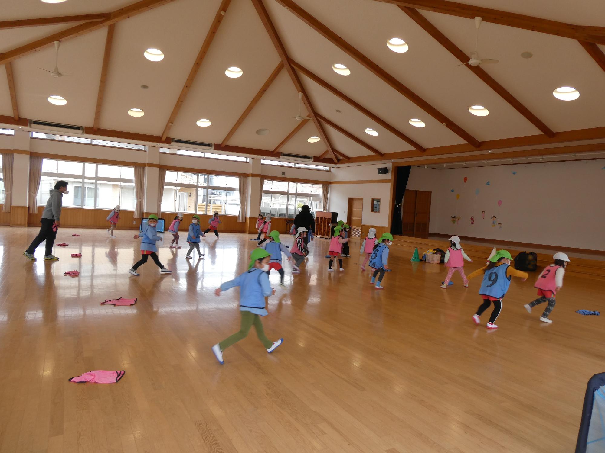1月27日に年中組のサッカー教室がありました。雪のため遊戯室でクラスごとに行いました。体操の後、コーディネーションでビブスキャッチやカニさん歩きなどのウォーミングアップをしました。続いてペアでドリブルやシュート。みんなとっても上手でした。最後は試合をグループに分かれてしました。終了後「楽しかった」「もっとやりたい」子ども達の嬉しそうなつぶやきに笑顔がこぼれました。