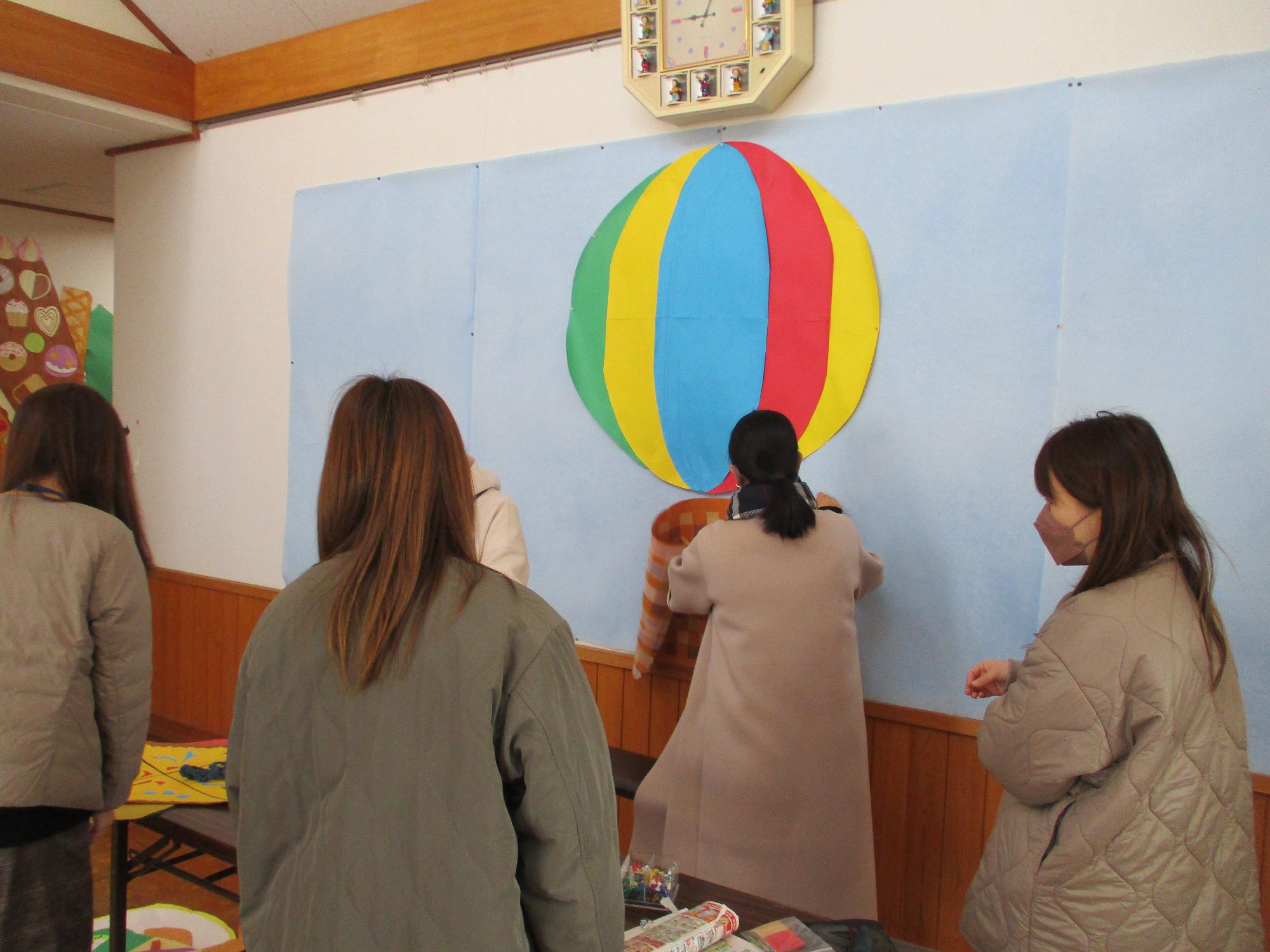 壁面いっぱいに気球が広がりました! 更新日:2024年01月26日 1月15日に保護者ボランティアさんが玄関壁面の装飾に来てくださいました。 お正月の壁面からかわいい気球の壁面に大変身!大きな気球や小さな気球が空いっぱいに広がりました。 さらに、修了証書授与式の日に飾る大きな修了証書の作成も進めてくださいました。