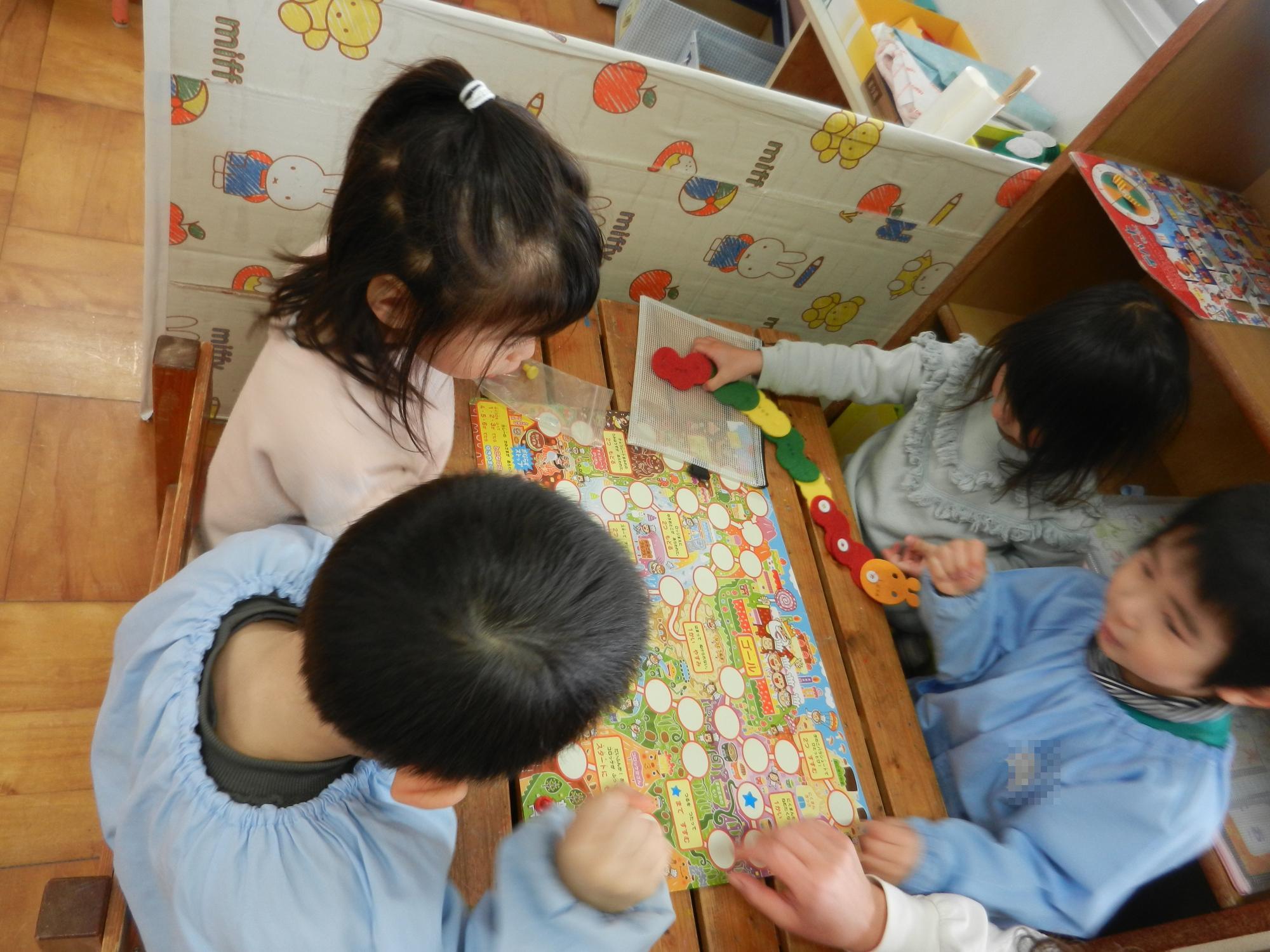 3学期はお正月遊びがとても盛り上がりました。トランプやすごろくでは、友達が「入れて」と言って仲間に入った時には、「次は○○ちゃんやで」「もう一回しよう」とルールを教え合う姿が見られました。