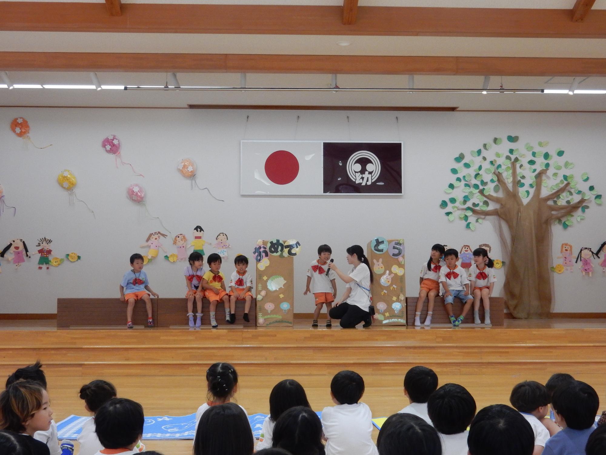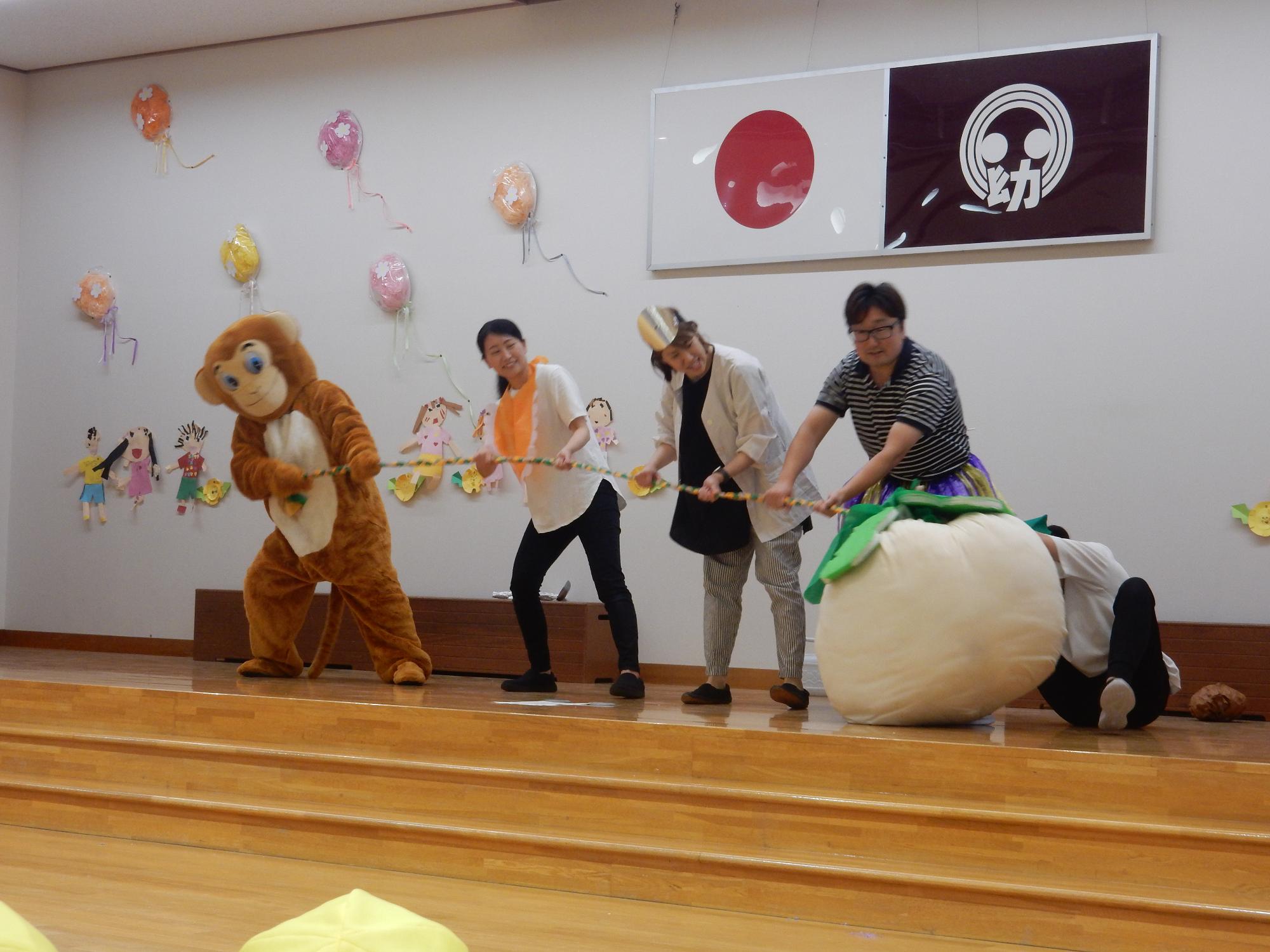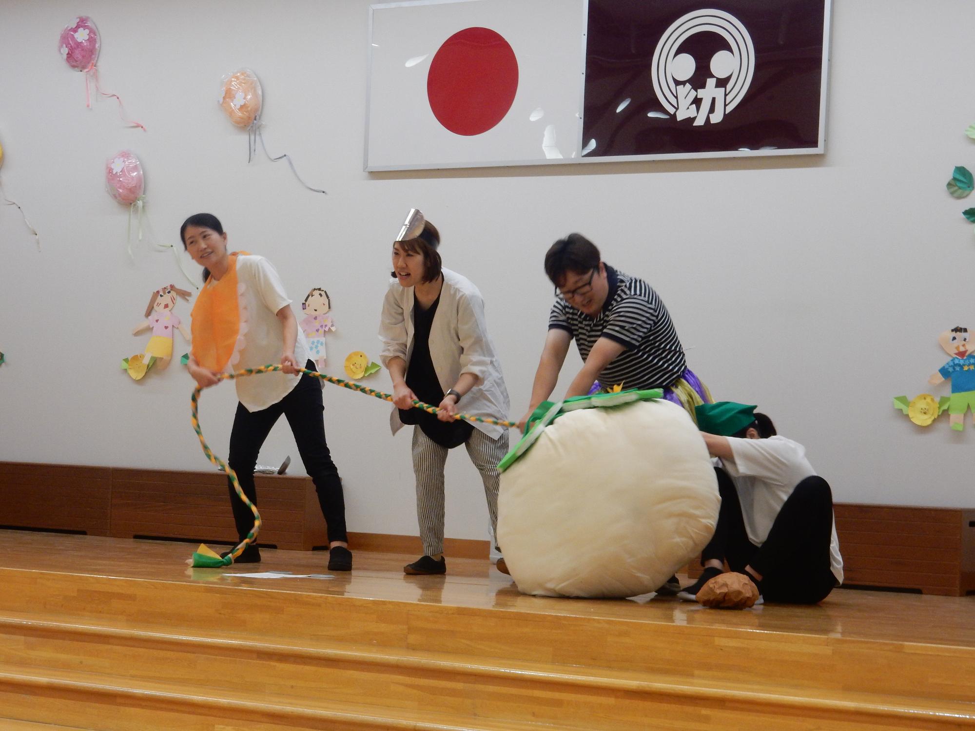 15日に7月生まれの誕生会がありました。一人ひとりのお祝いをした後は、お楽しみの出し物で職員劇「おおきなかぶ」を年少組さんも交えて観覧しました。