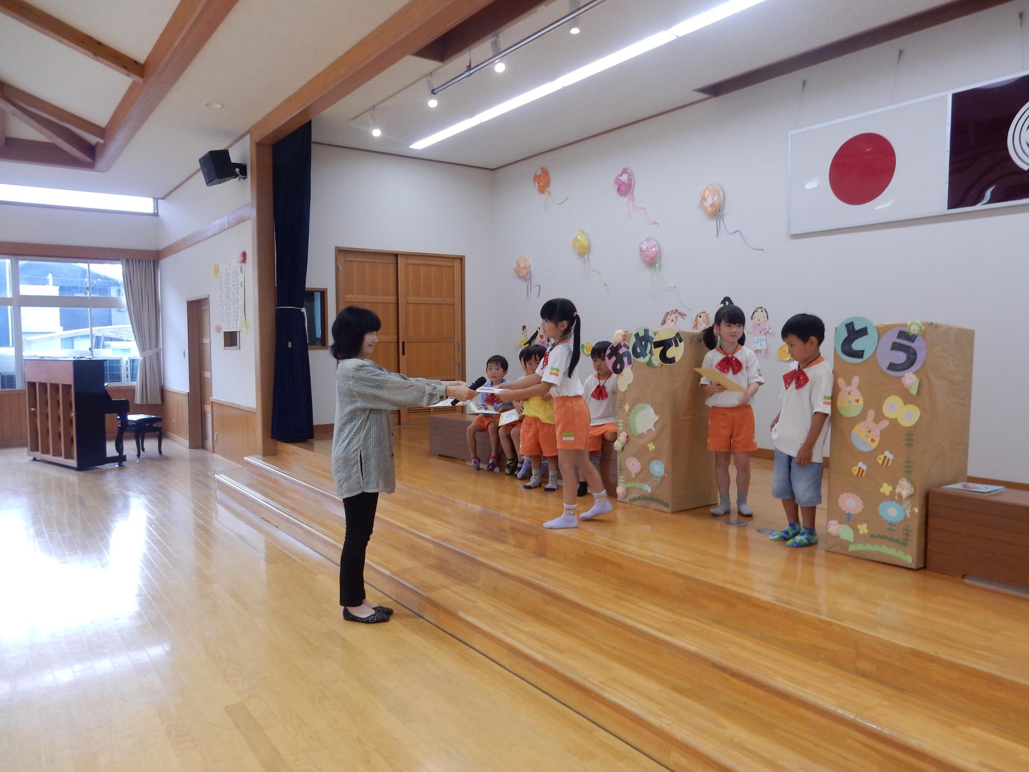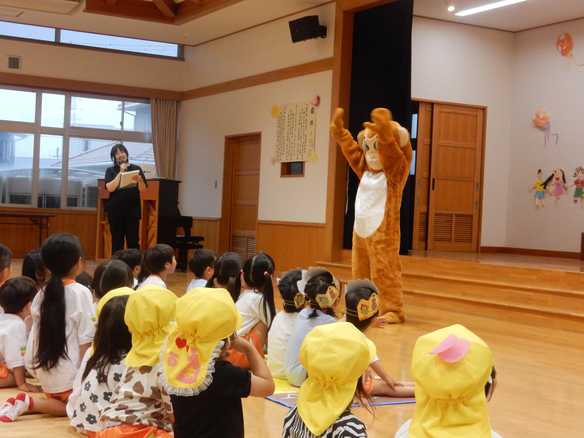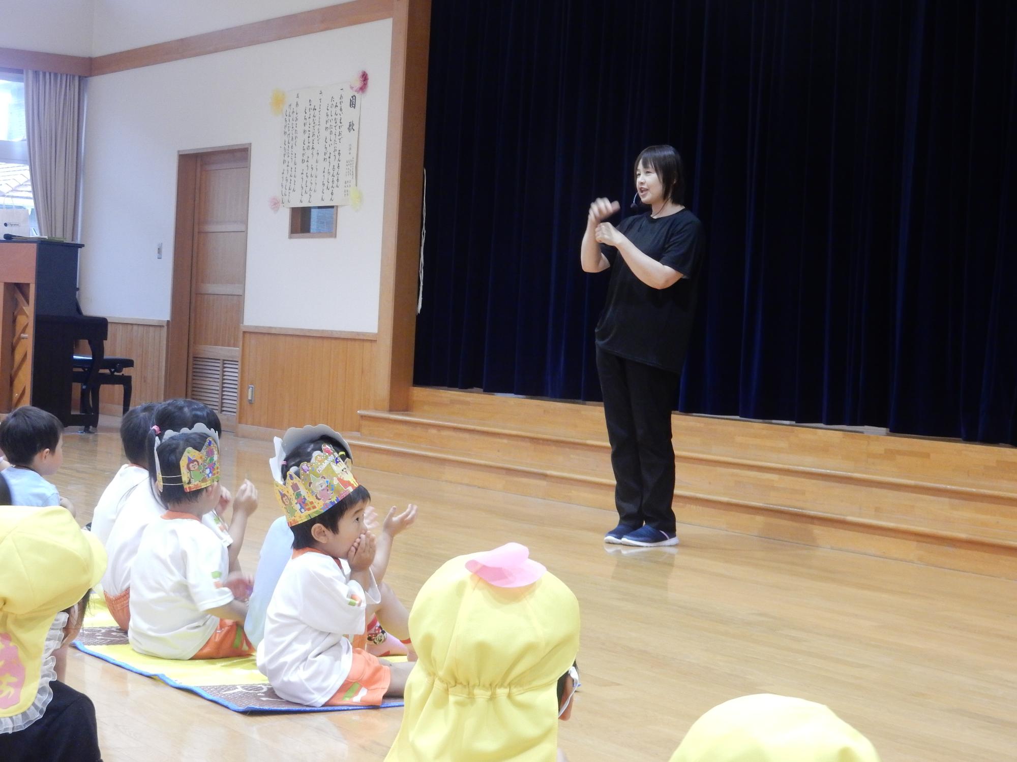 15日に7月生まれの誕生会がありました。一人ひとりのお祝いをした後は、お楽しみの出し物で職員劇「おおきなかぶ」を年少組さんも交えて観覧しました。