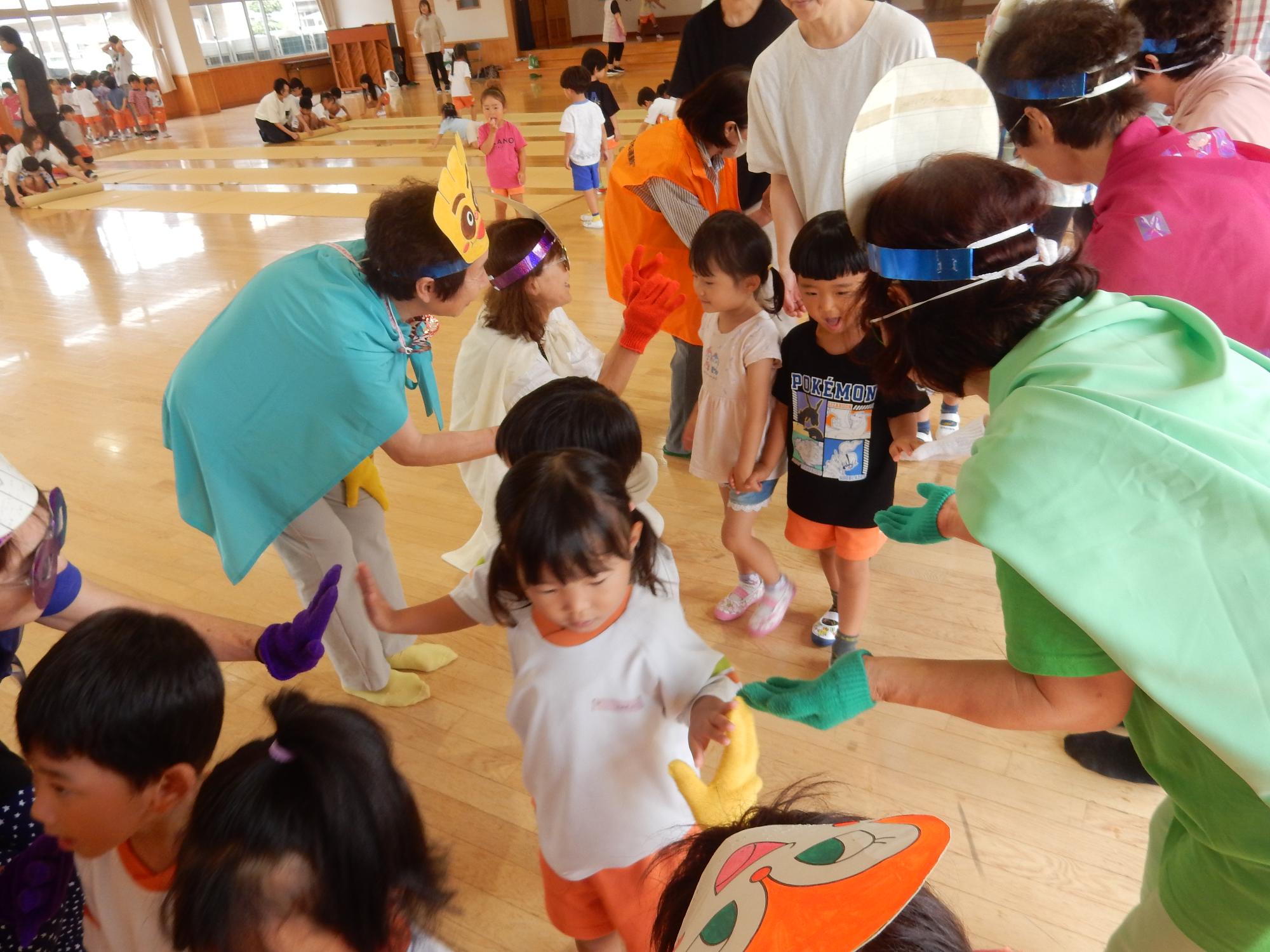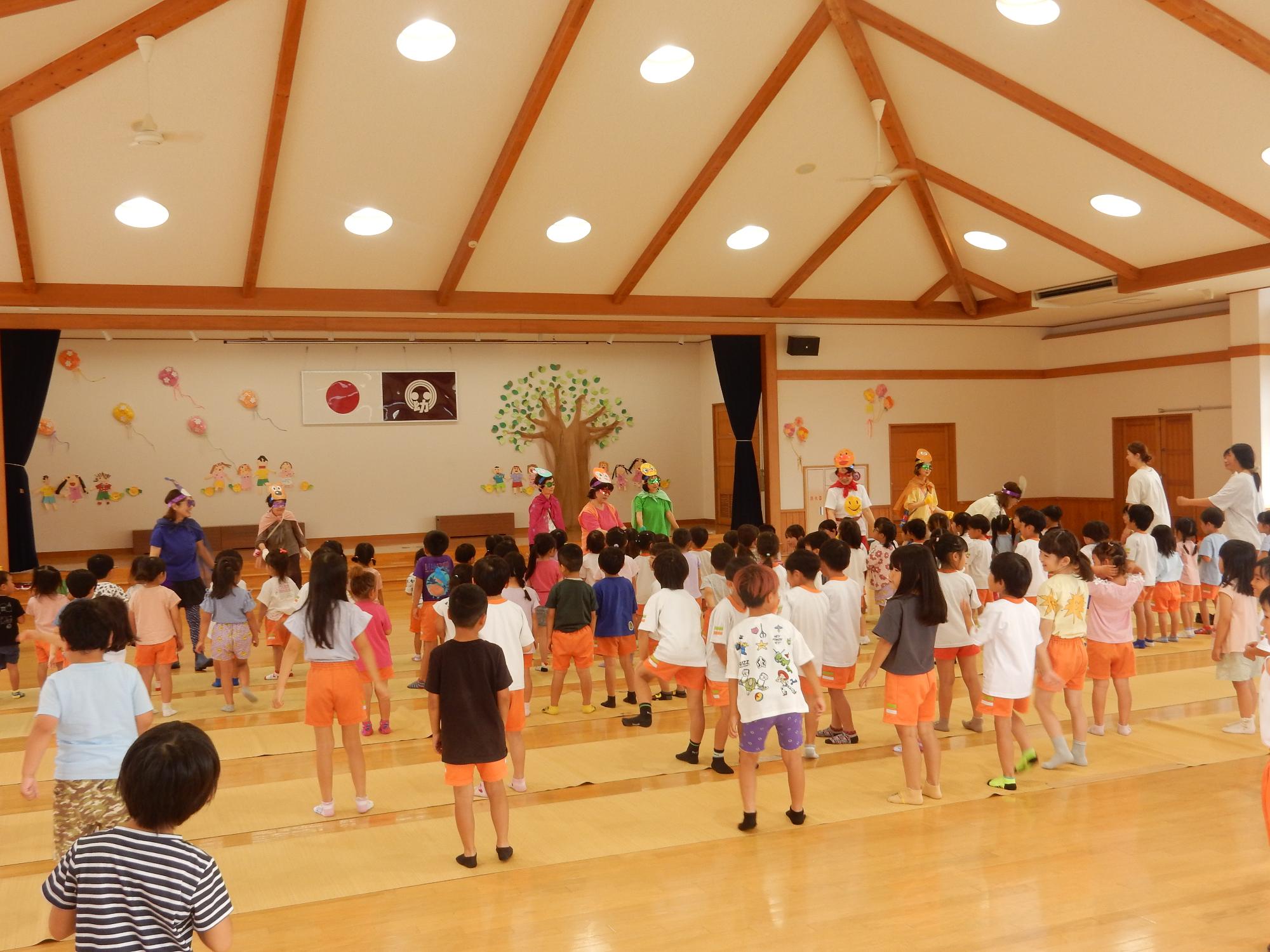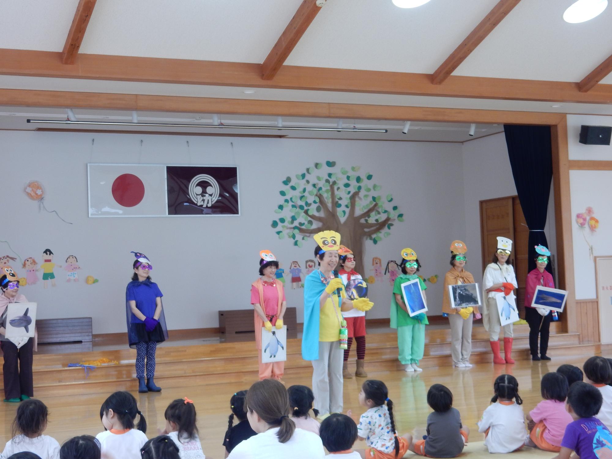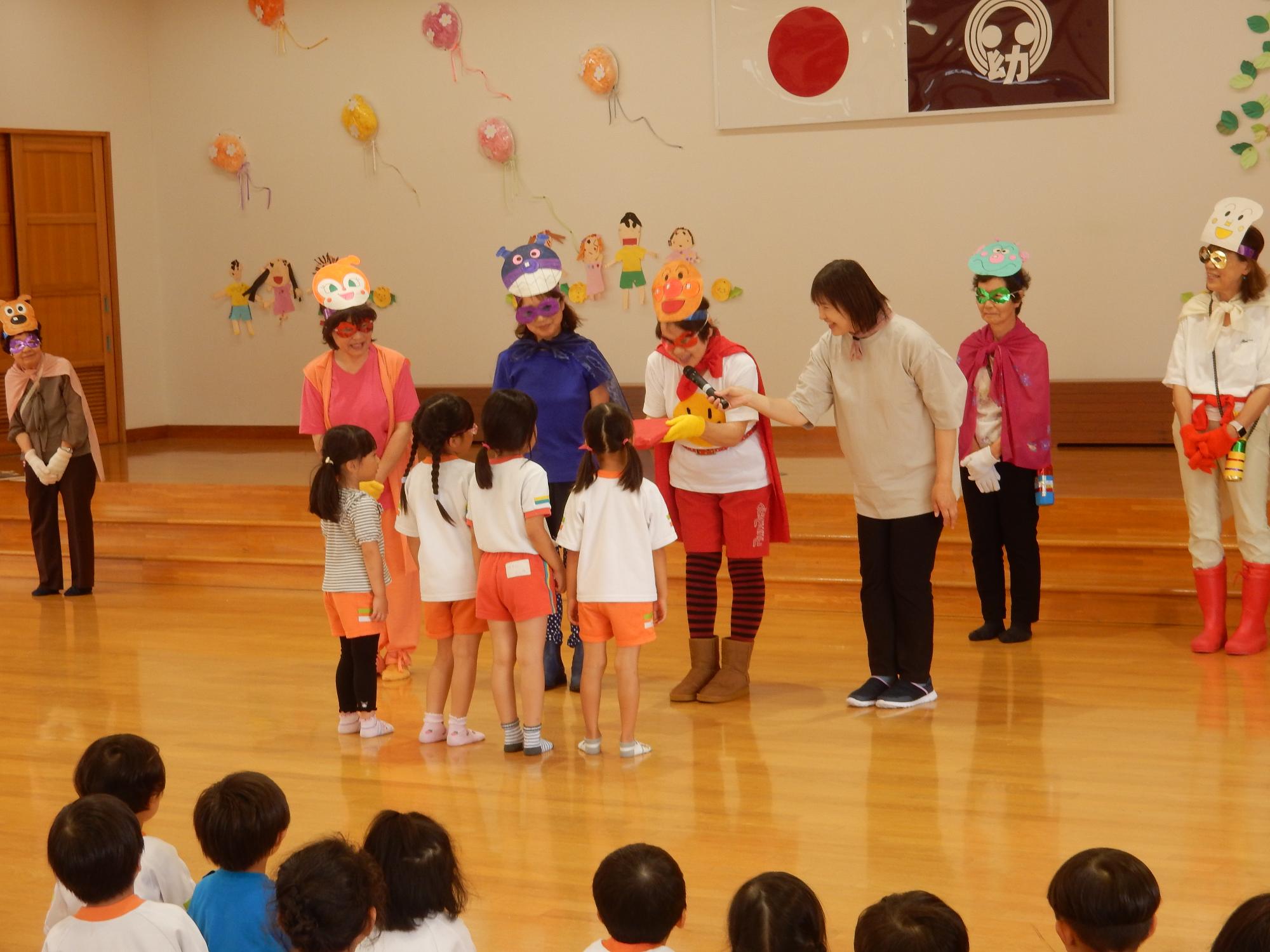 全園児が遊戯室に集まって更生保護女性会の方々から交通安全や生活習慣の大切さについて「アンパンマンと仲間たち」の劇を交えて楽しく教えていただきました。教えてもらった約束をきちんと守ろうね!
