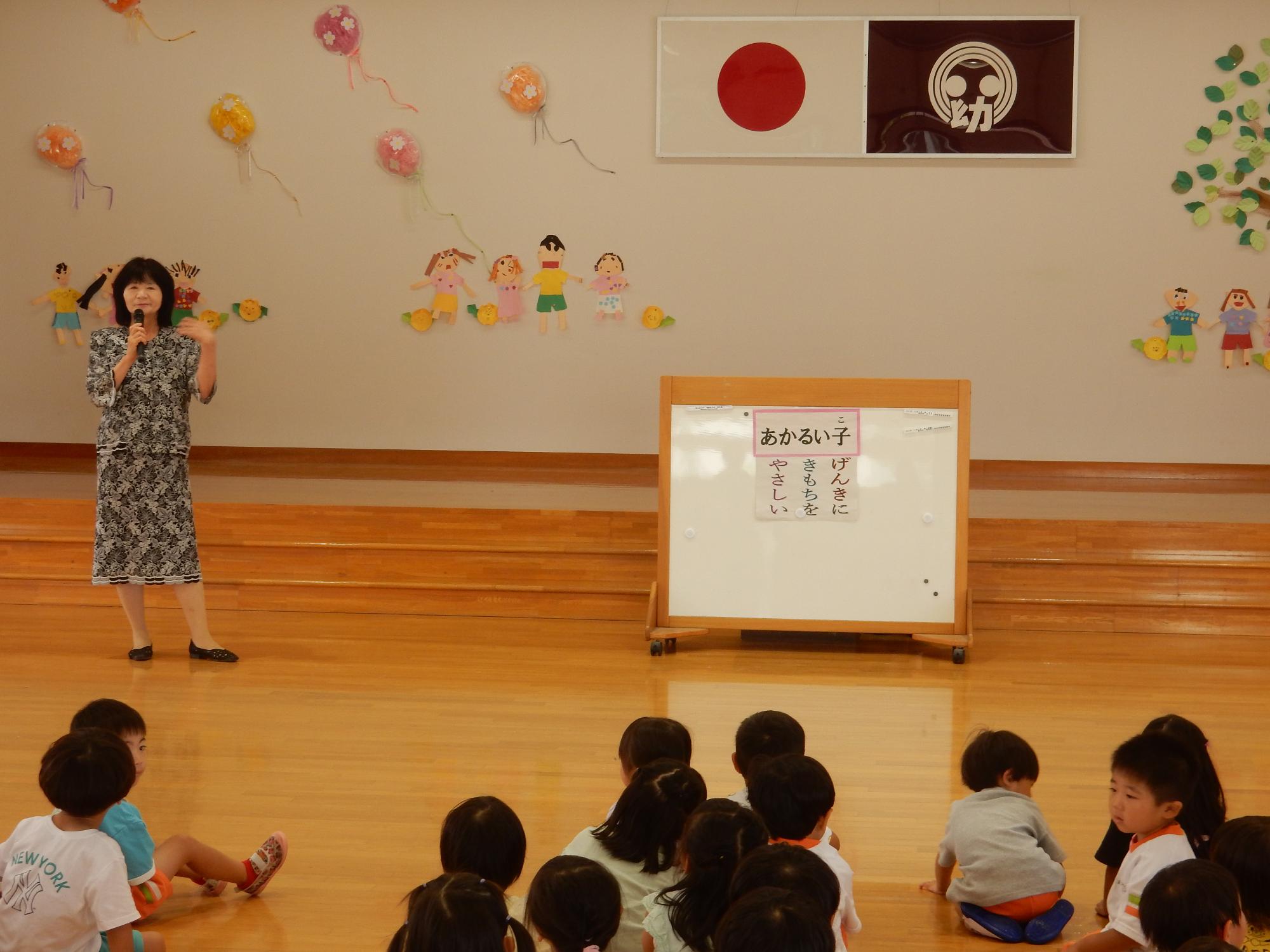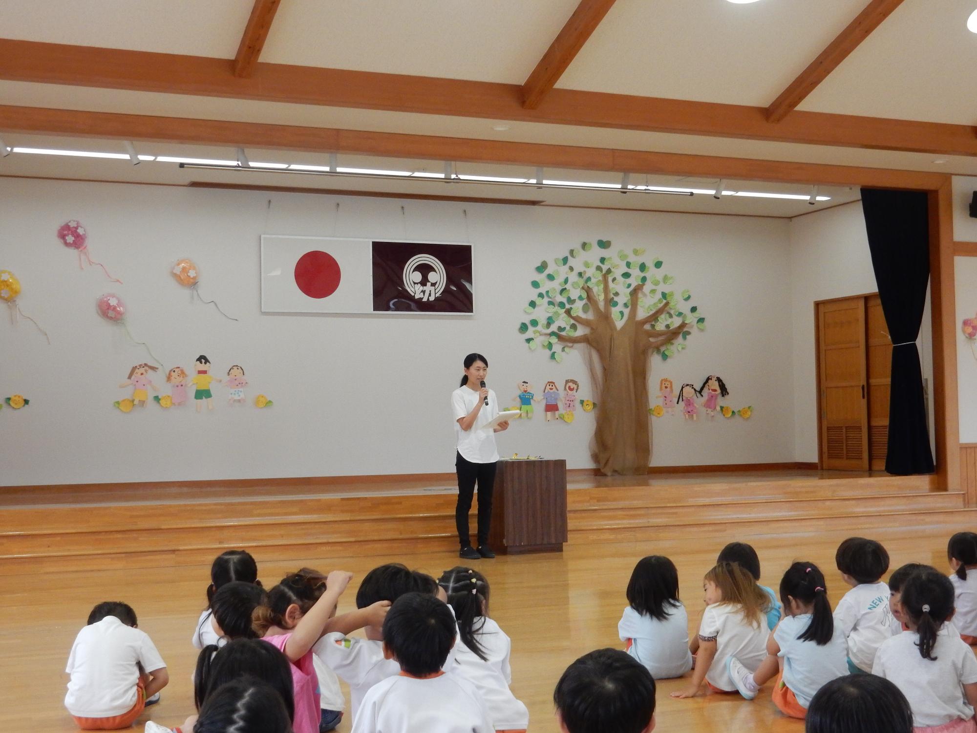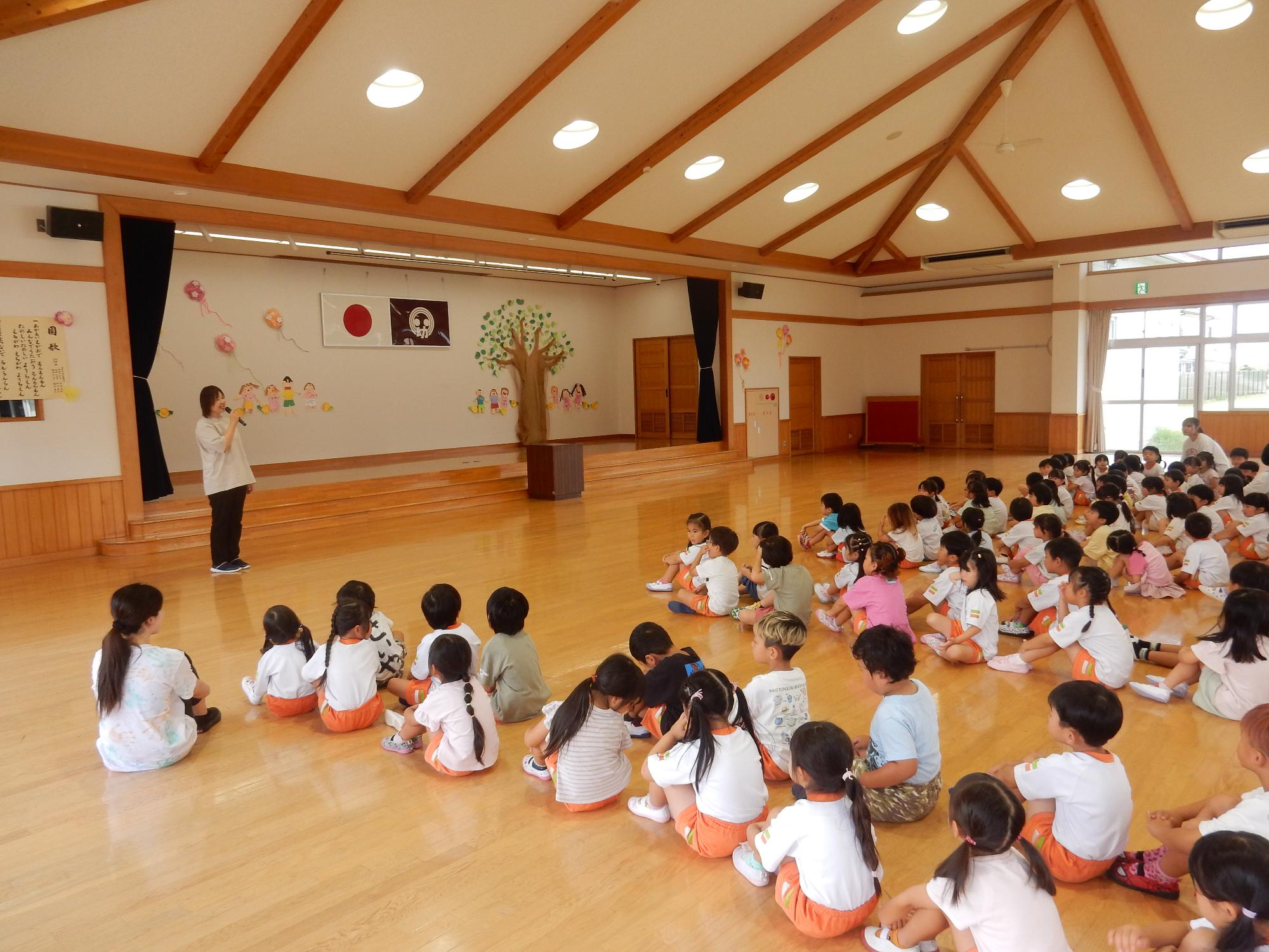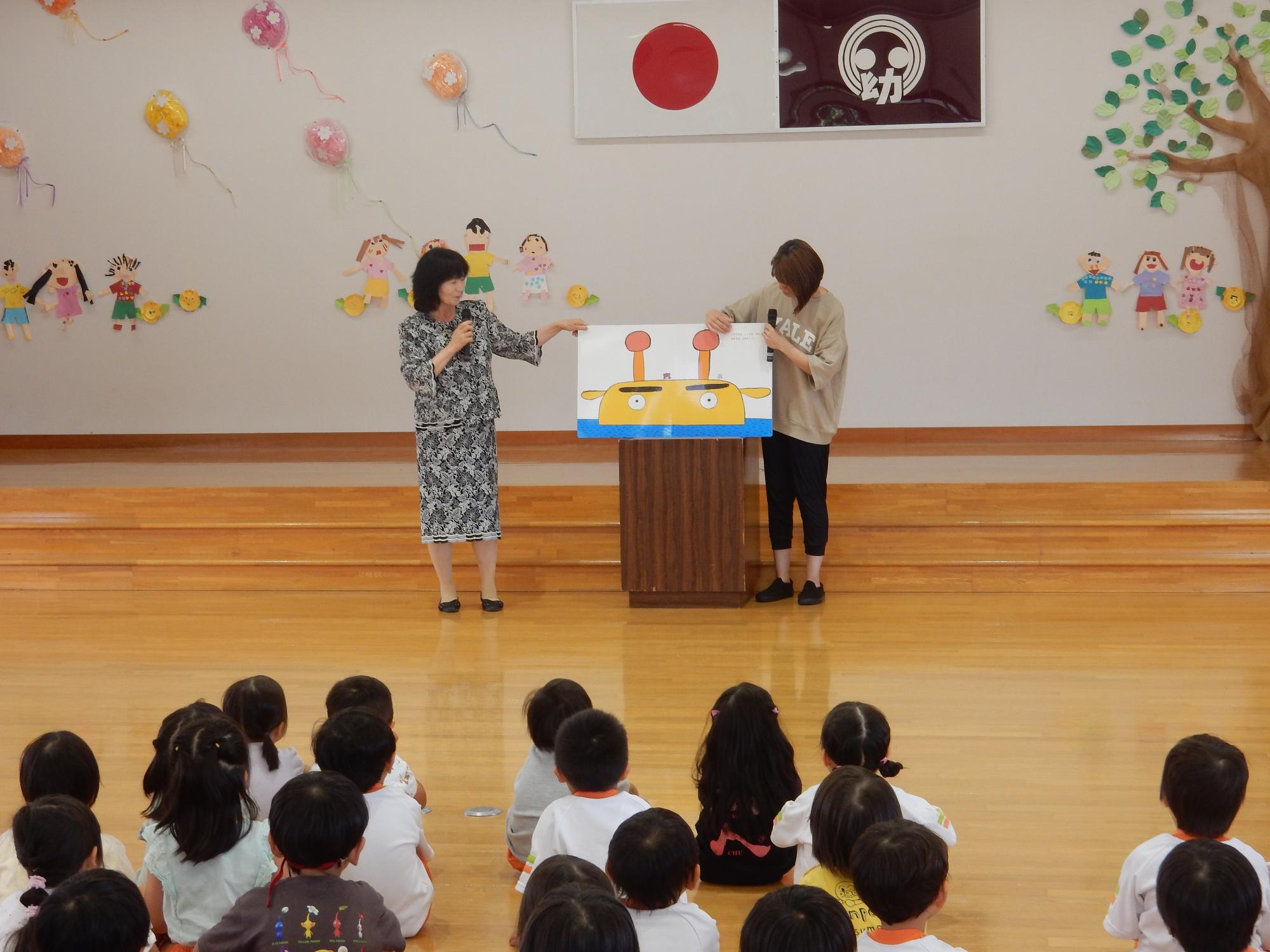 園長先生の話で1学期を振り返った後は、大型絵本「うみきりん」の読み聞かせがありました。