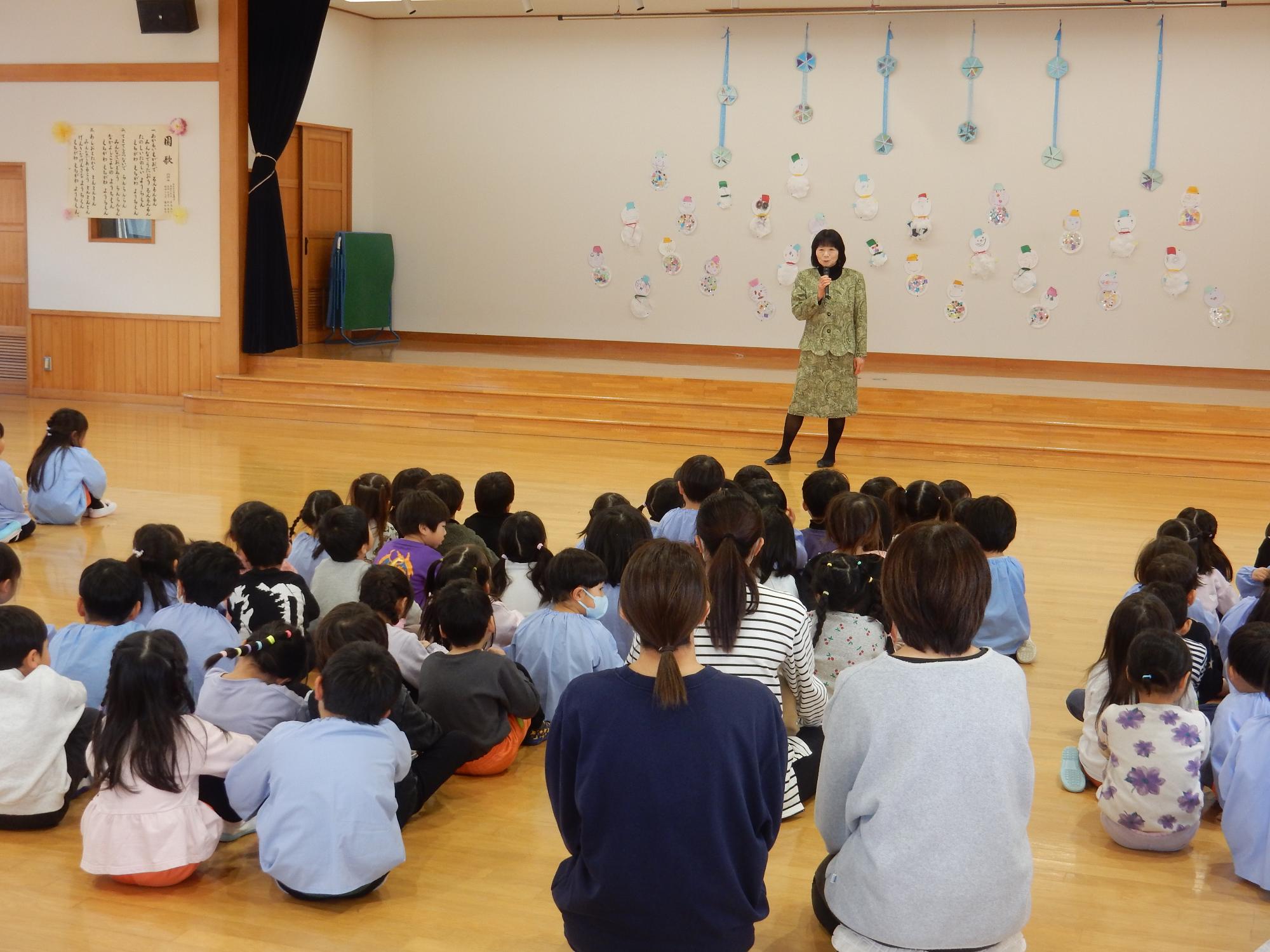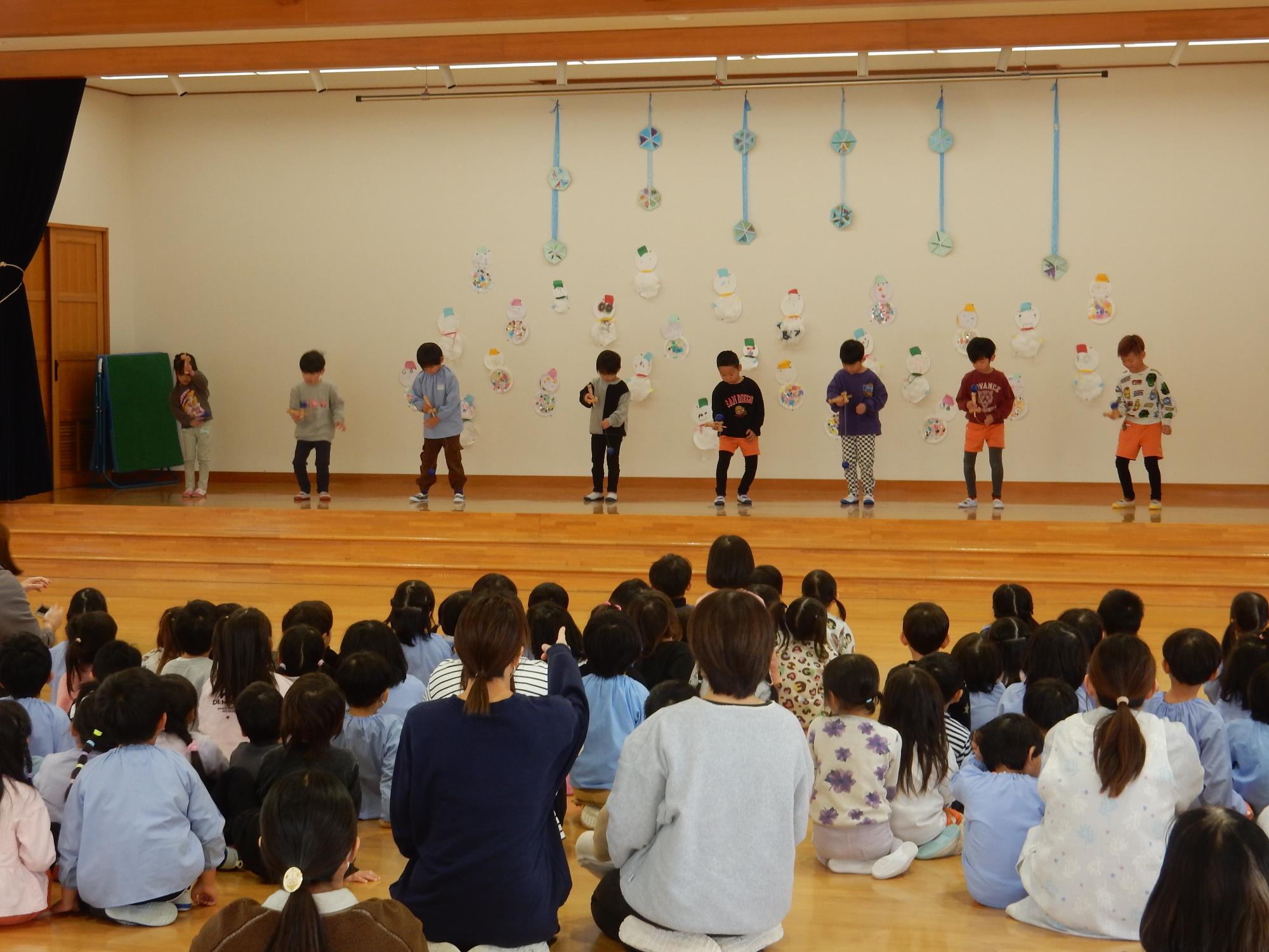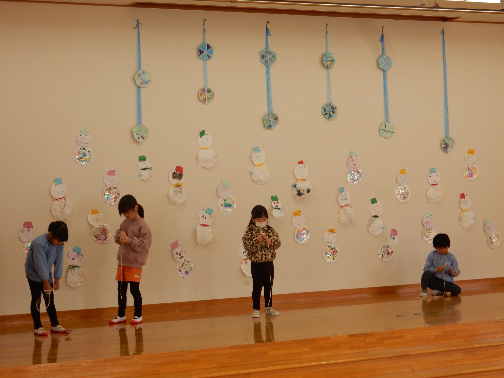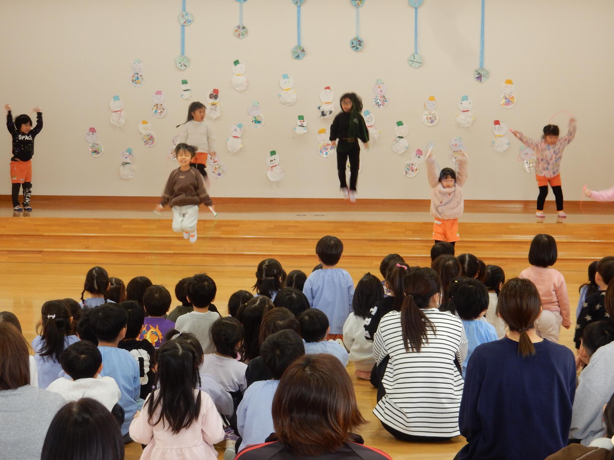 3学期始業式 更新日:2026年01月28日 1月7日に3学期の始業式を行いました。 園長先生から干支の話や冬休みの振り返り、新しい年に向けての話がありました。 その後、年長児が遊んでできるようになったけん玉やこま回し、縄跳び、鉄棒の発表をしてくれました。3学期も寒さに負けず、みんなで仲良く楽しく元気に過ごしましょうね♪