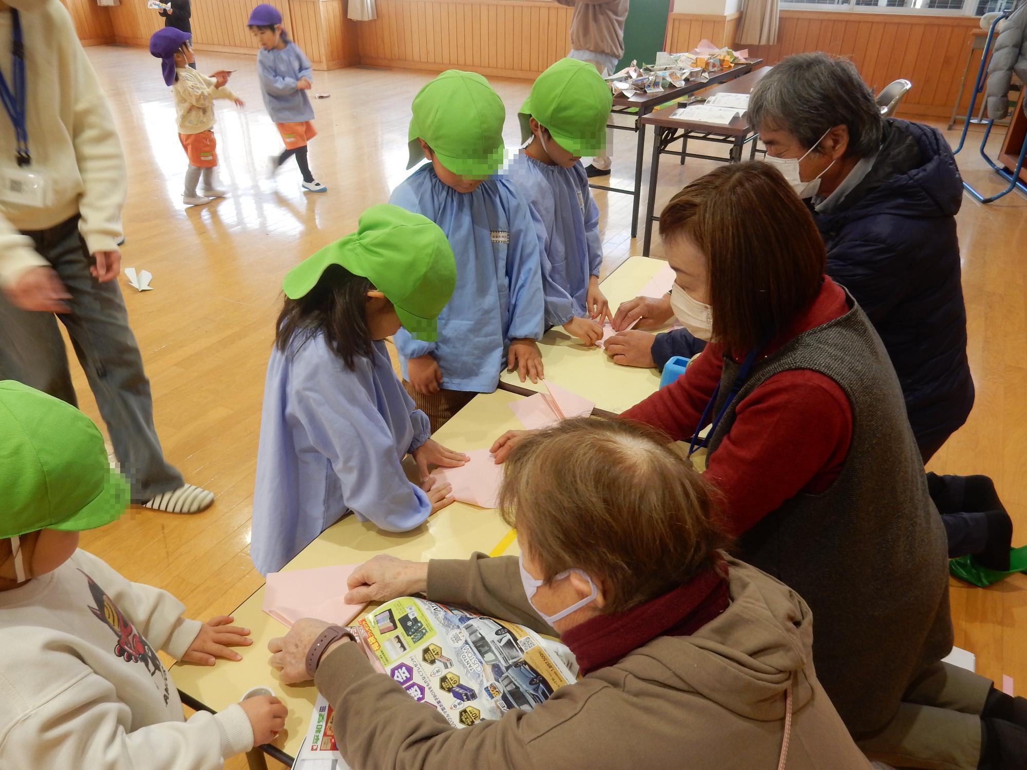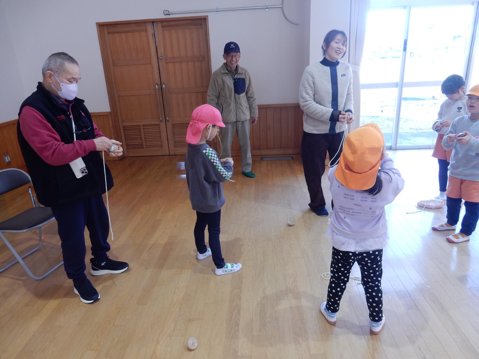 1月16日に年中・年長児を対象に運営協議会委員さんが中心となり昔の遊び体験をしました。年長児の祖父母の皆さんからもボランティアを募り、4名の方が参加してくださいました。