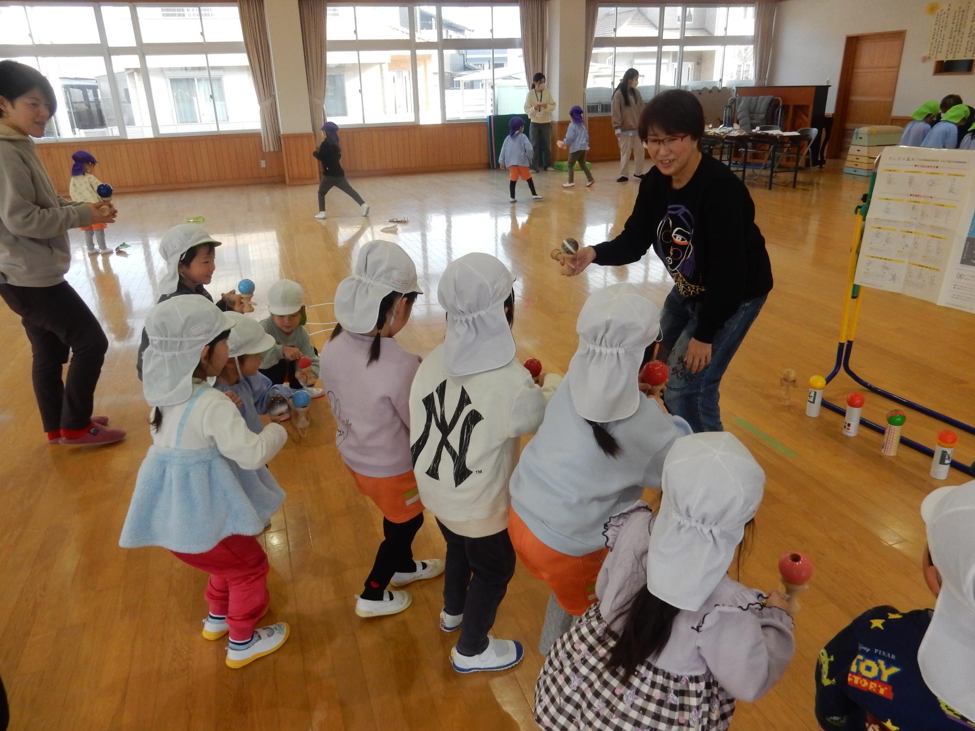 けん玉・こま・紙飛行機・お手玉の4つのコーナーで遊びました。普段あまり馴染みがないお手玉に親しんだり、広告紙で紙飛行機を作って飛ばしたり、けん玉やコマ回しのコツを教えてもらったりして大喜びの子ども達でした。