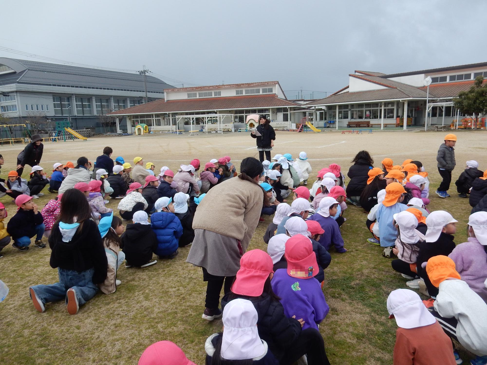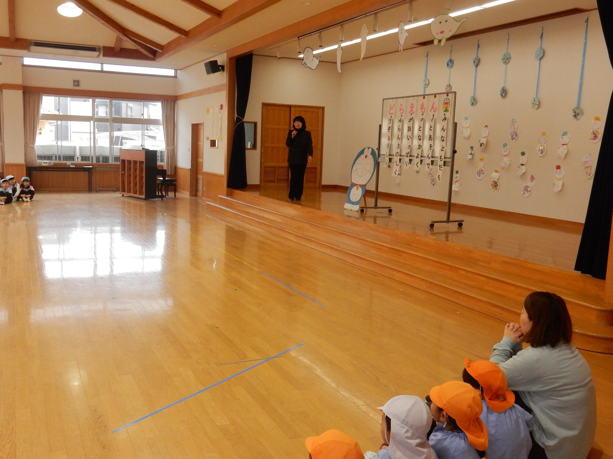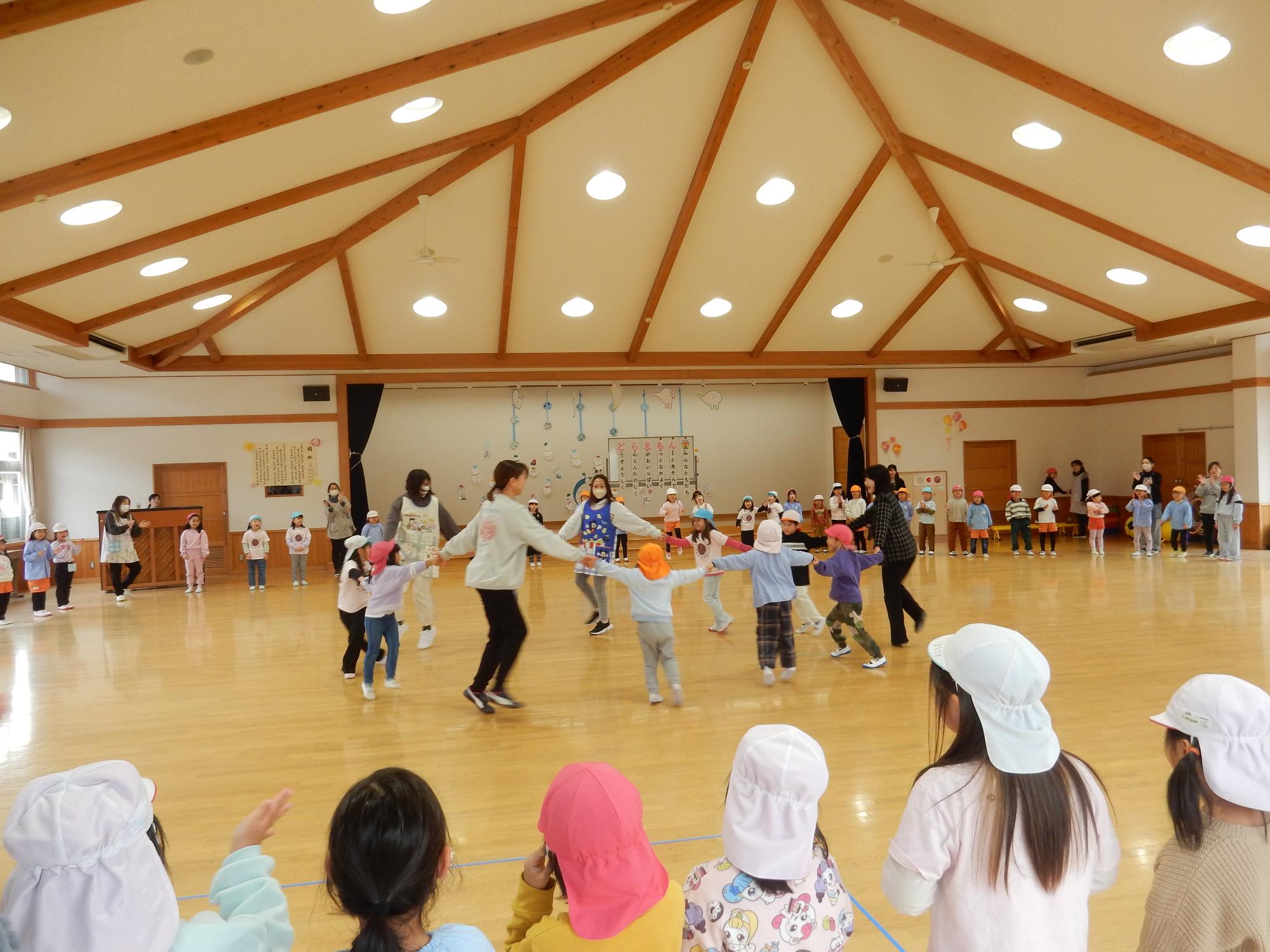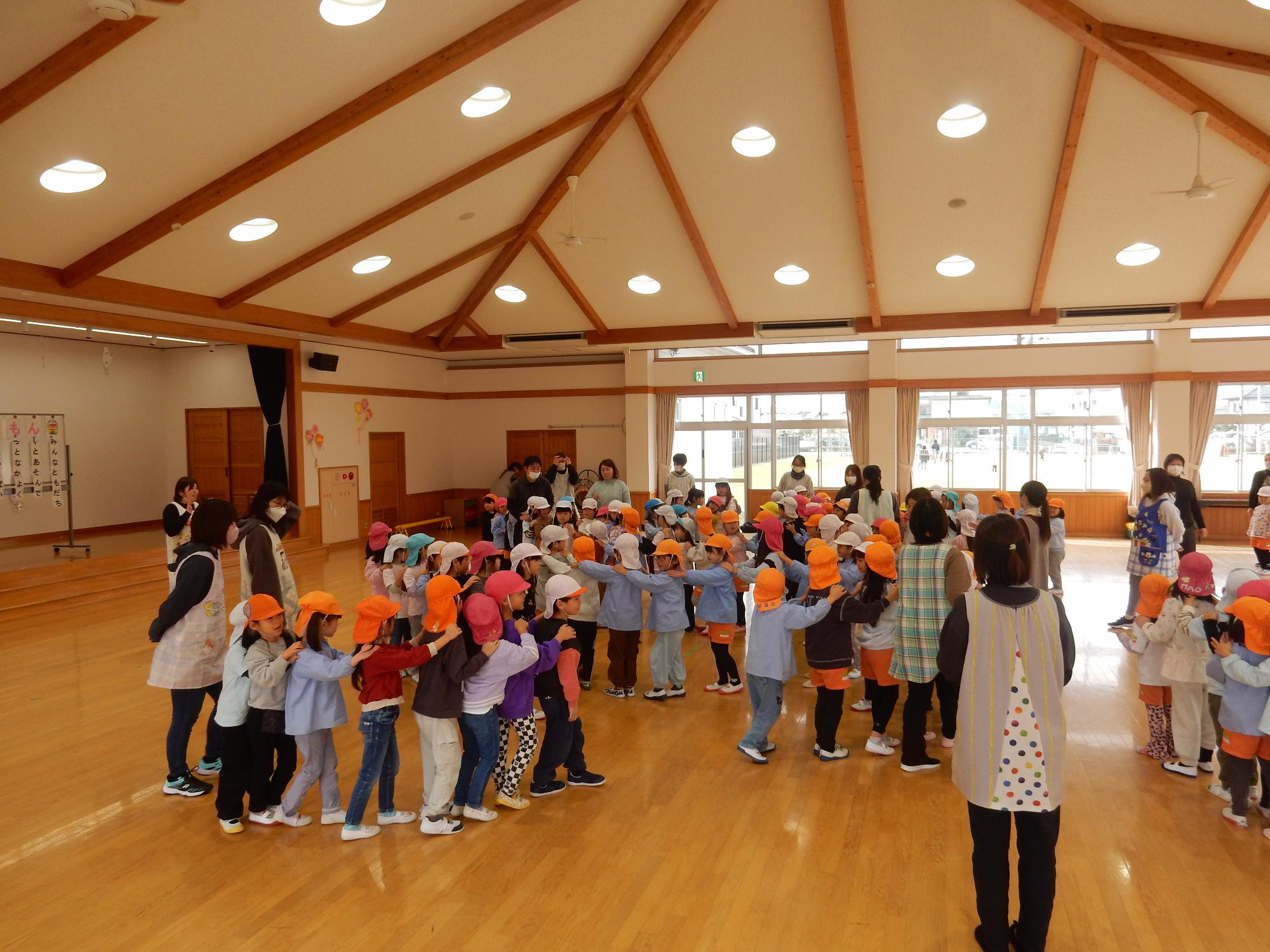 愛知川地区5歳児交流会 更新日:2026年01月28日 1月20日に愛知川小学校、愛知川東小学校に就学する保育園や幼稚園の子ども達が遊戯室に集まり、7園合わせて119人で交流をしました。園長先生の挨拶、各園の自己紹介後は「じゃんけん列車」などゲームをしたり園庭で遊んだりしました。遊びが進むごとに緊張がほぐれ、子ども達に笑顔が広がり、元気な声も響いていました。 最後は「4月になったらまた会おうね」と言ってお別れをしました。