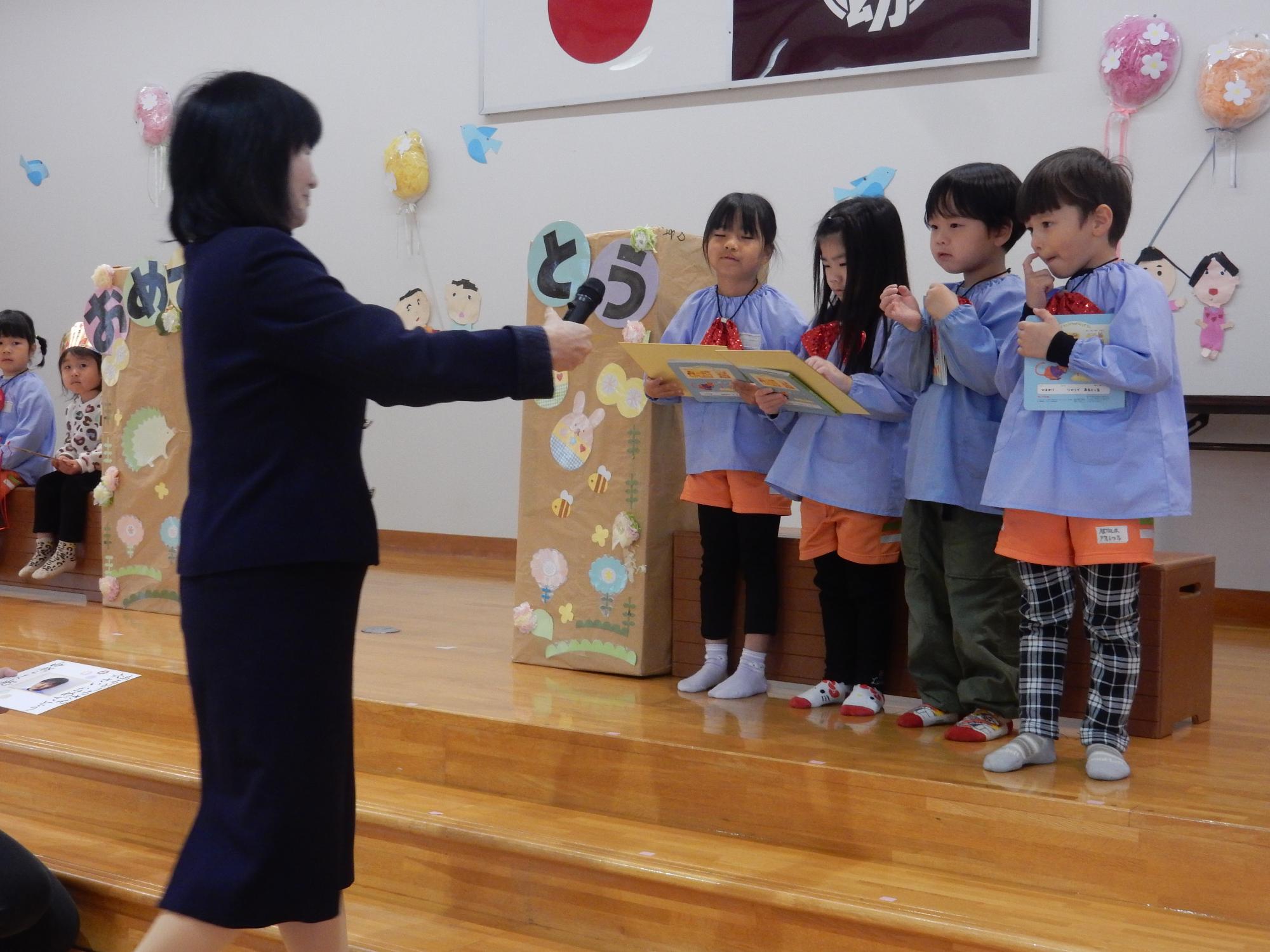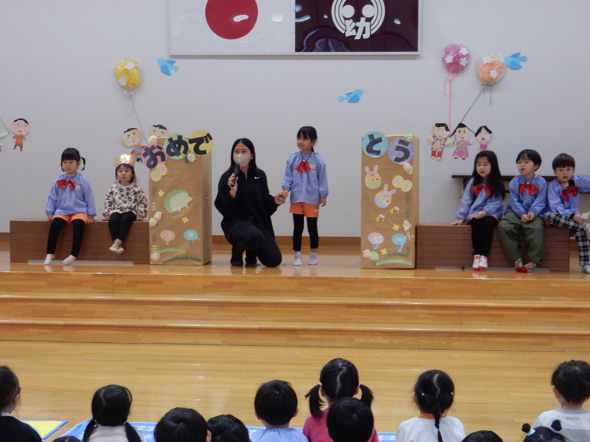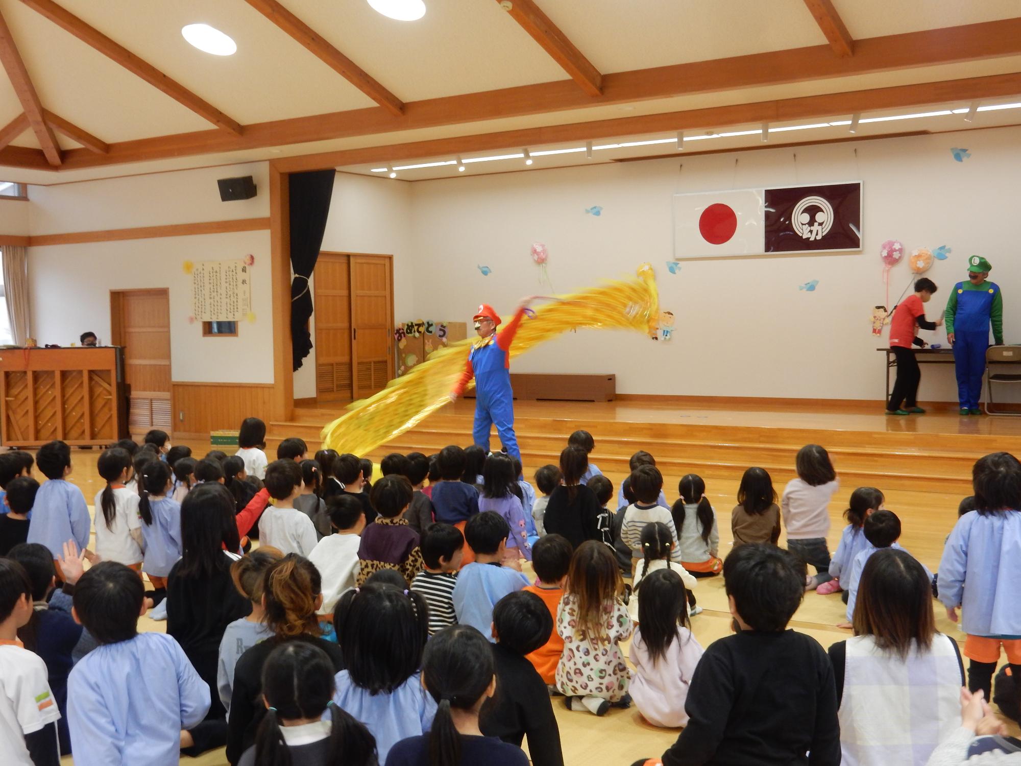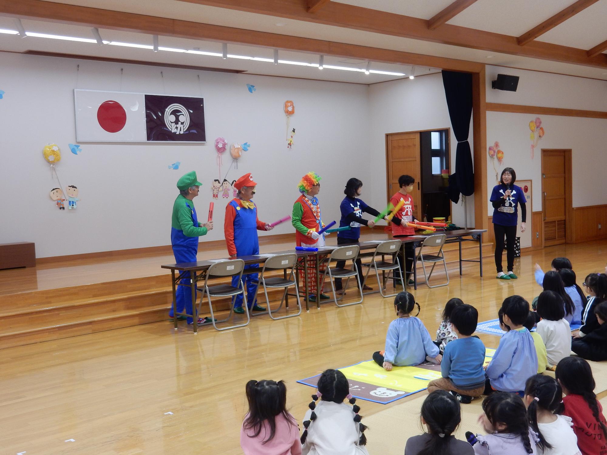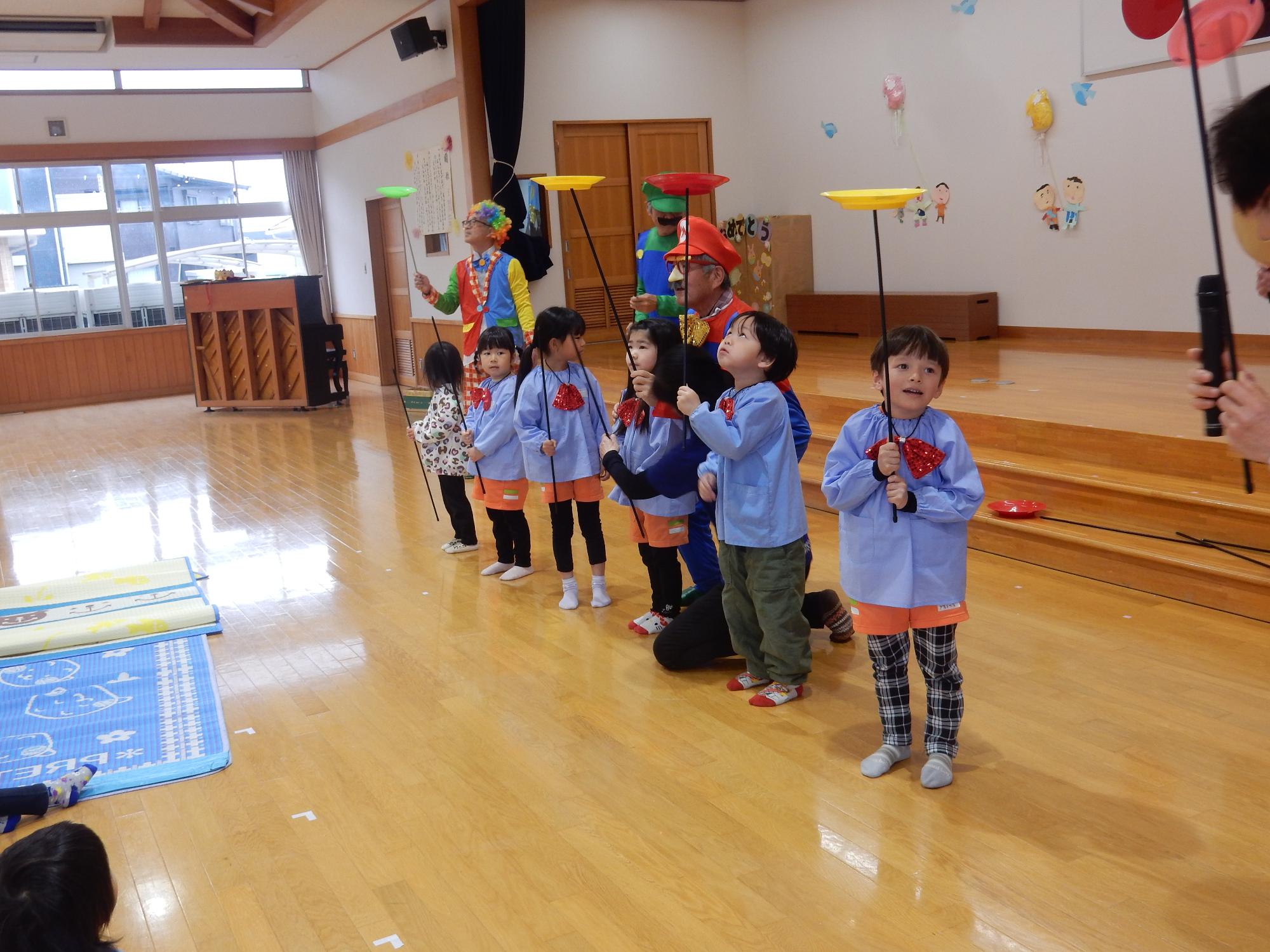 2月の誕生会を行いました。 更新日:2026年03月18日 2月25日に2月生まれの誕生日会がありました。一人ひとりのインタビュー、プレゼント渡しの後は愛荘町長野の「珍ジャグクラブ」さんによる大道芸を見せていただきました。技が成功すると「おぉ~」「すごい!」と歓声が上がりました。 また、誕生児は特別に皿回しの体験をさせていただきました。とても思い出に残る誕生会になりました。