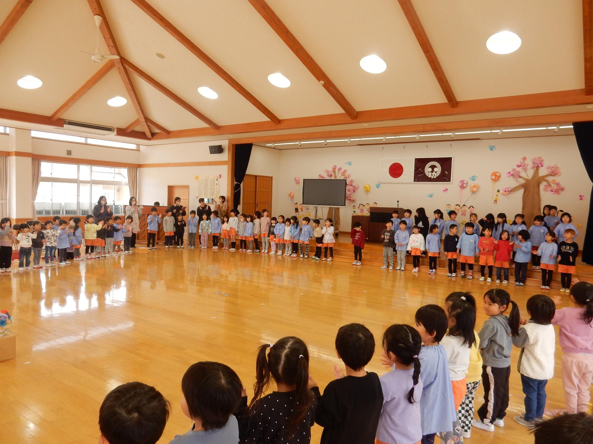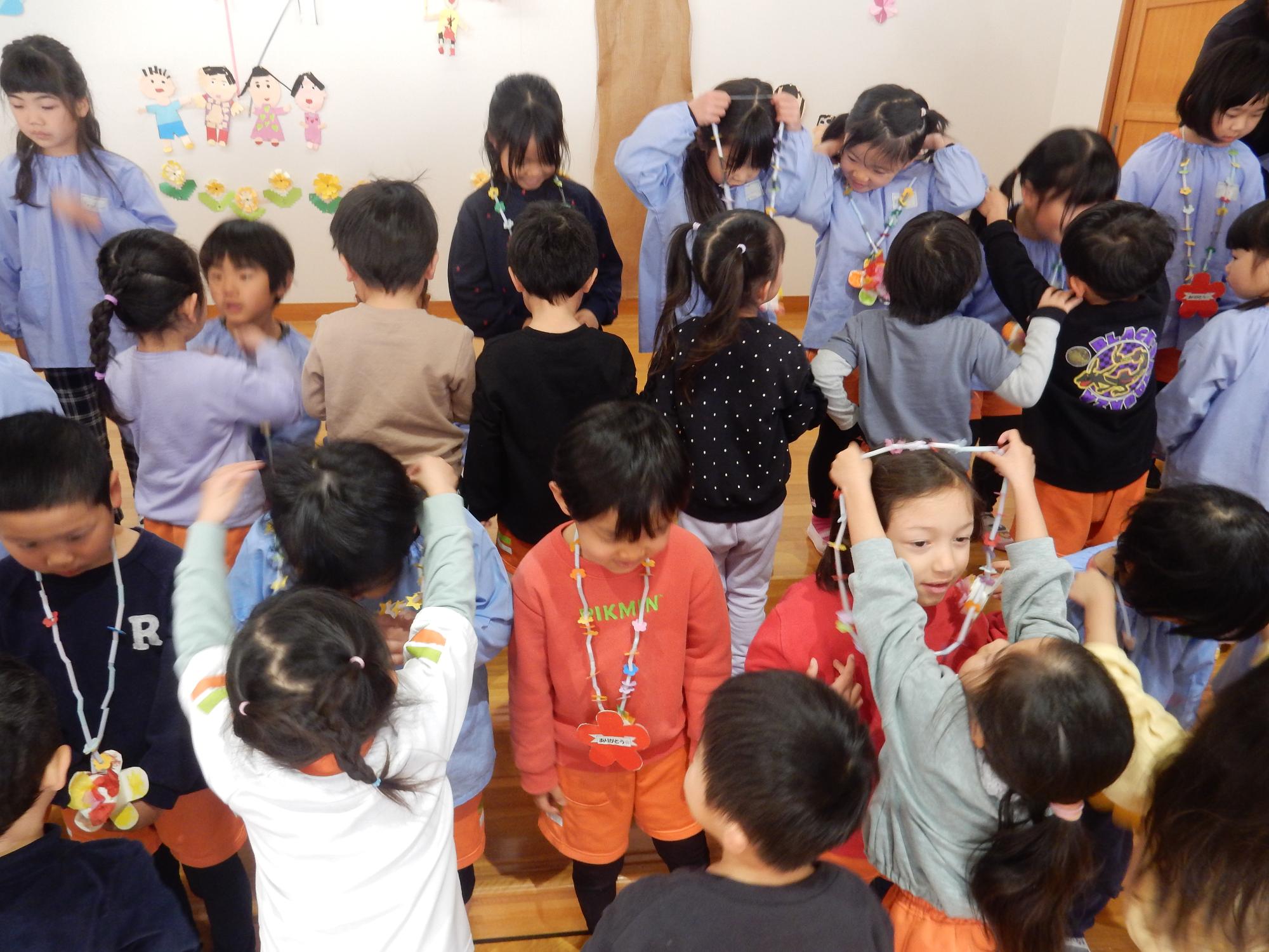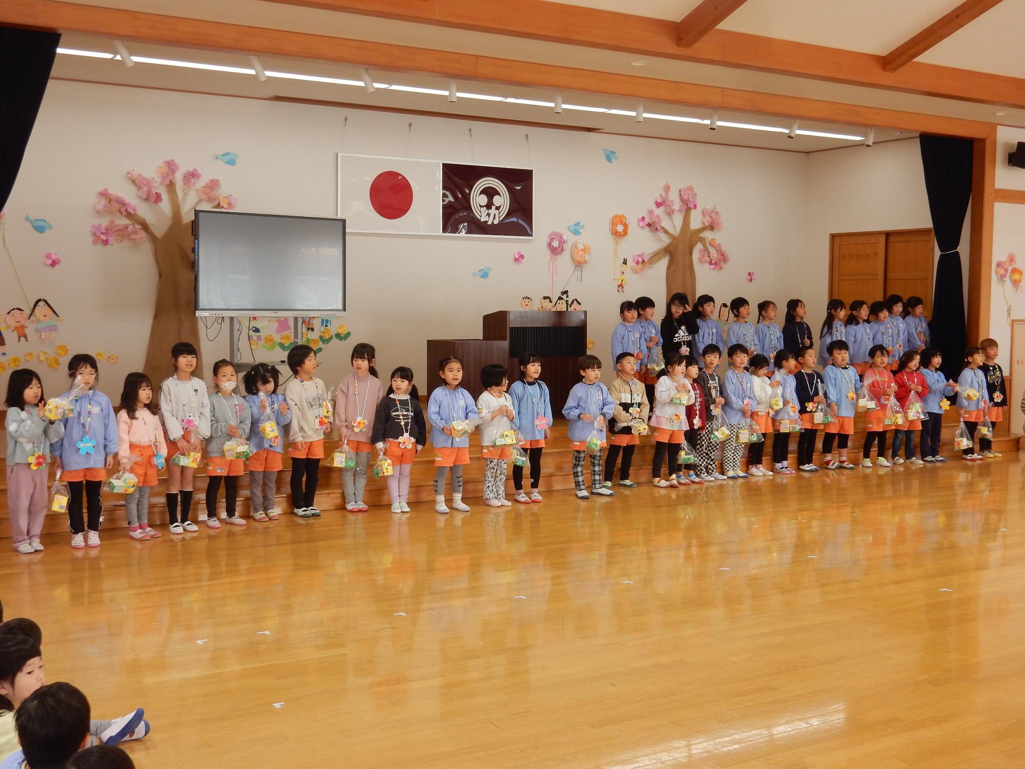 3月5日に年長組とのお別れ交流会がありました。年少組と年中組が「ありがとうの花」の歌やネックレス、ペン立てをプレゼントしました。笑顔いっぱいの年長組の子ども達でした♪年長組はお返しに「だいすきのしるし」の歌を歌いました♪