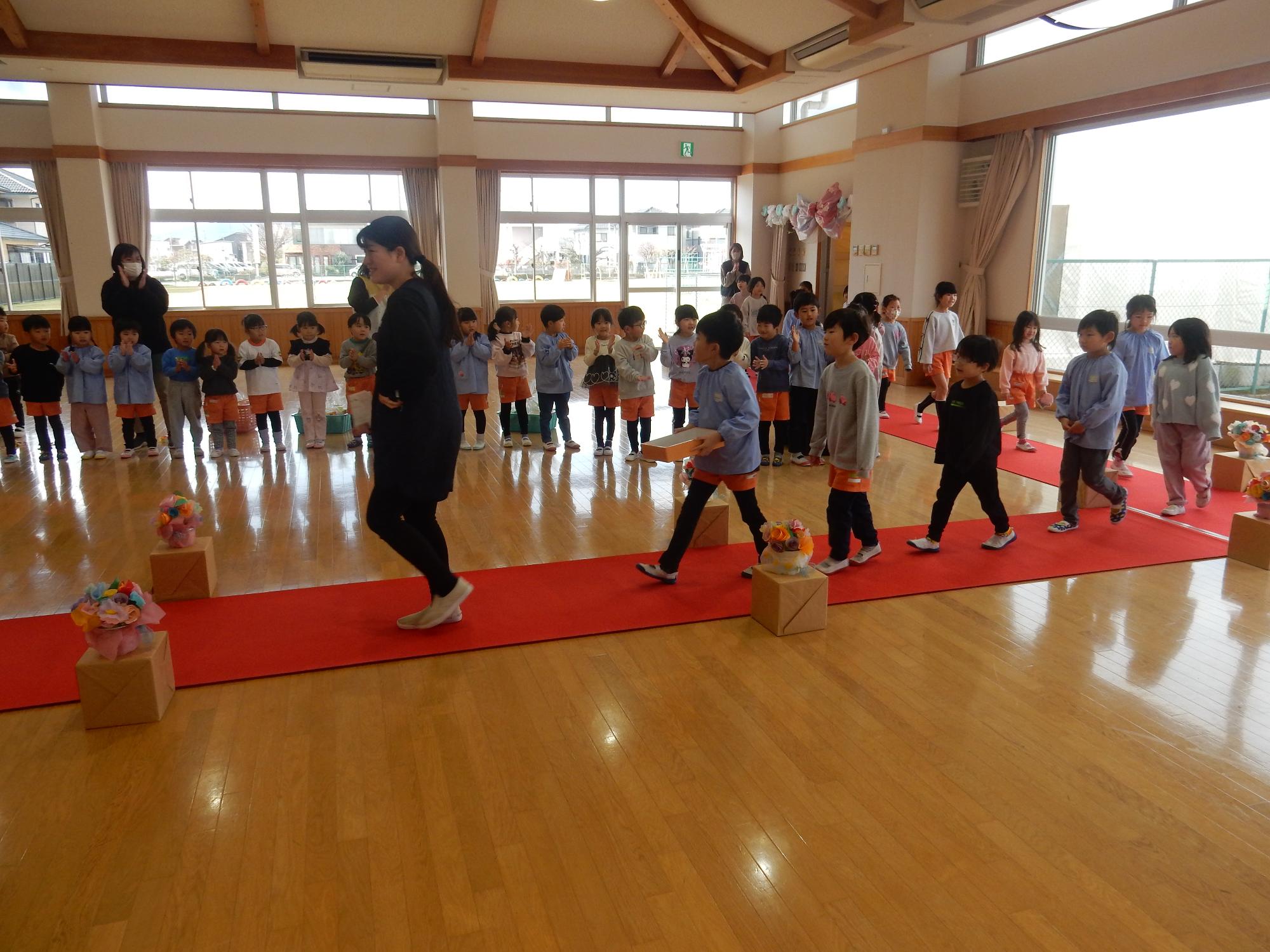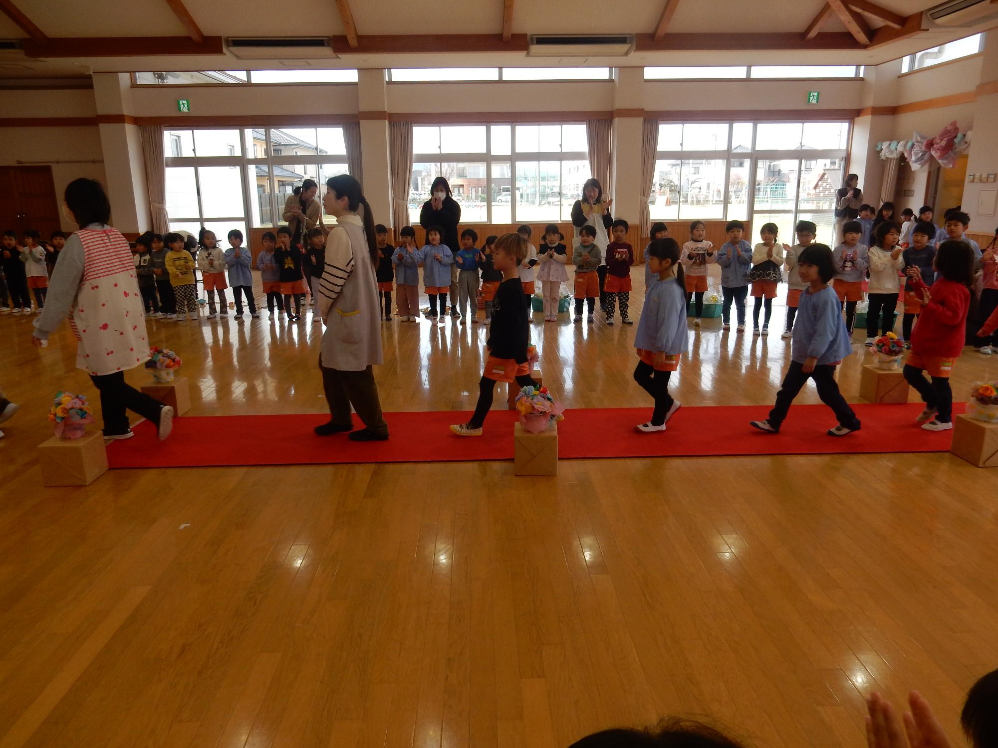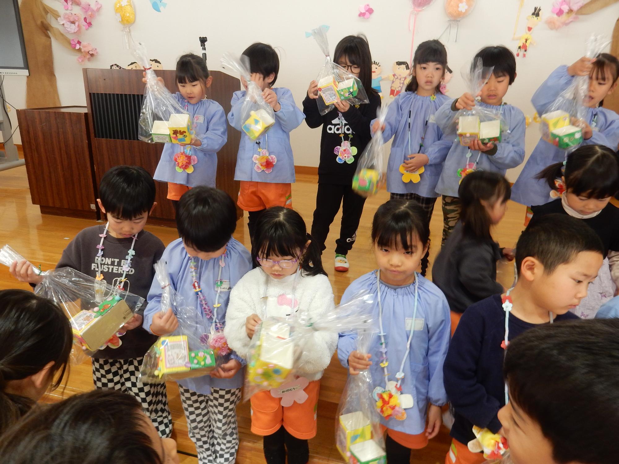 3月5日に年長組とのお別れ交流会がありました。年少組と年中組が「ありがとうの花」の歌やネックレス、ペン立てをプレゼントしました。笑顔いっぱいの年長組の子ども達でした♪年長組はお返しに「だいすきのしるし」の歌を歌いました♪