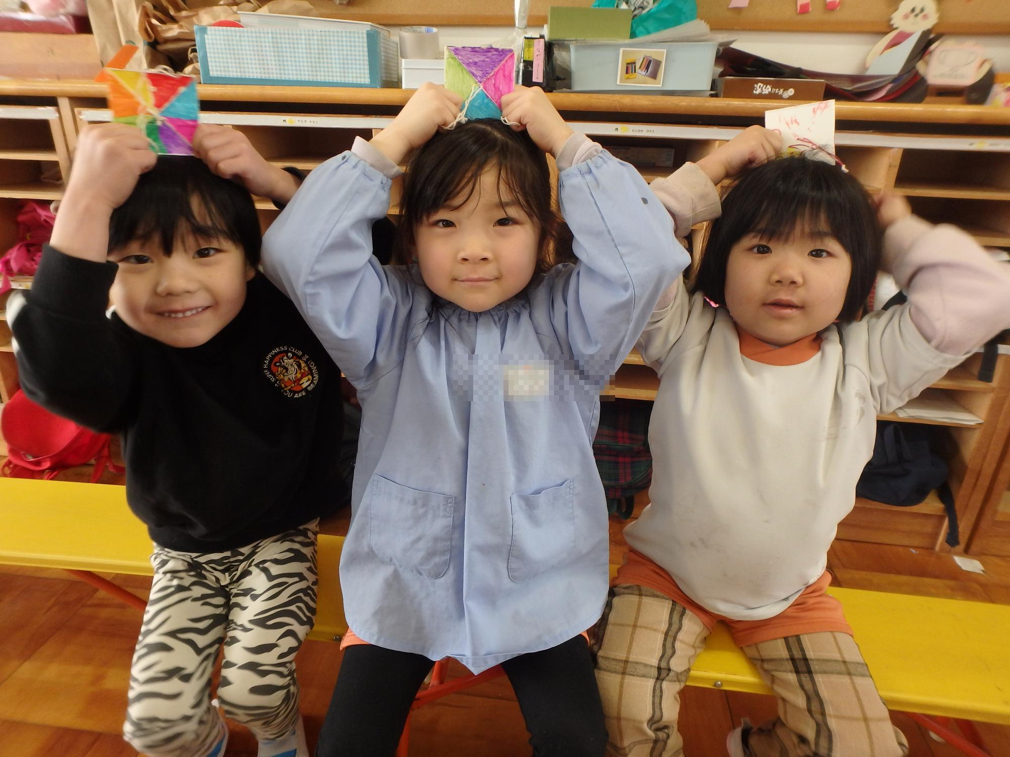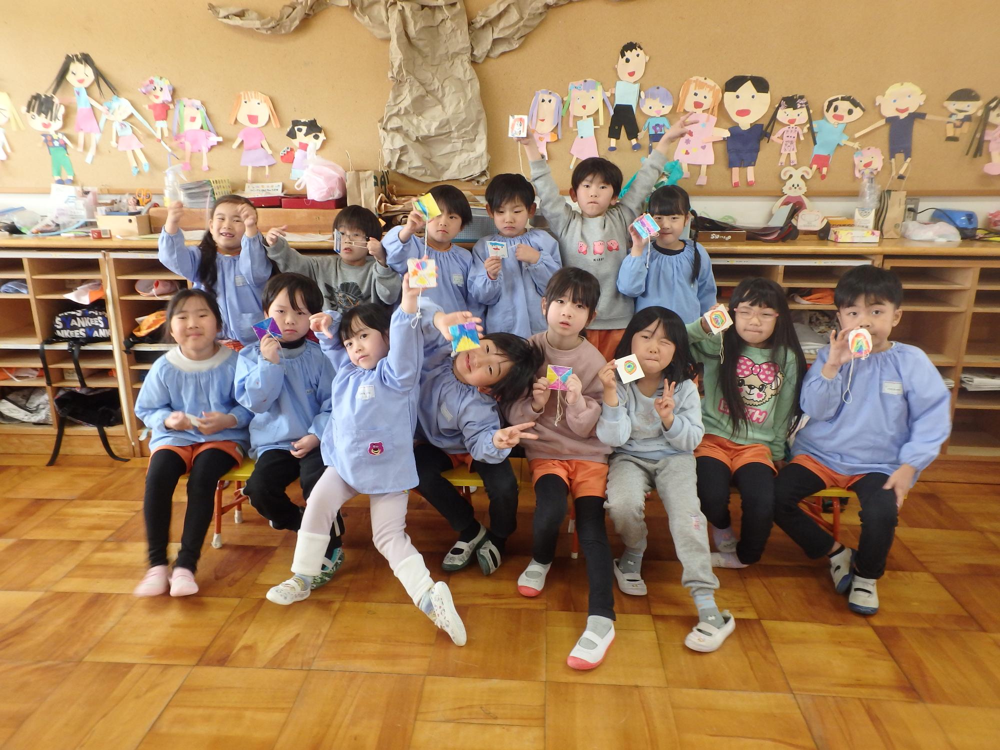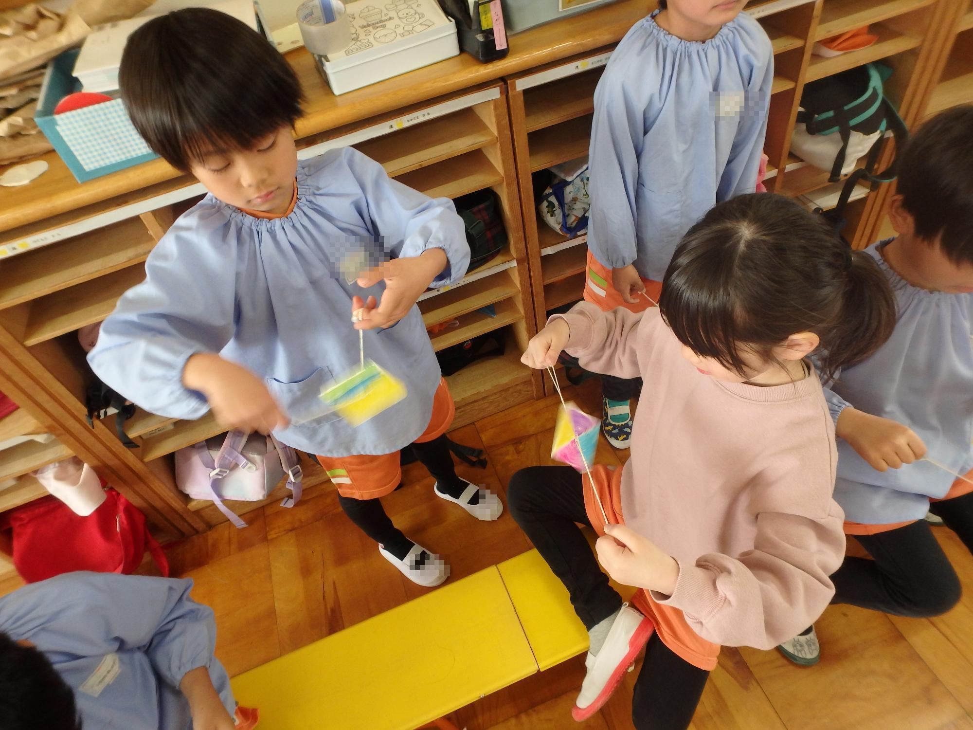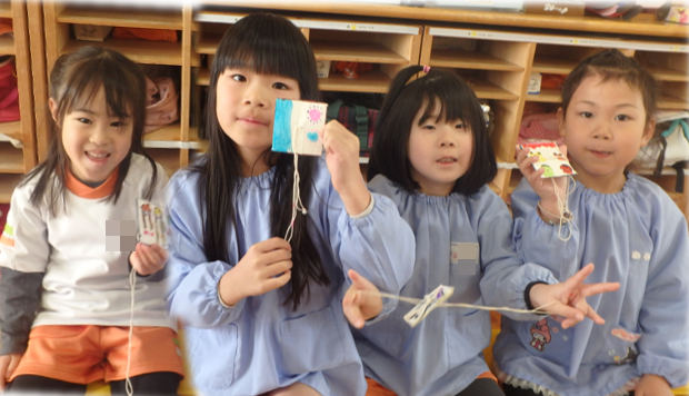 【ひまわり組】びゅんびゅんゴマで遊んだよ 更新日:2026年03月19日 びゅんびゅんゴマ作りを楽しみました。自分で色を塗り、勢いよく引っ張ると「びゅーん!」と音を立てながら回ります。最初はなかなか回らず苦戦する姿もありましたが、何度も挑戦するうちにコツをつかみ、「見て!回ったよ!」「音が鳴った!」と嬉しそうに友達と見せ合っていました。友達と教え合ったり、応援し合ったりしながら遊ぶ姿に、子ども達の成長を感じる心温まる時間となりました。