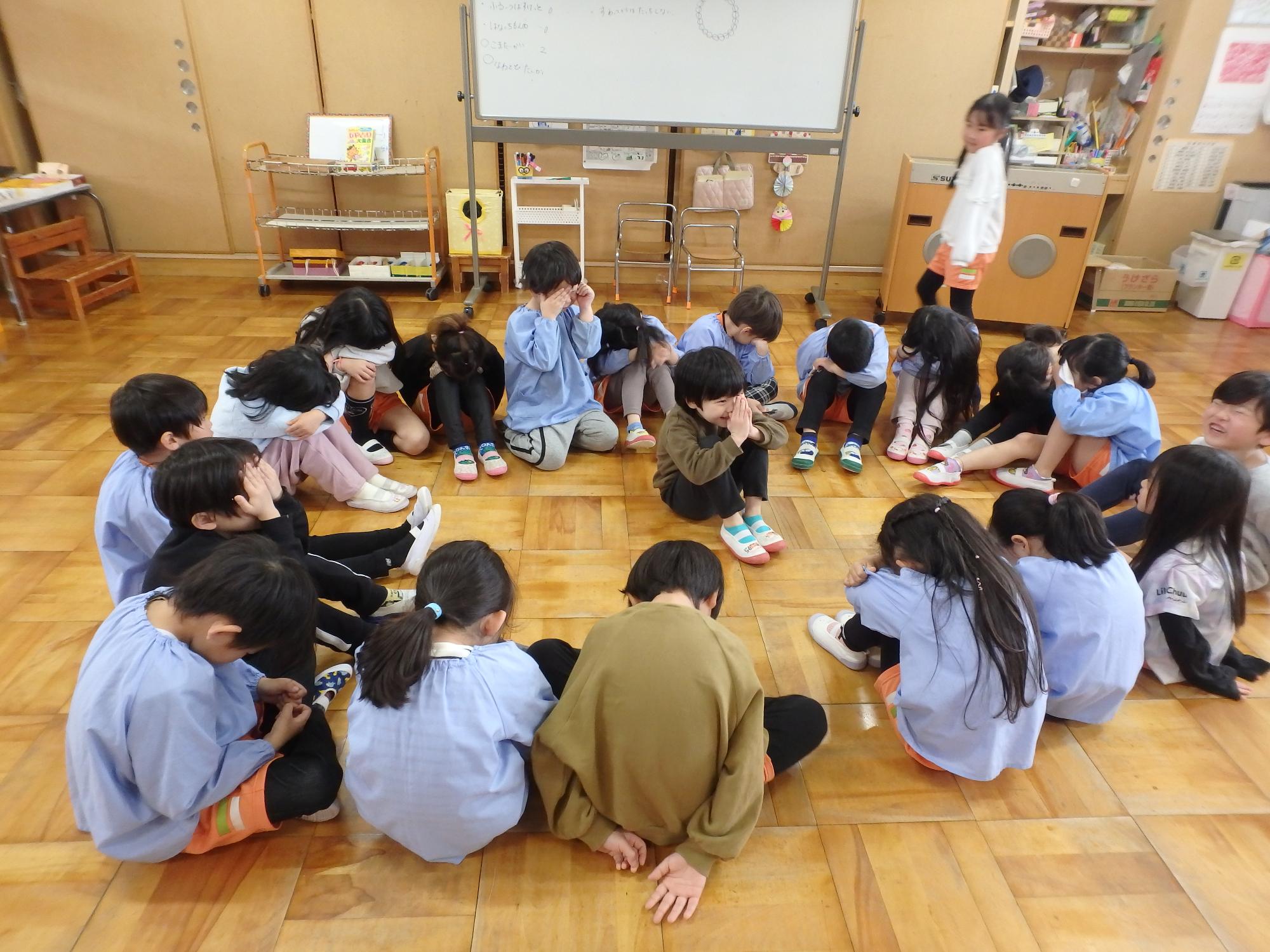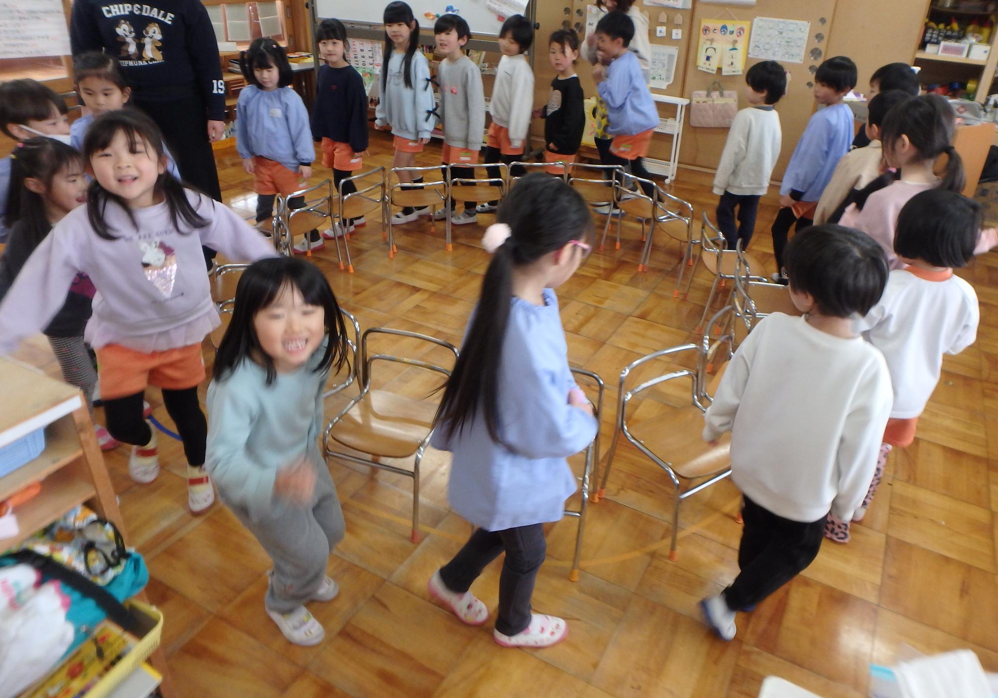 子ども達が、「これしたい!」と遊びを決め、みんなで楽しむ時間を作りました。椅子取りゲームやハンカチ落とし、なんでもバスケットなどの集団遊びを行い、ルールを守りながら友達と一緒に遊ぶ中で、笑い声がたくさん聞けました。