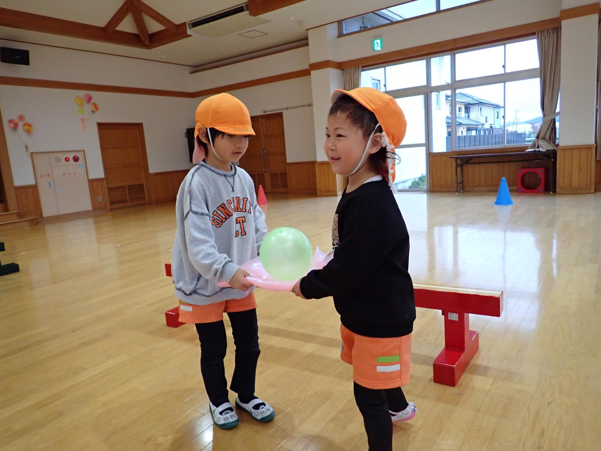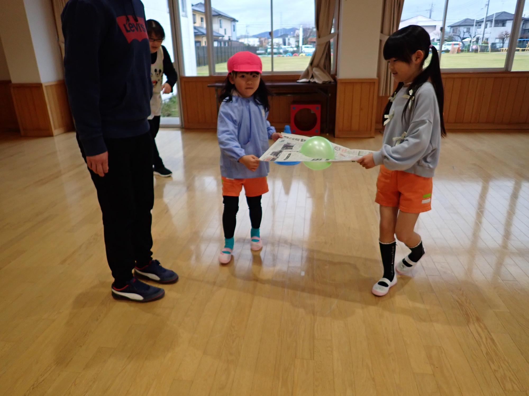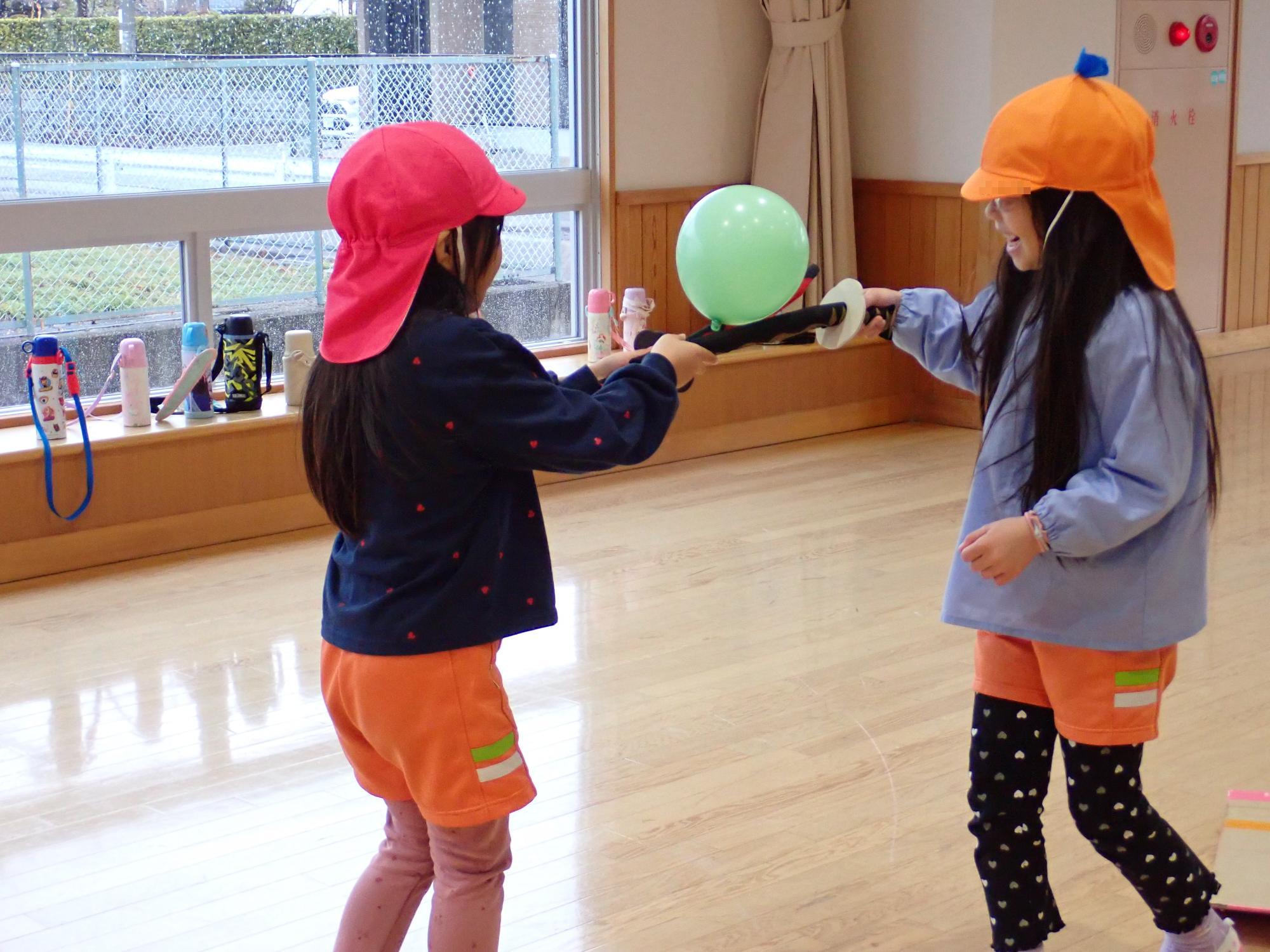 みんなで遊んだよ!【年長組】 更新日:2026年03月26日 雨天のためお別れ遠足は中止となりましたが、遊戯室でいろいろなゲームをして遊びました。猛獣狩りや風船運びリレー、ドッジボールとたくさんの遊びを満喫した子ども達です。