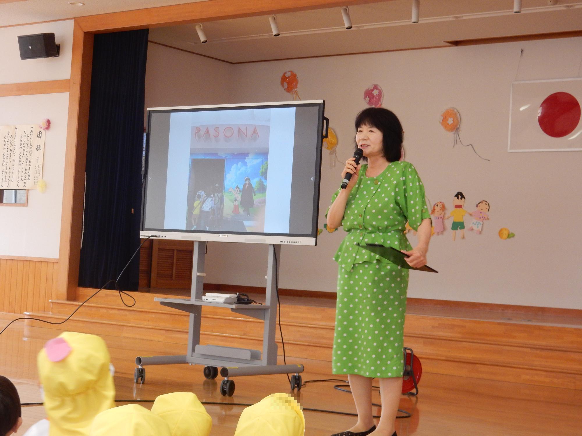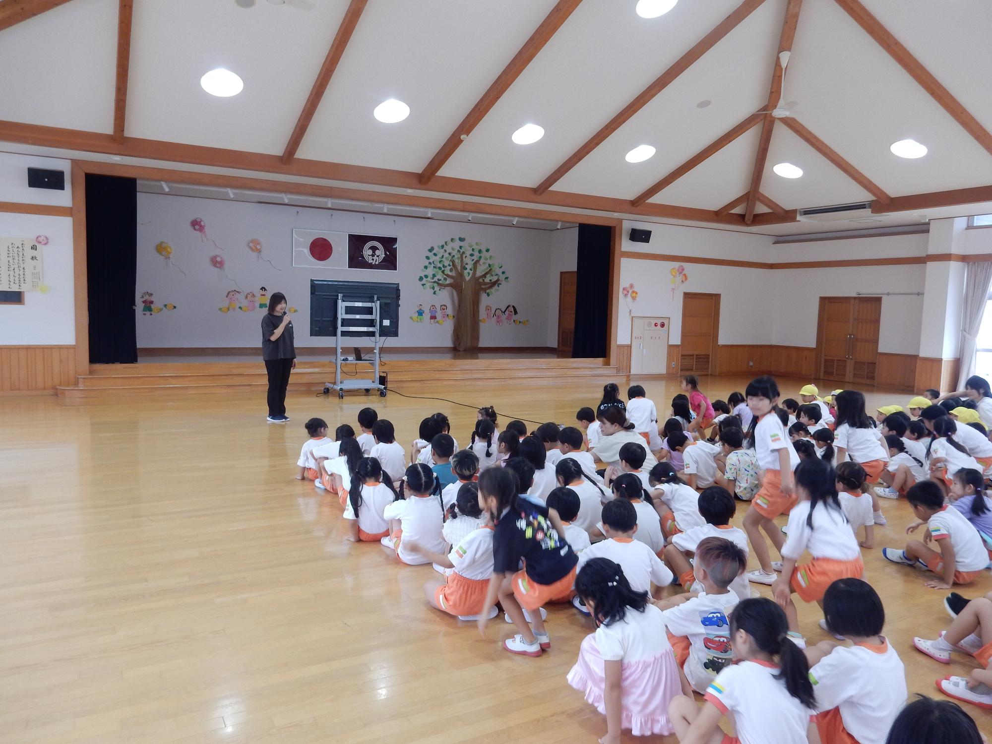 始業式では夏休みの思い出で、園長先生が行かれた関西大阪万博の動画を見ながらお話をしてくださいました。「僕も行ったよ」「映像がすごくキレイ」などたくさんの声を聞くことができました。