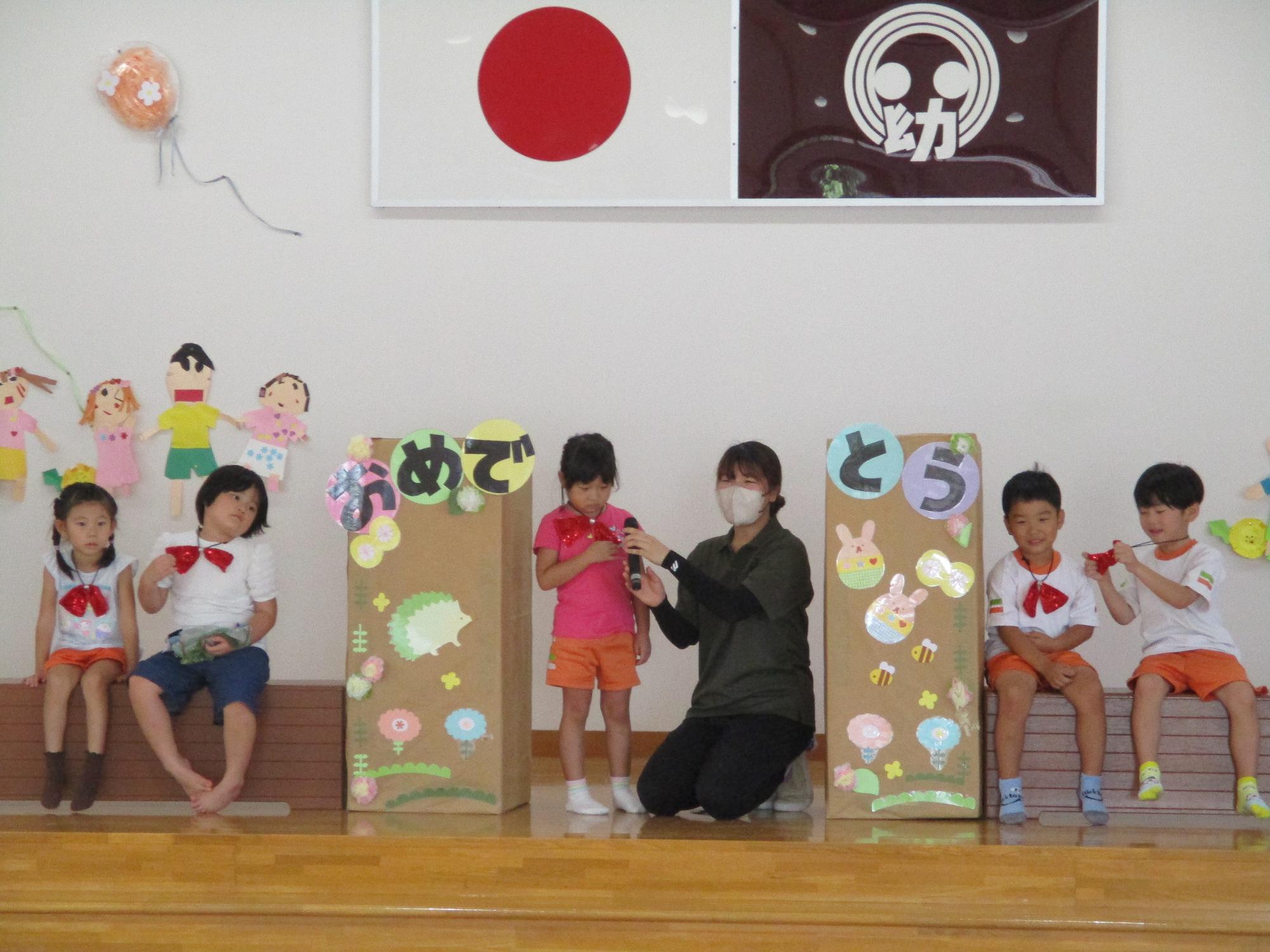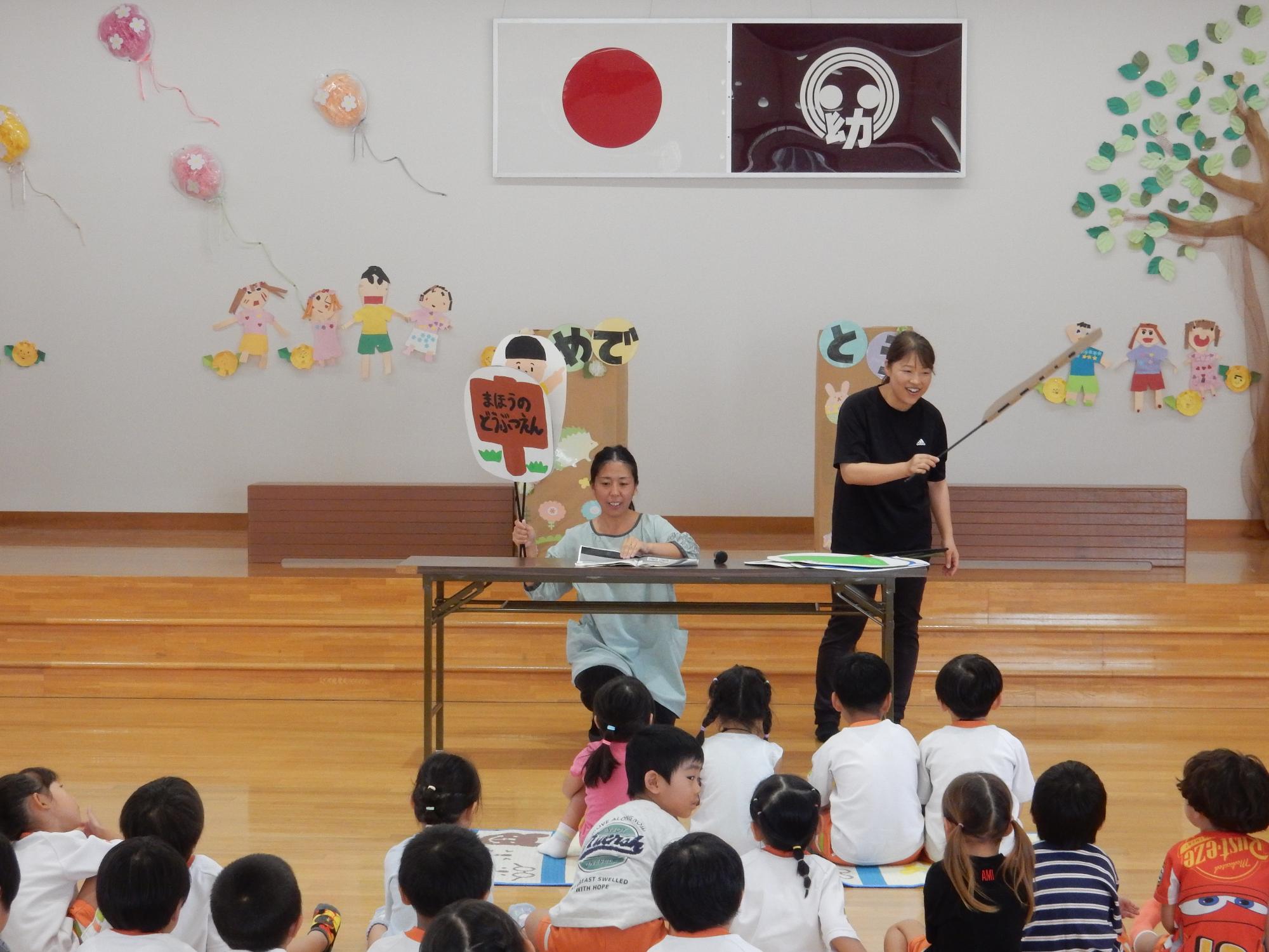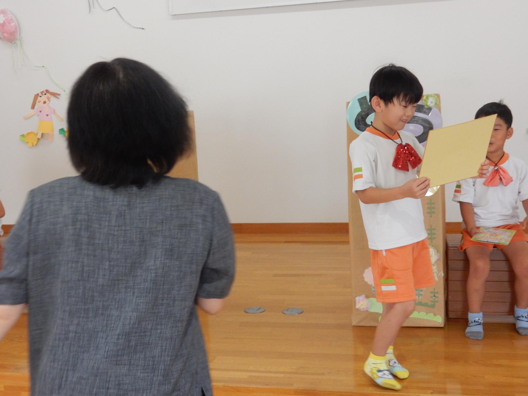9月1日に8月生まれの誕生会がありました。一人ひとりのインタビュー、プレゼント渡しの後は年中組の先生からのペープサート「まほうのどうぶつえん」の出し物を見ました。魔法をかけると何でも動物に変身しちゃう楽しいお話でした♪
