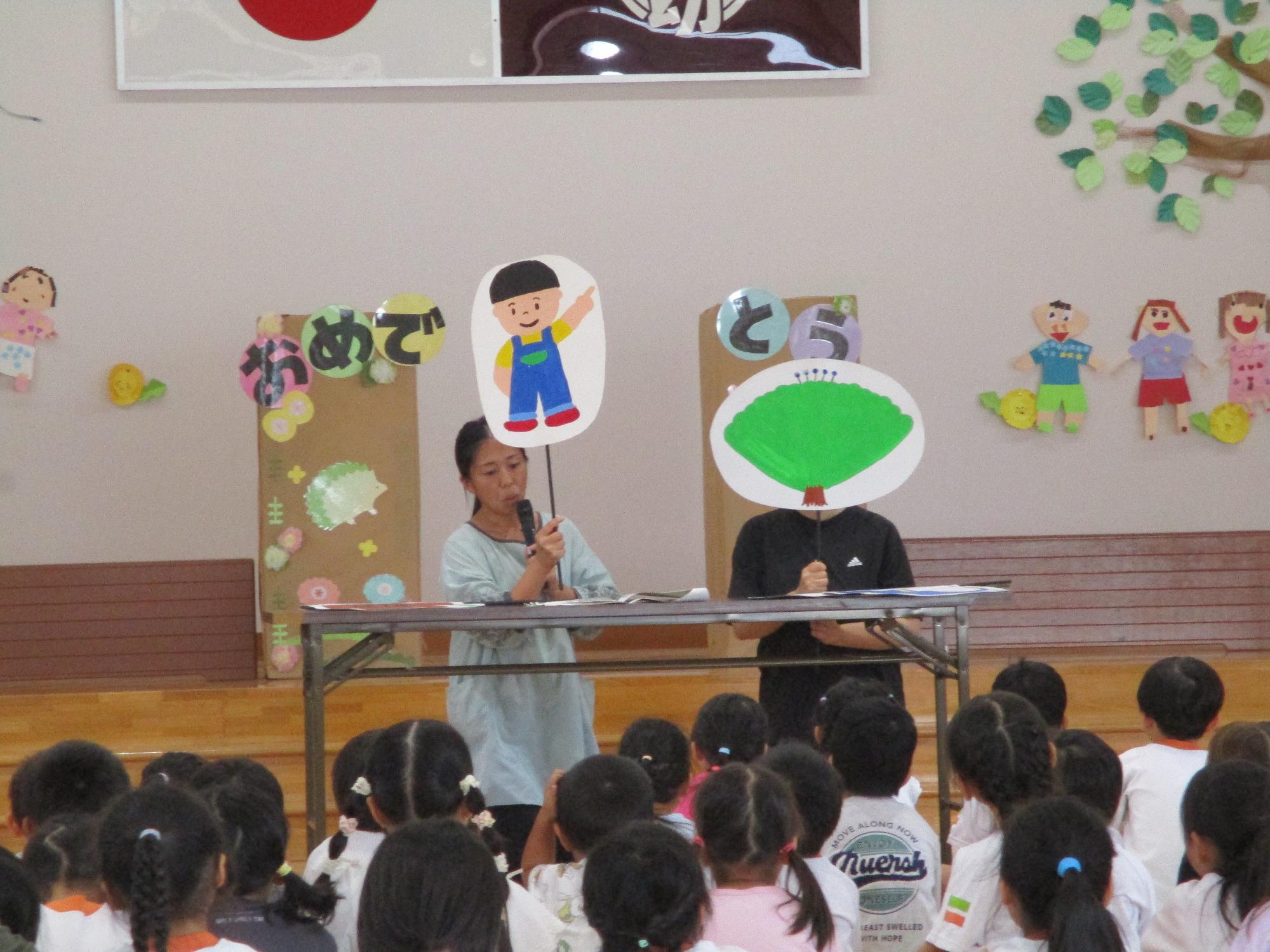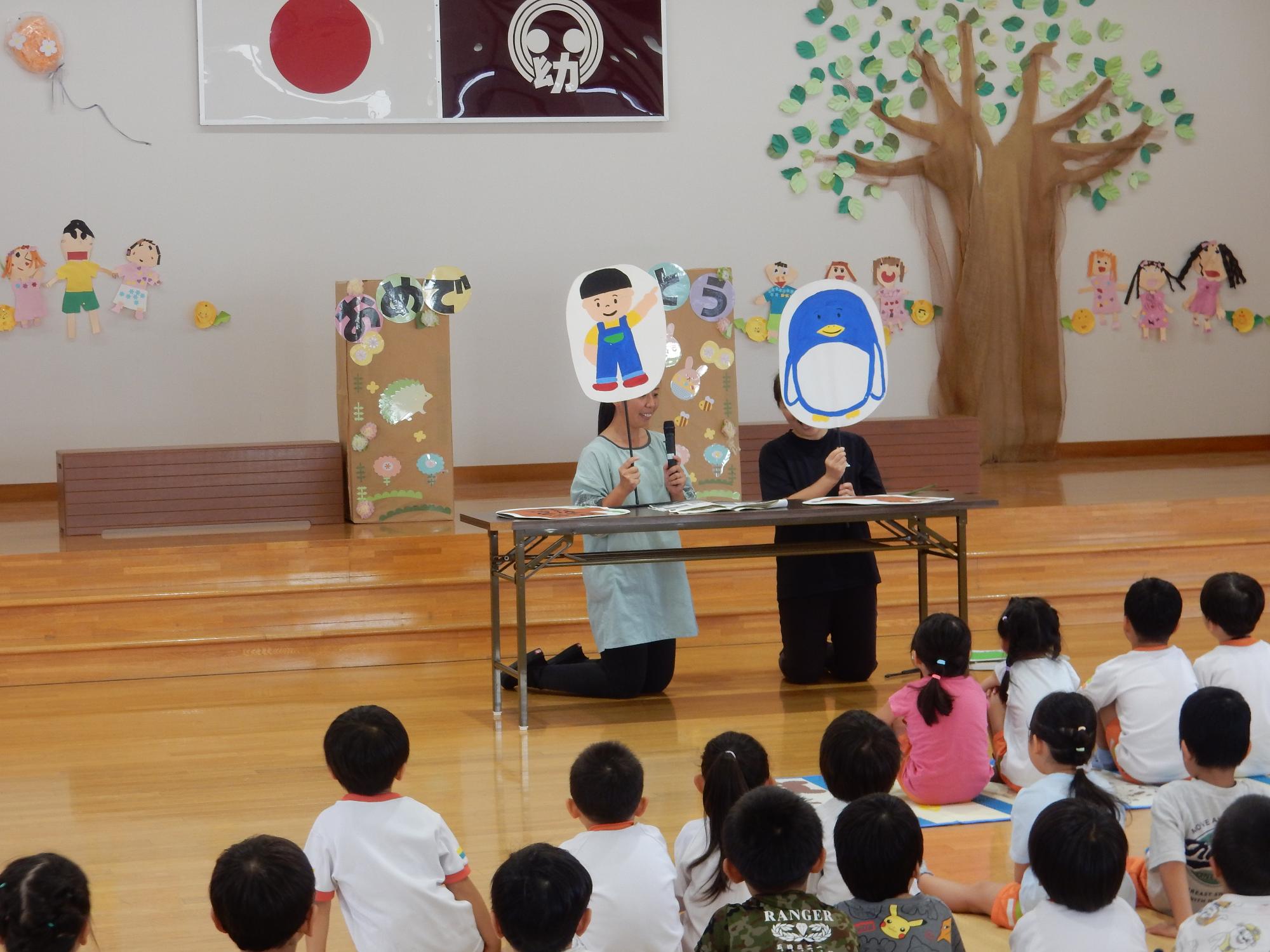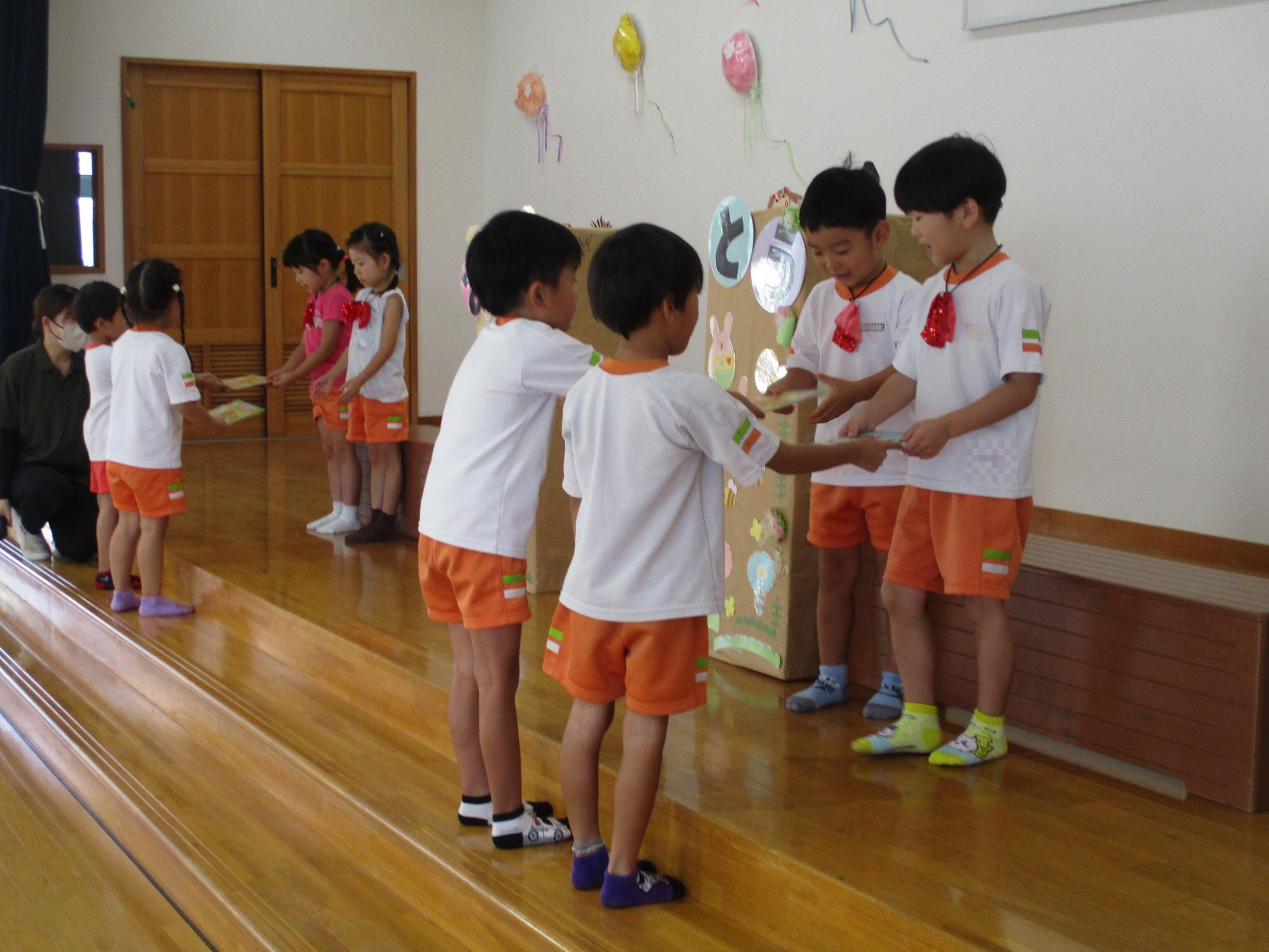 9月1日に8月生まれの誕生会がありました。一人ひとりのインタビュー、プレゼント渡しの後は年中組の先生からのペープサート「まほうのどうぶつえん」の出し物を見ました。魔法をかけると何でも動物に変身しちゃう楽しいお話でした♪