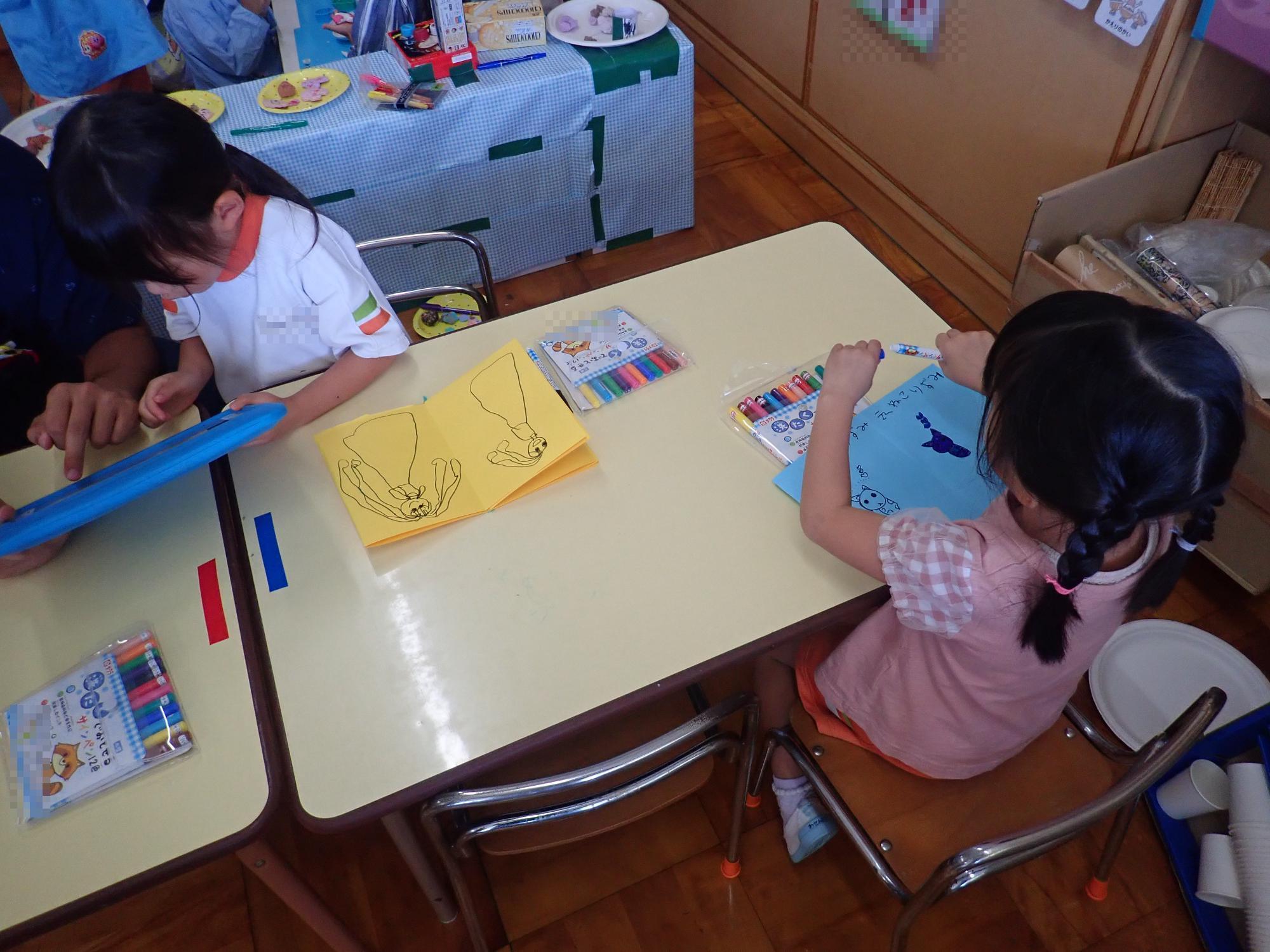 また、粘土遊びが好きな子ども達によるクッキー屋さん、絵を描くのが好きな子ども達による絵本屋さんなど、思い思いに遊びを進め、友達と協力して遊ぶ姿も見られるようになってきました。