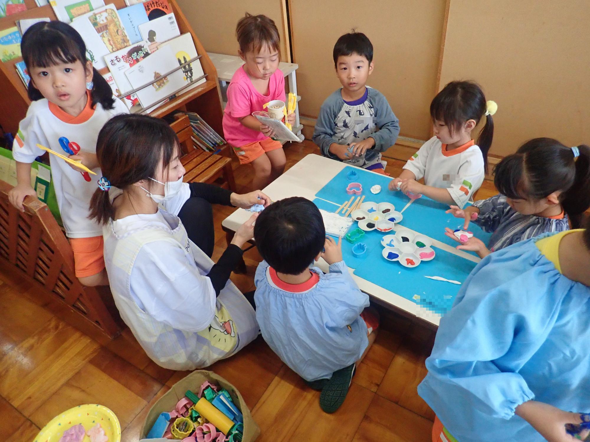 運動会の練習の合間に子ども達と保育室で遊びを進めています。
