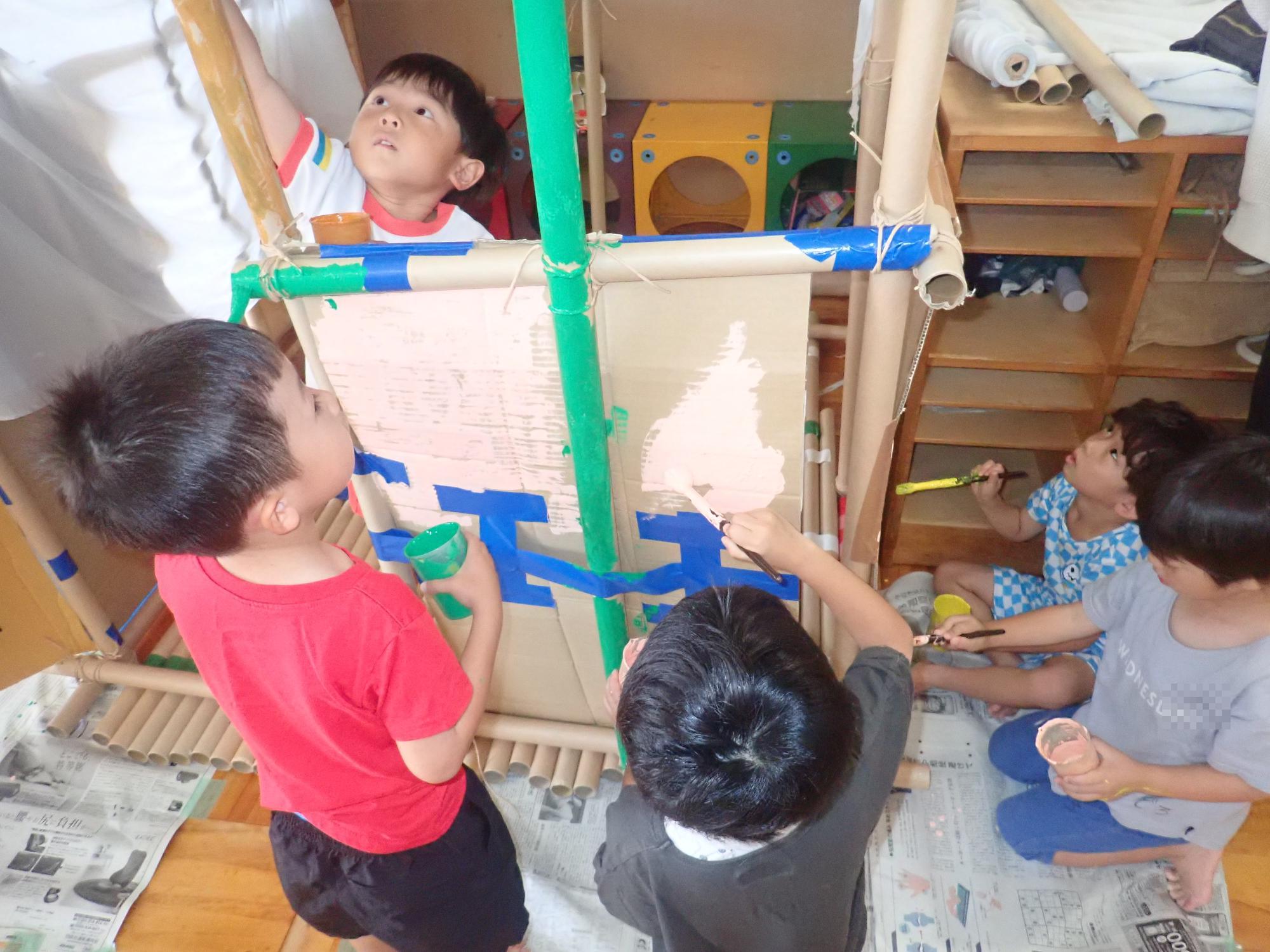 家を作りたいという子ども達が集まって、段ボールや筒芯を使って作っていましたが、上手く立たず、悩む姿がありました。子ども達だけで何とかしようとする姿を見守っていましたが難しく、先生と一緒に家づくりを実現するために頑張っています。
