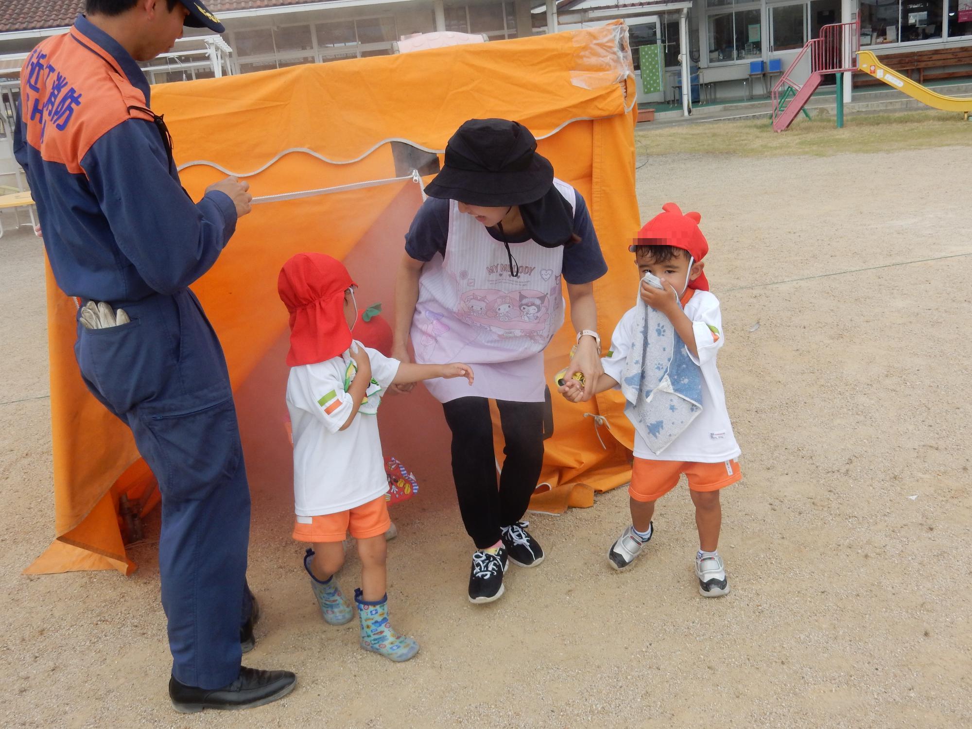 煙の体験では目の前が見えなくなり不安がる様子もありましたが、タオルできちんと口を押えて署員や担任の話を聞いて通り抜けることができました。