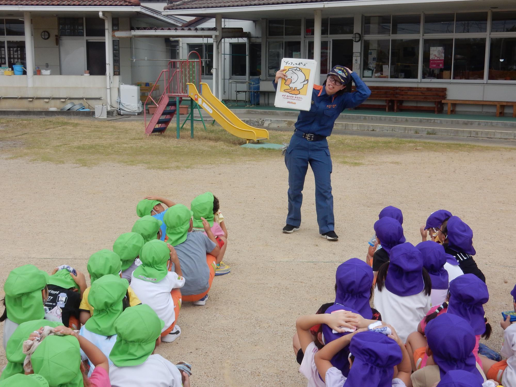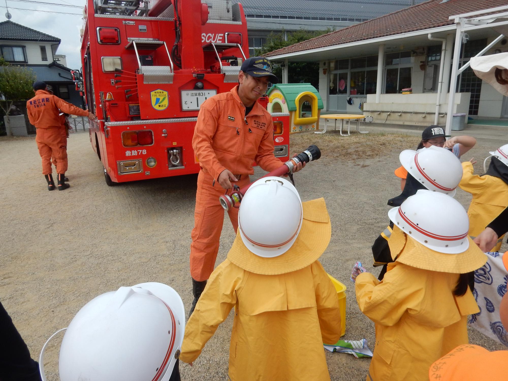 9月4日火災の避難訓練がありました。今回は東近江行政組合愛知消防署の方のご指導で、煙の体験や消防車の見学をさせていただきました。
