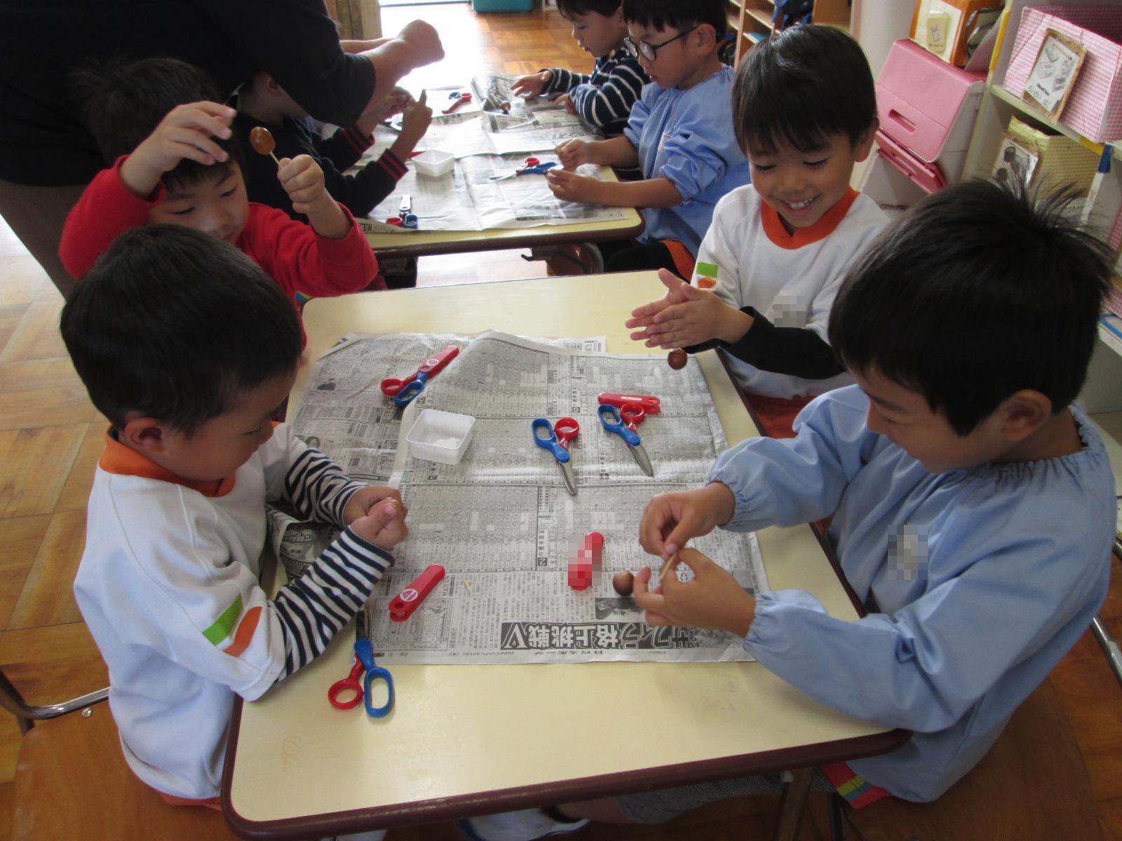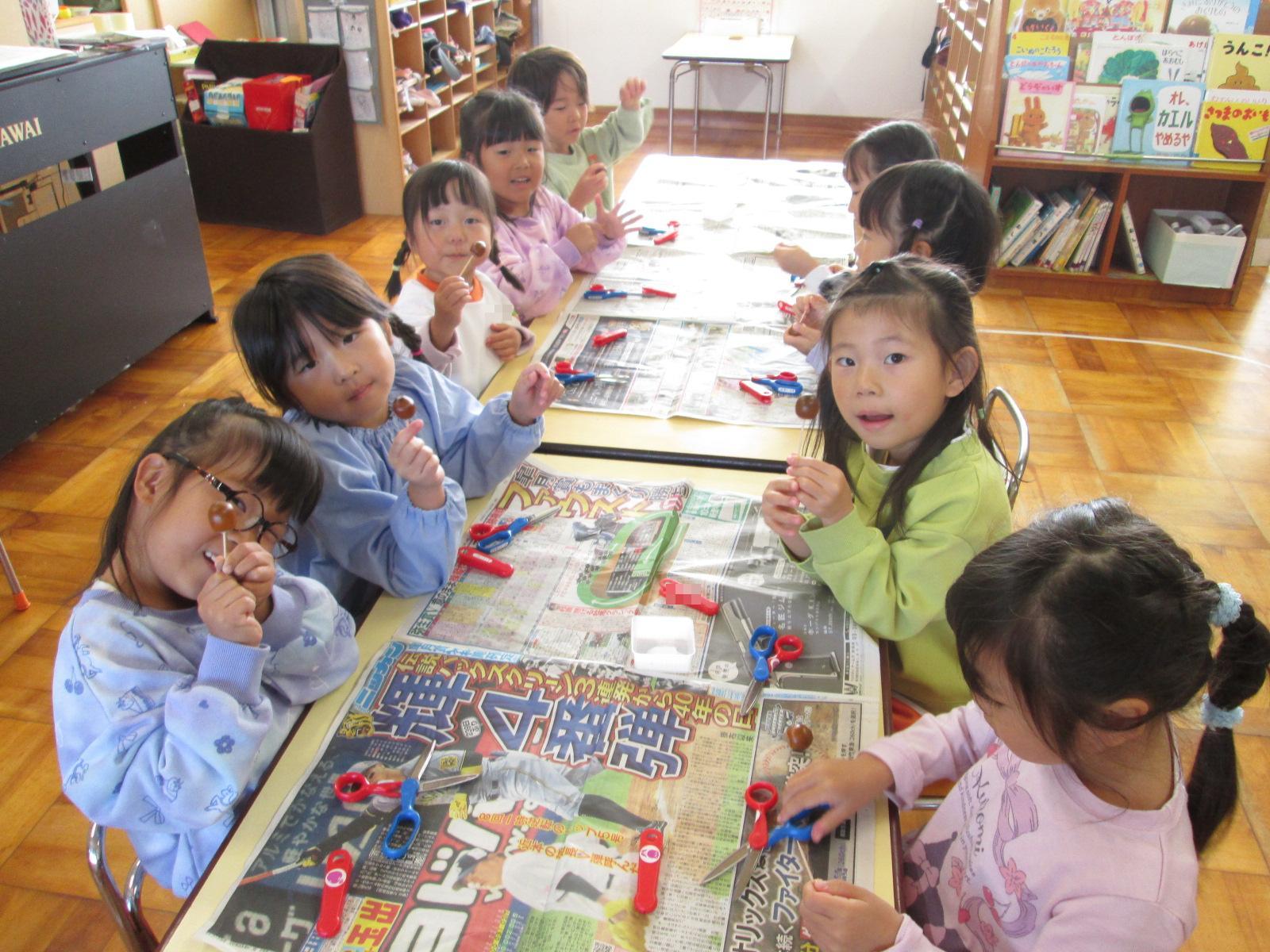 電車遠足へ出かけた時、秋の自然にたくさん触れながら、楽しく過ごしたぶどう組。次の週にドングリを使って「どんぐりこま」を作り、友達とこま回しを楽しむ姿が見られました。