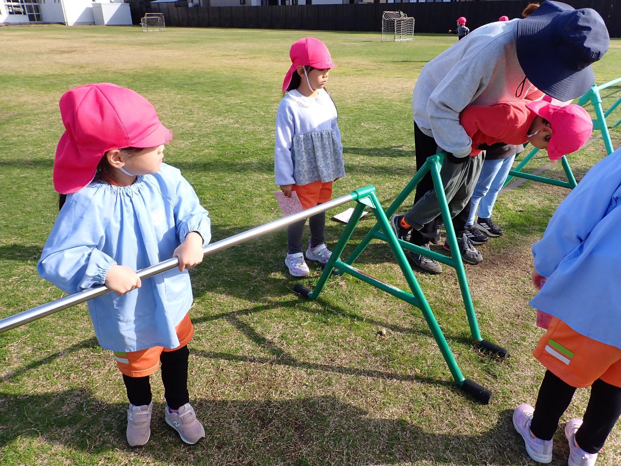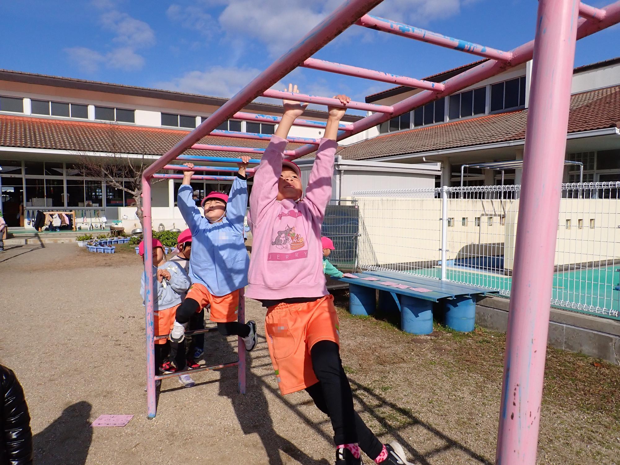 戸外では、チャレンジカードを使って、うんていや鉄棒、縄跳びなどに挑戦しています。