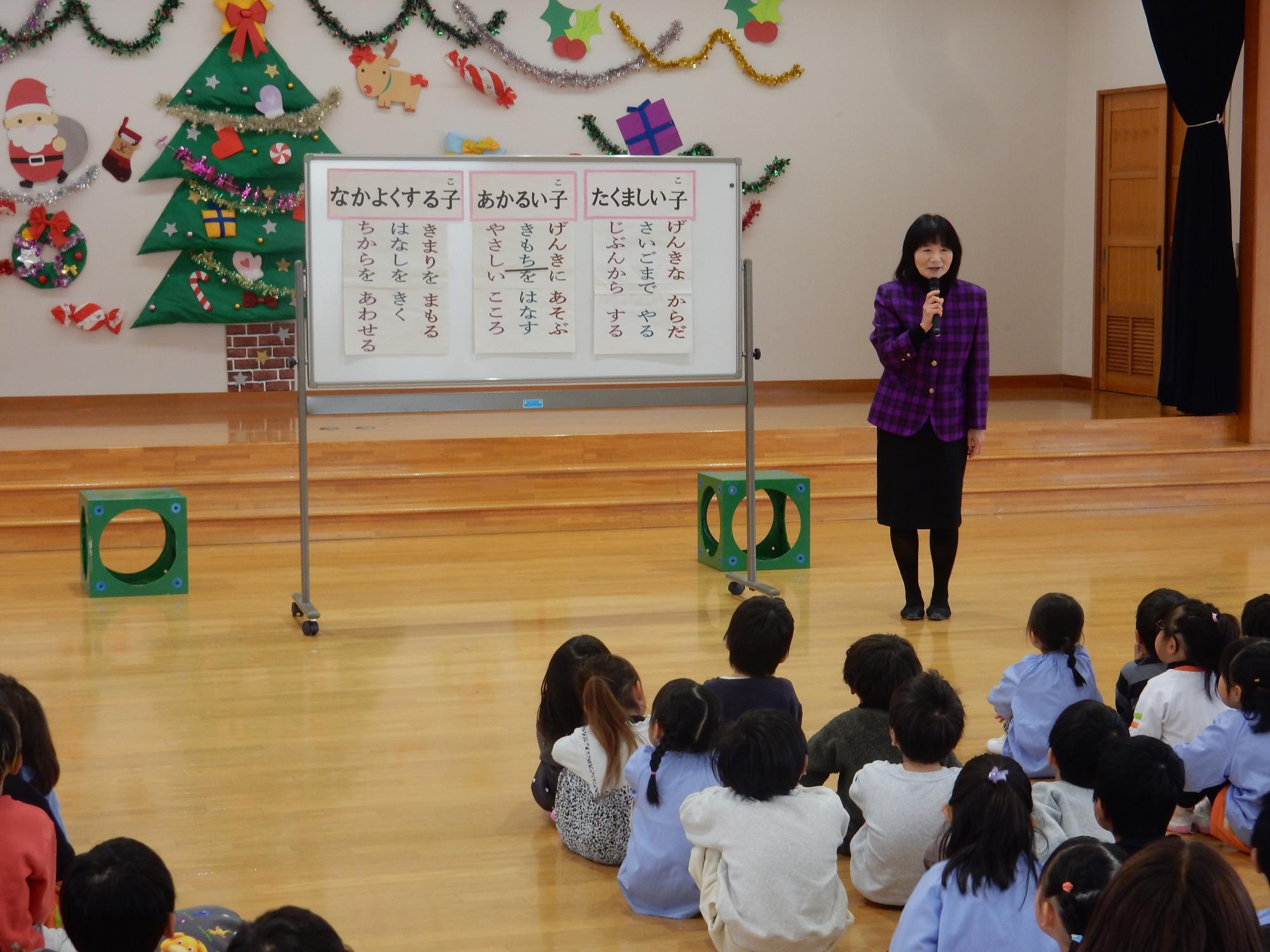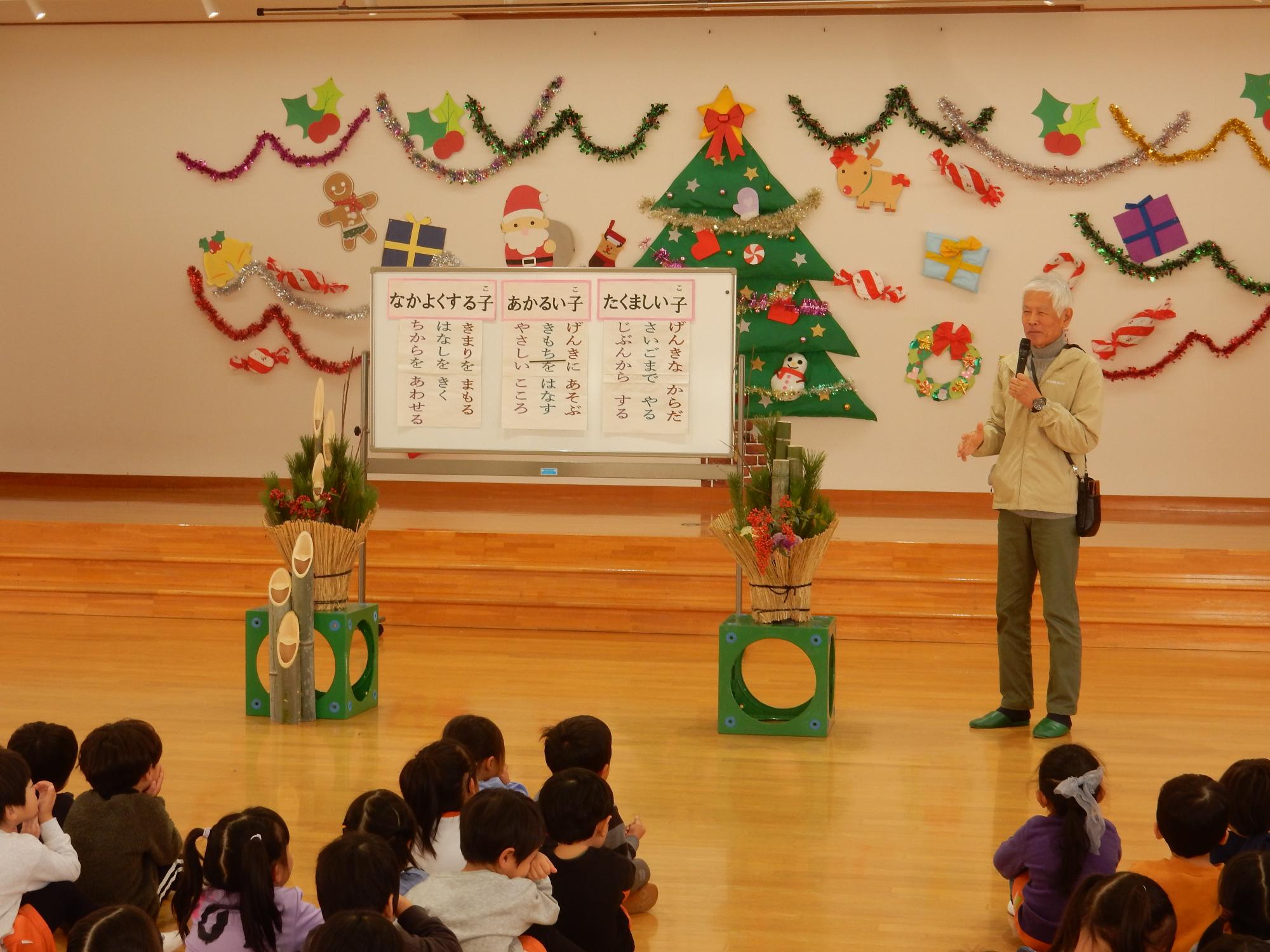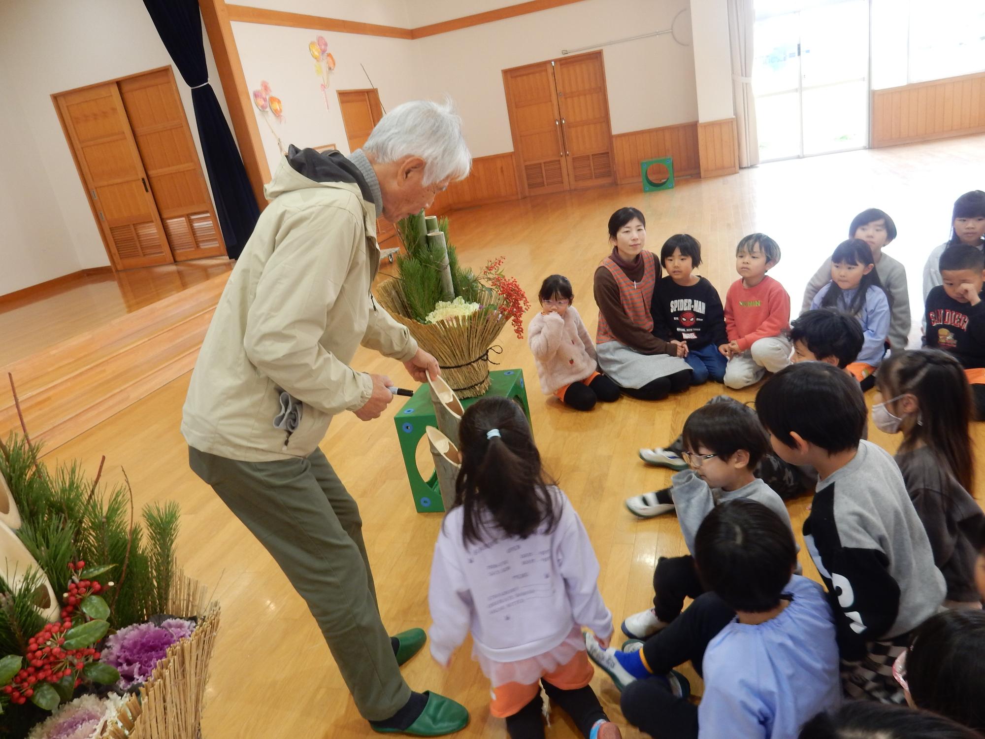 2学期の終業式 更新日:2026年01月06日 12月23日に2学期の終業式を行いました。園長先生の2学期を振り返るお話の後は、園運営協議会委員の吉島さんによる正月に門松を飾る由来についての話を聞きました。その後、年長児と一緒に門松を完成させました。 3学期にみんなに会えることを楽しみにしています♪