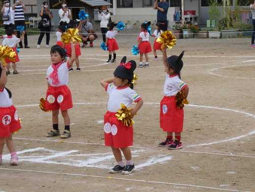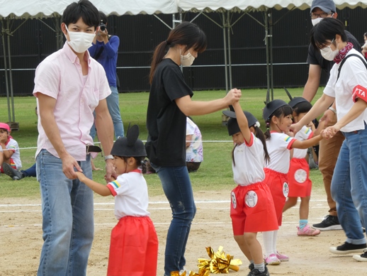 年中に続いて年少の運動会を行いました。年少さんは、「体操」、「かけっこ」、「ダンス『ジャンボリミッキー!』」、「親子ダンス『ぼくらのパワー』」を行いました。かわいい笑顔で走りきったり、ダンスはとってもかわいかったです。親子ダンスでは、お父さん・お母さんに抱っこや高い高いをしてもらい、とってもうれしい表情をしていました。