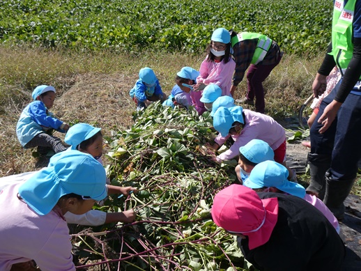 10月16日、年長さんは年少さんと一緒にさつまいものつるを取りに行きました。JAさんのとなりの畑で6月に植えたサツマイモの苗がとても大きく育ち、いっぱいのつると葉っぱがなっていました。来週の21日にサツマイモの収穫に行く前に、つるや葉っぱを取りました。とってもたくさんのつるで大変でした。でも、がんばって最後まで取りました。少しだけ幼稚園に持ち帰り、リースなどを作りたいと思っています。