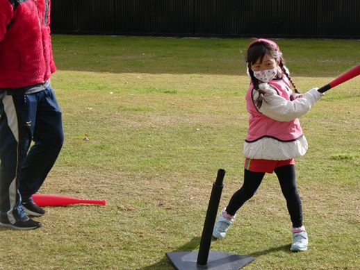 12月16日、年長組のひまわり・こすもす組がTボール教室を行いました。講師の先生からバットの持ち方、ボールの打ち方等を教えてもらいました。初めての人もいて、ボールにバットが当りませんでした。しかし、先生から教えてもらって、やっと当った人もいました。また、ボールの取りあいにもなりました。寒い日でしたが、身体を動かしてあたたかくなりました。