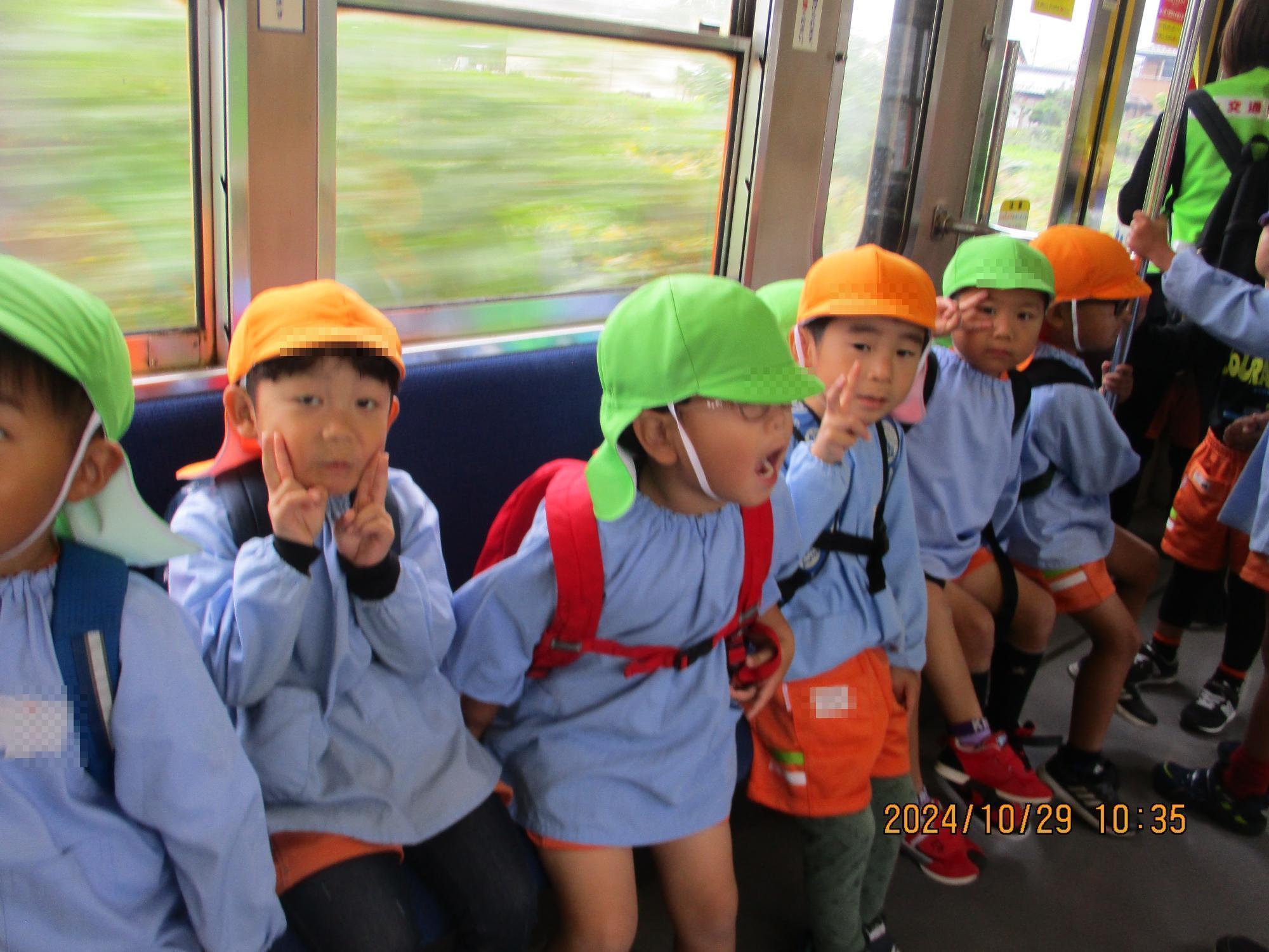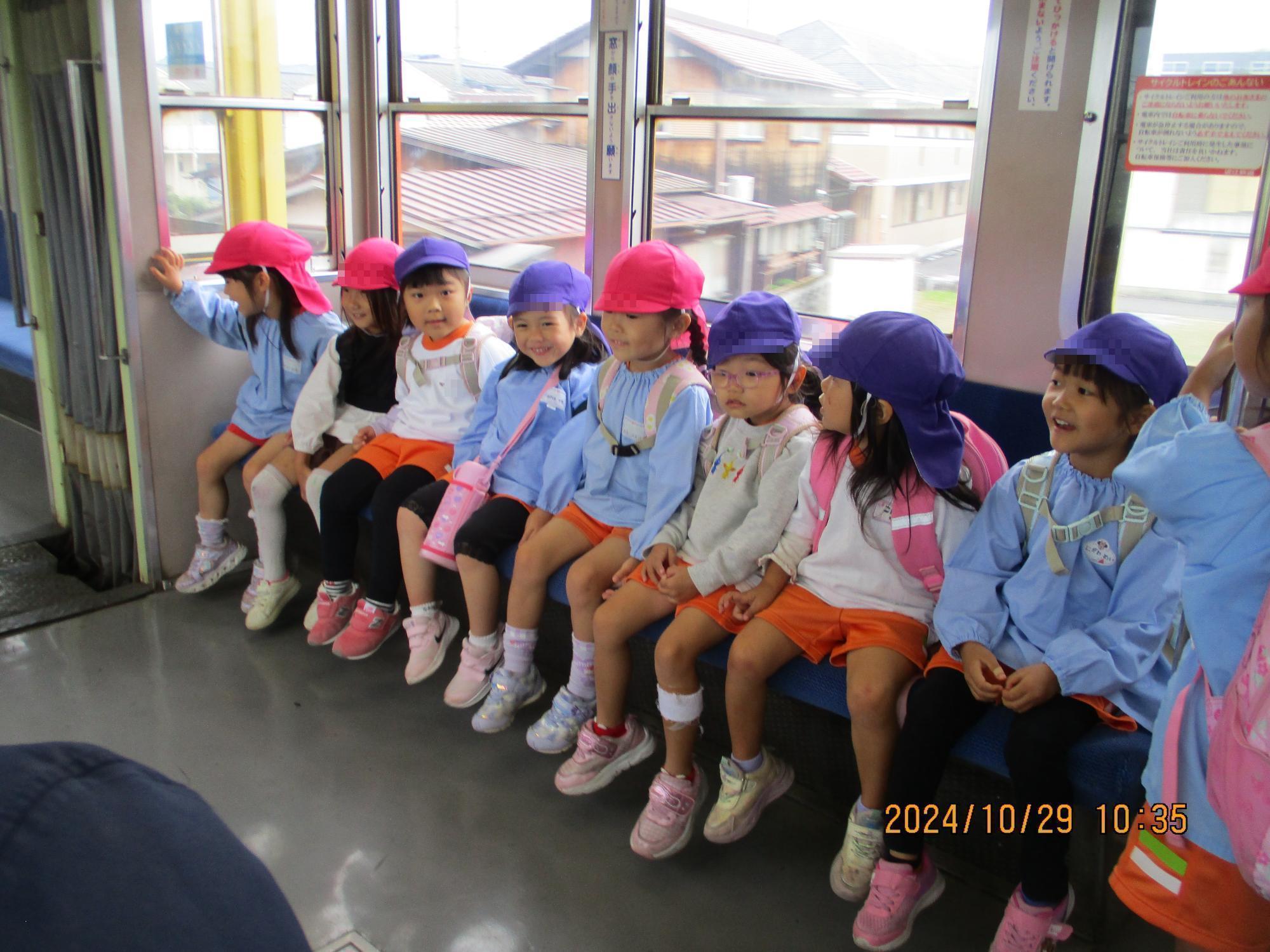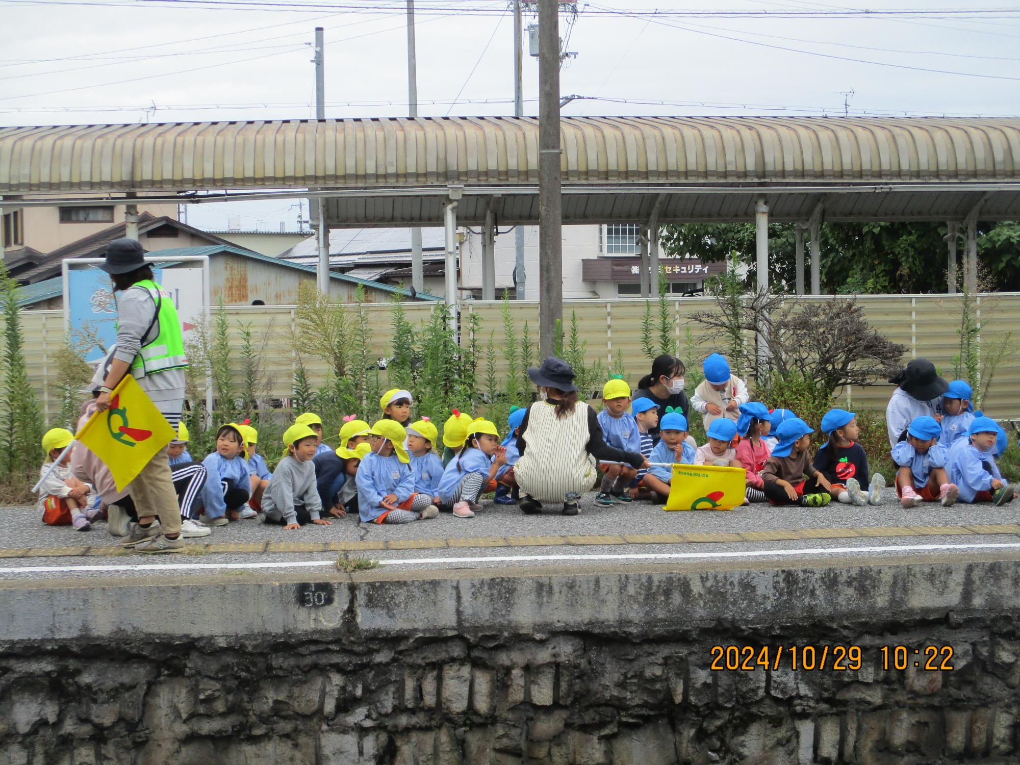 10月29日に年中・年長児が近江鉄道愛知川駅から大学前駅まで電車に乗って遠足に出かけました。年少児は駅までお見送りに来てくれました。