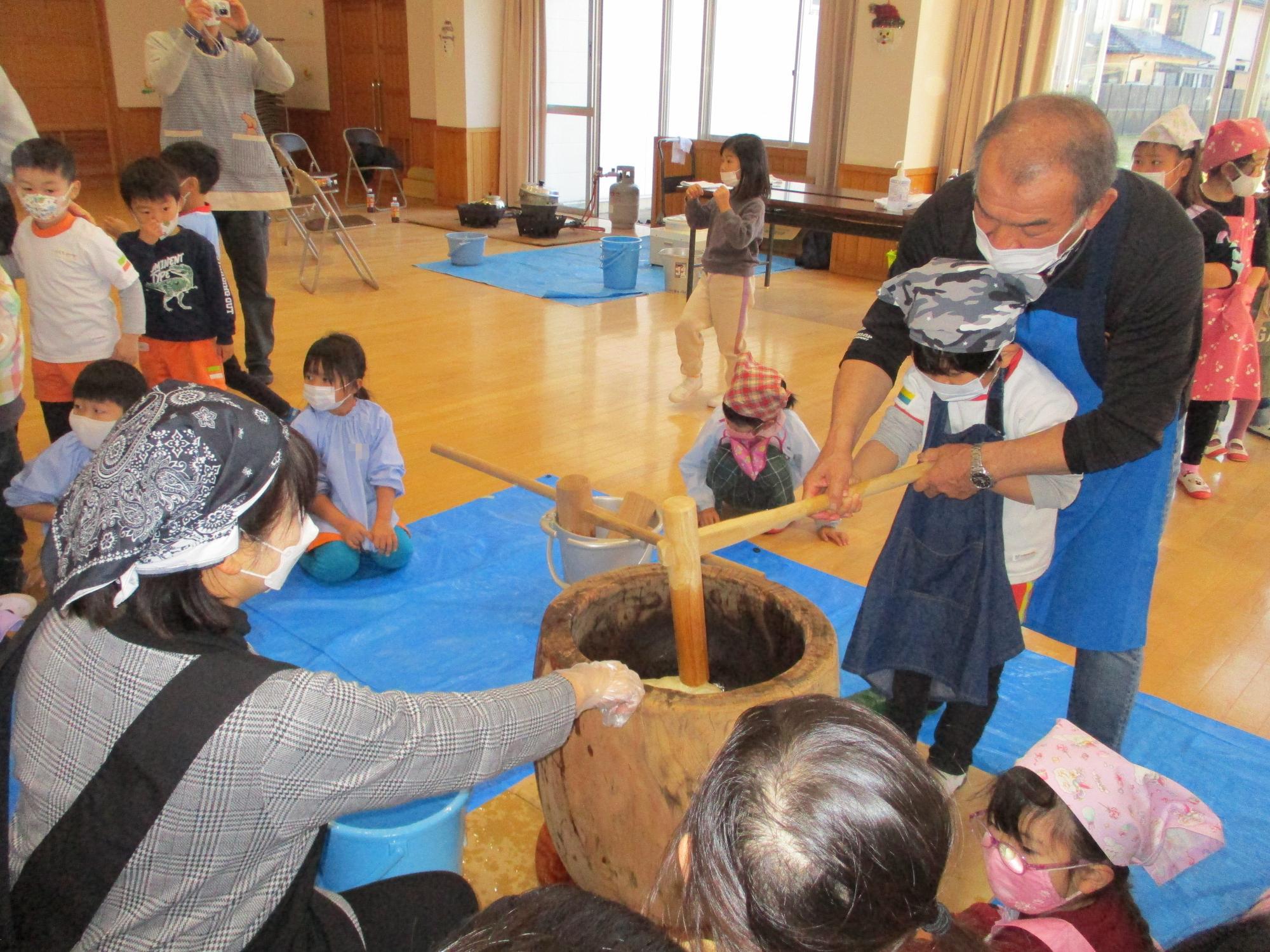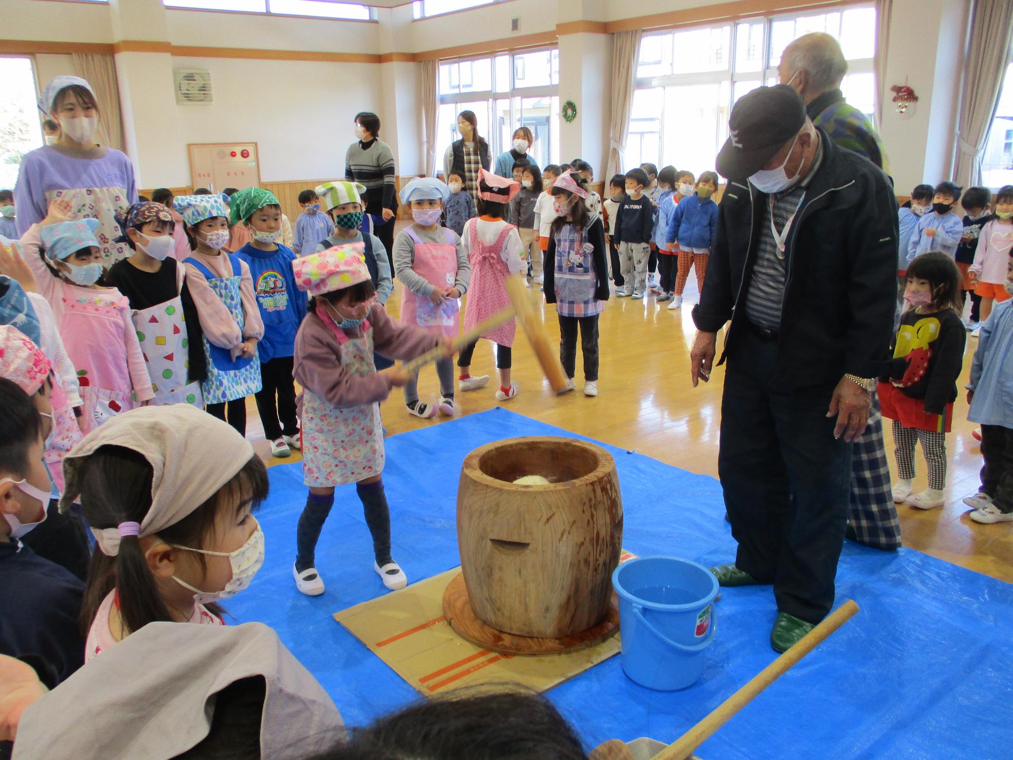 臼と杵で餅をつくのは初めての子が多い中、みんなで数を数えながら、一人5回ずつつきました。全員ついてから「もっとつきたい。」の声に再度挑戦。どの子も力いっぱいつきました。途中、年少さんや年中さんも見学にきました。ついた餅は来年の幸を願い、子ども達がお部屋で鏡餅にし、予ねて折り紙で作っておいた紅白の御幣やミカンを飾って出来上がり。年長の子ども達が年中や年少の各クラスに配ってくれました。東円堂の久保田さんをはじめ園運営協議会委員のみなさん、主任児童委員のみなさん、ご協力ありがとうございました。