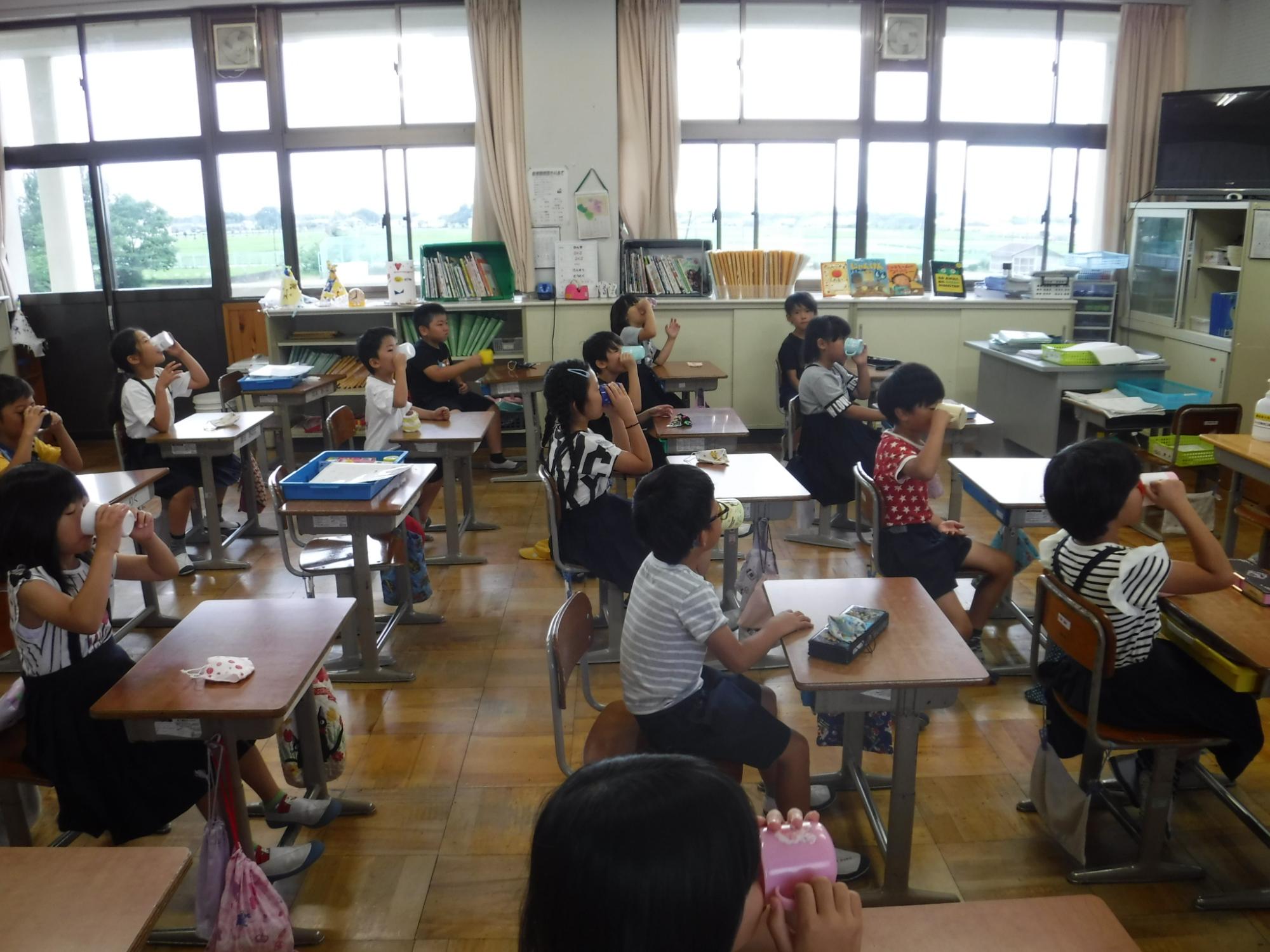 7月15日の朝、フッ化物洗口が始まりました。来週から毎週水曜日に1・2年生が継続して行う予定です。