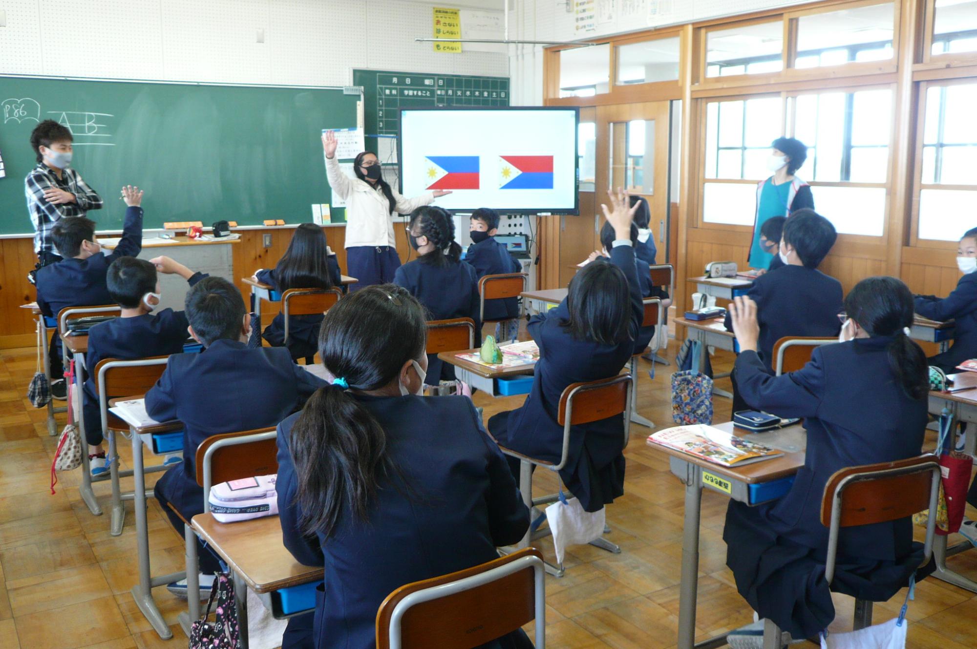 5年生は外国語活動の授業でフィリピン出身のALT(リン先生)に自己紹介やフィリピンの国旗の意味について電子黒板を使って教えてもらいました。次の授業では自分の名前や好きなものを外国語で言う練習をします。うまく伝わるといいですね。