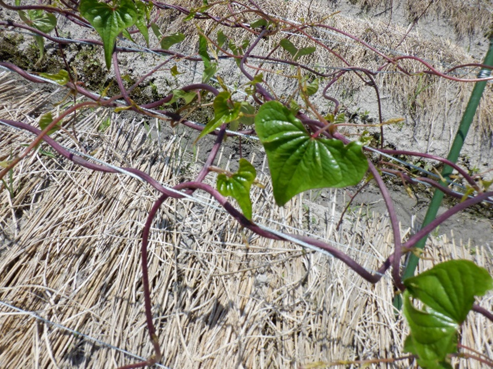 やまいもが秦荘地域で作られるようになった経緯や育て方について、農家の方のお話を聞いた後、畑に入らせていただきやまいもの苗の観察をさせていただきました。