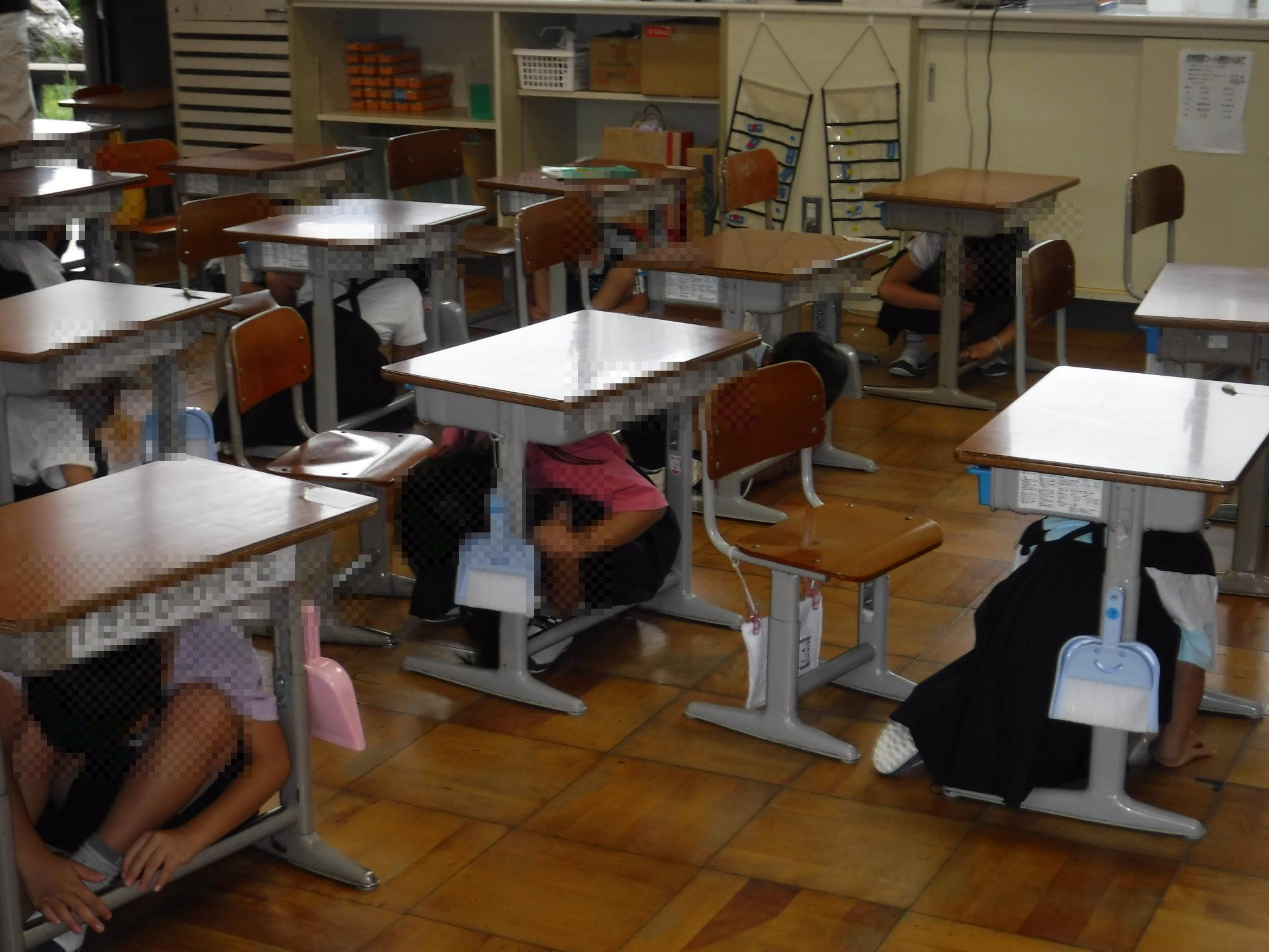 地震⇒火災という設定で、子どもたちは自分の身を守るために、机の下にもぐり、火災現場から遠い場所へすばやく避難しました。災害はいつ起こるかわかりません。自分がどう行動するとよいのか、しっかり放送や指示連絡を聞いて、自分で考えて動くことの大切さを学びました。
