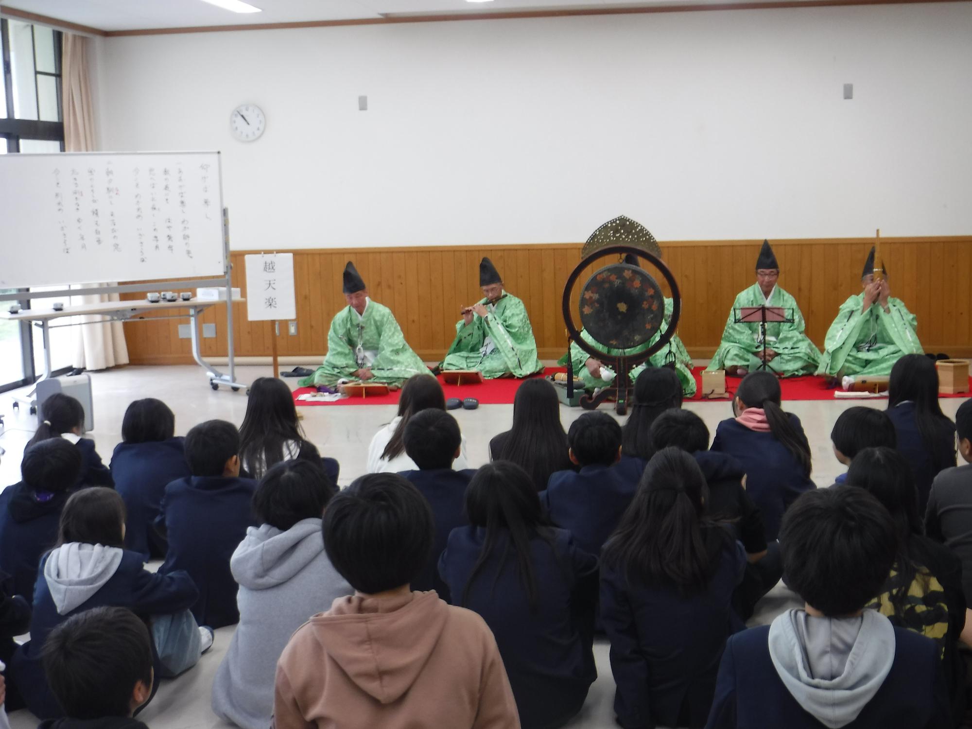 12月4日(水曜日)千鳥会の皆さんに来校いただき、雅楽について教えてもらいました。事前に雅楽の歴史やどのような楽器が使われているのかについては学んでいましたが、実際に生の演奏を聴くのは初めて!!美しい音色に子どもたちは引き込まれていました。実際に楽器を触らせていただくこともできました。うまく音が出たと喜ぶ姿がほほえましかったです。