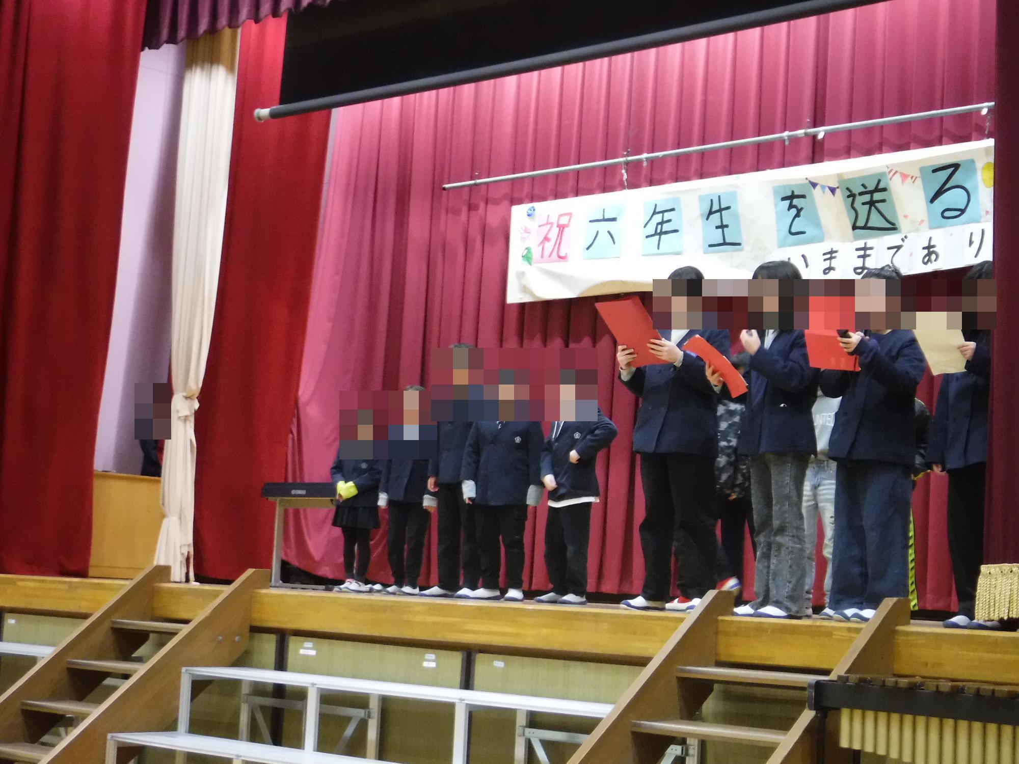 6年生を送る会を行いました。6年生を送る会は、それぞれの学年が6年生に感謝の気持ちを伝える場であり、また、自分たちのこれまでの成長を発表する場でもあります。どの学年を見ても素晴らしい発表で感動しました。6年生に対する子どもたちの思いがつまったあたたかい会となりました。