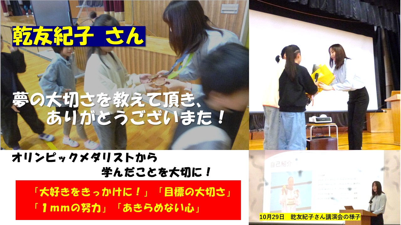 10月29日(水曜日)の学習参観後、PTA研修会を開催し、オリンピックメダリスト、乾友紀子さんを講師として、「夢の叶え方~あきらめない心が未来をひらく~」という演題で講演いただきました。当日は乾さんのこれまでの競技人生から学んだこと、得たことについて語っていただきました。夢や目標の大切さ、ちょっとだけ背伸びして継続することの大切さ(1ミリメートルの努力)、あきらめない心の大切さなど、親子で多くのことを学ぶことができました。乾さん、本当にありがとうございました。