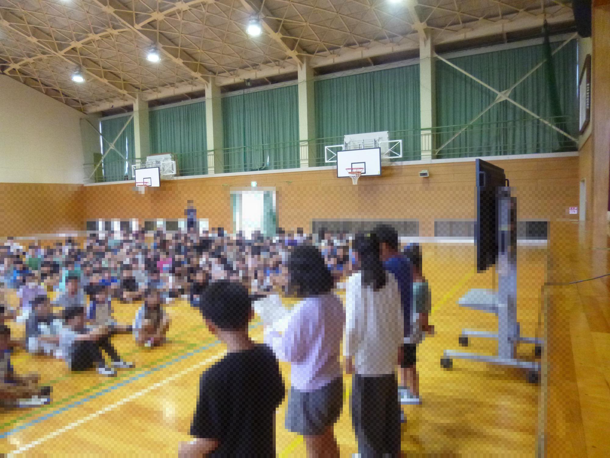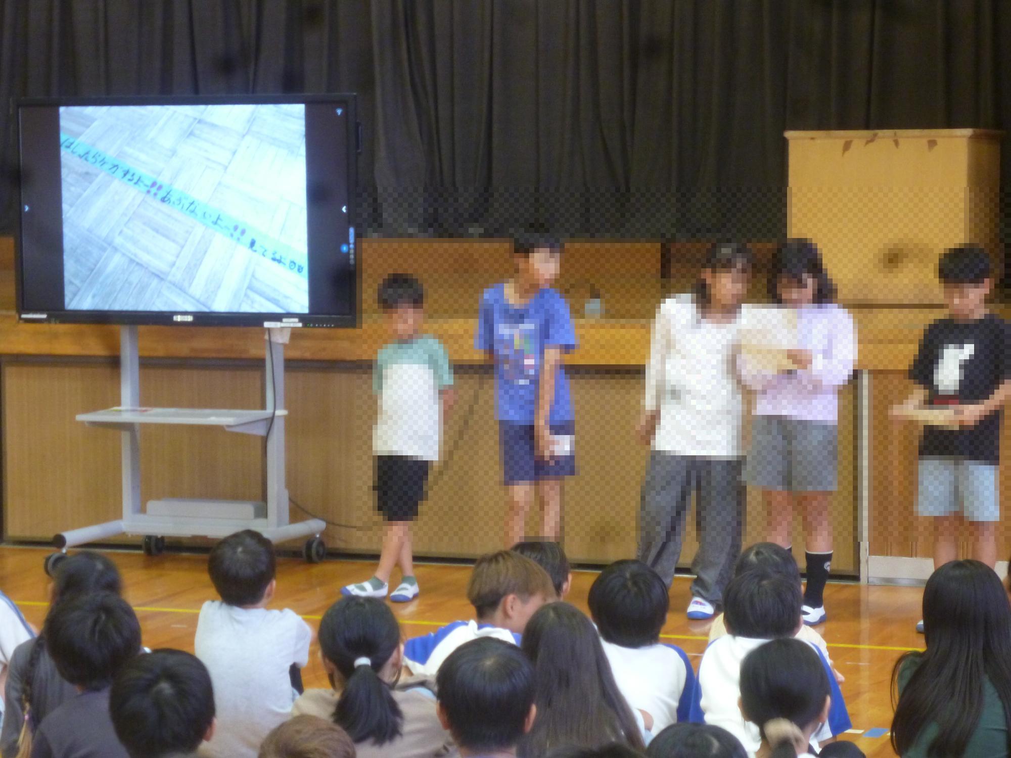 今日の秦西タイムは秦西ミーティング。今月の生活目標は3年生の担当です。3年生は学級会の中で今の学校の課題を話し合い、いくつか意見がでた中で、「ろうかを歩こう」に決定したことを発表してくれました。特に雨の日は廊下を走る人が多いということで、曲がり角などに注意喚起のテープも貼ってくれました。3年生を中心に、廊下歩行を意識できる10月にしたいです。