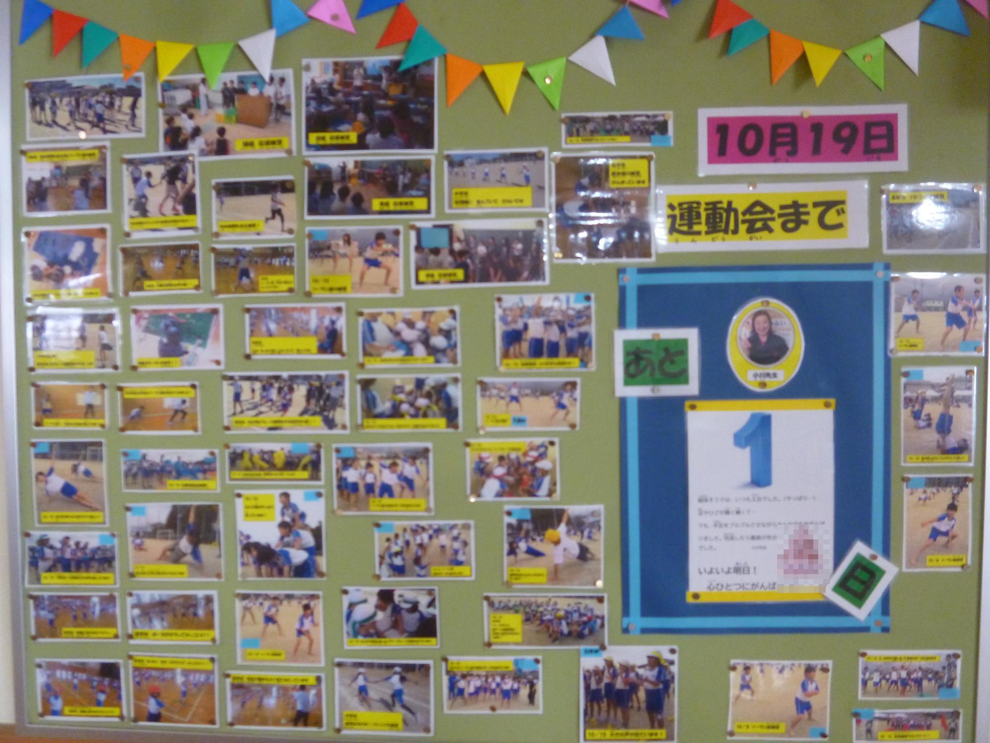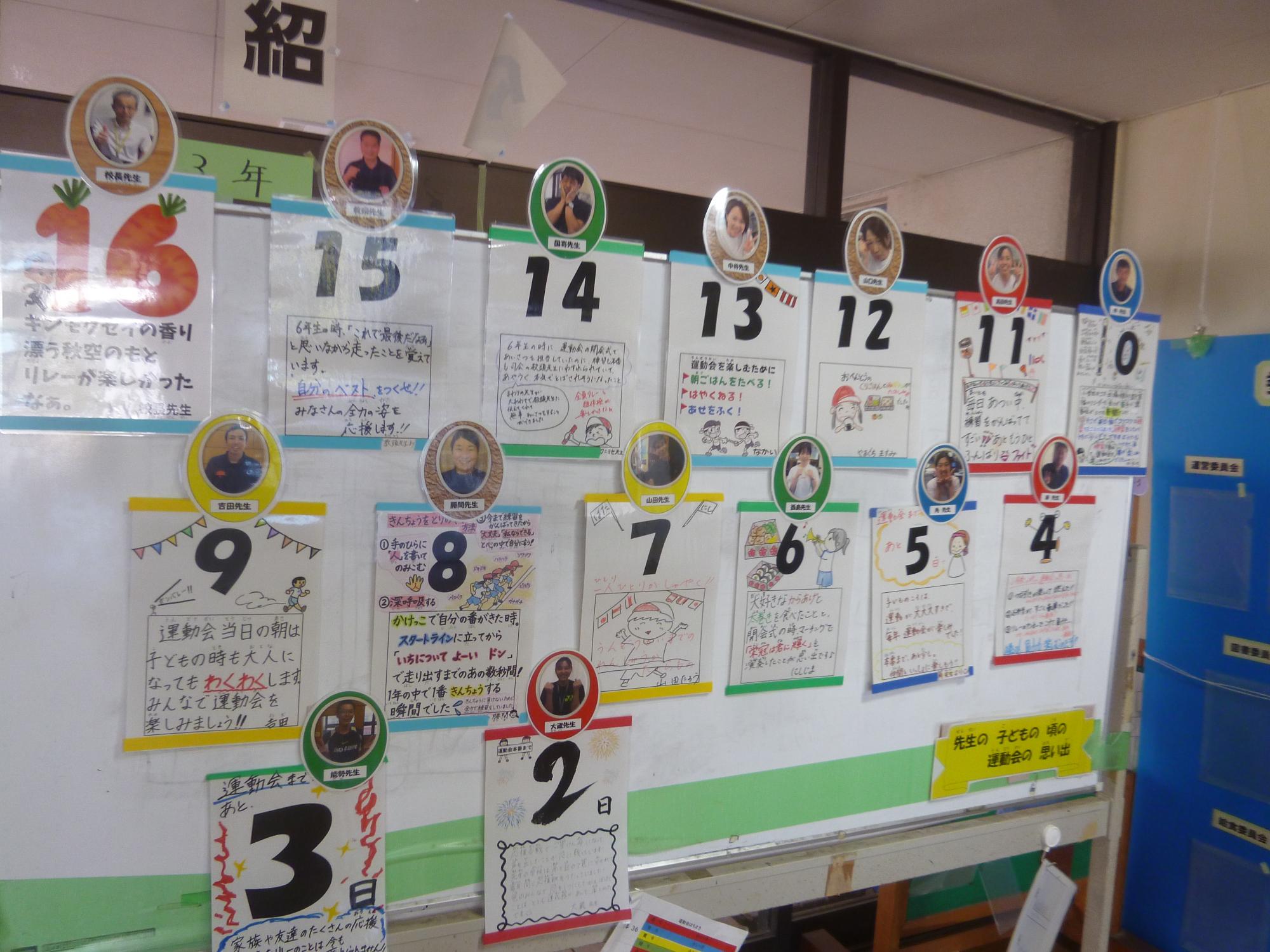 日曜日は運動会です。本番までの道のりを先生たちのメッセージ付きでカウントダウンをしてきましたが、今日で、「あと1日」になりました。