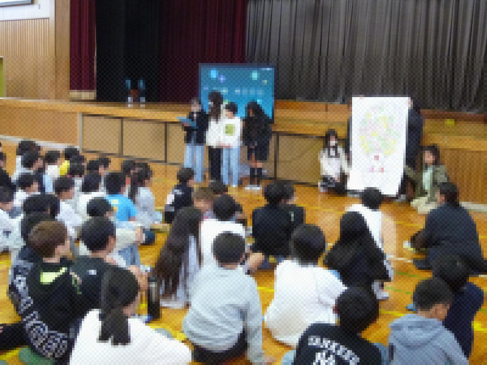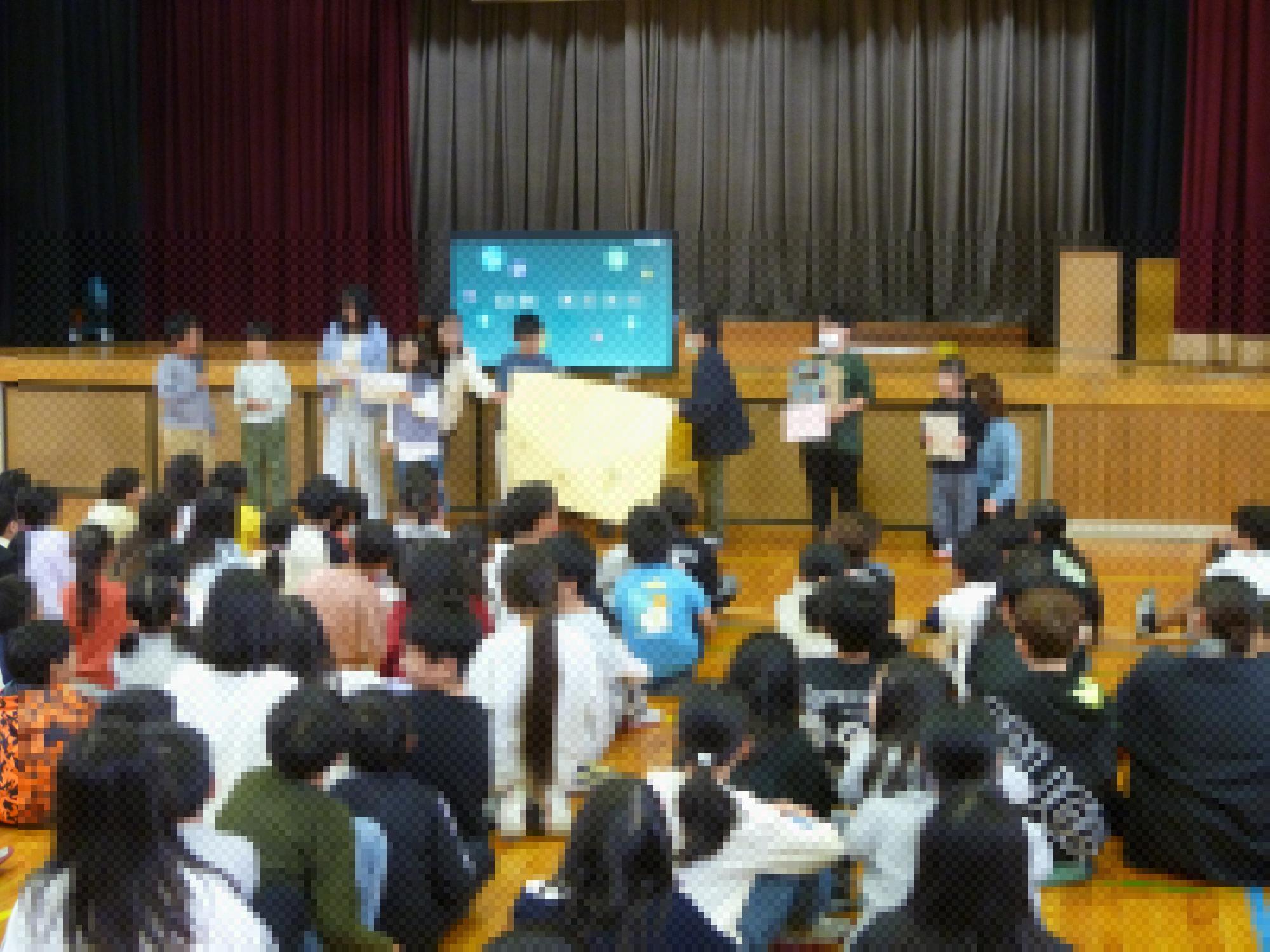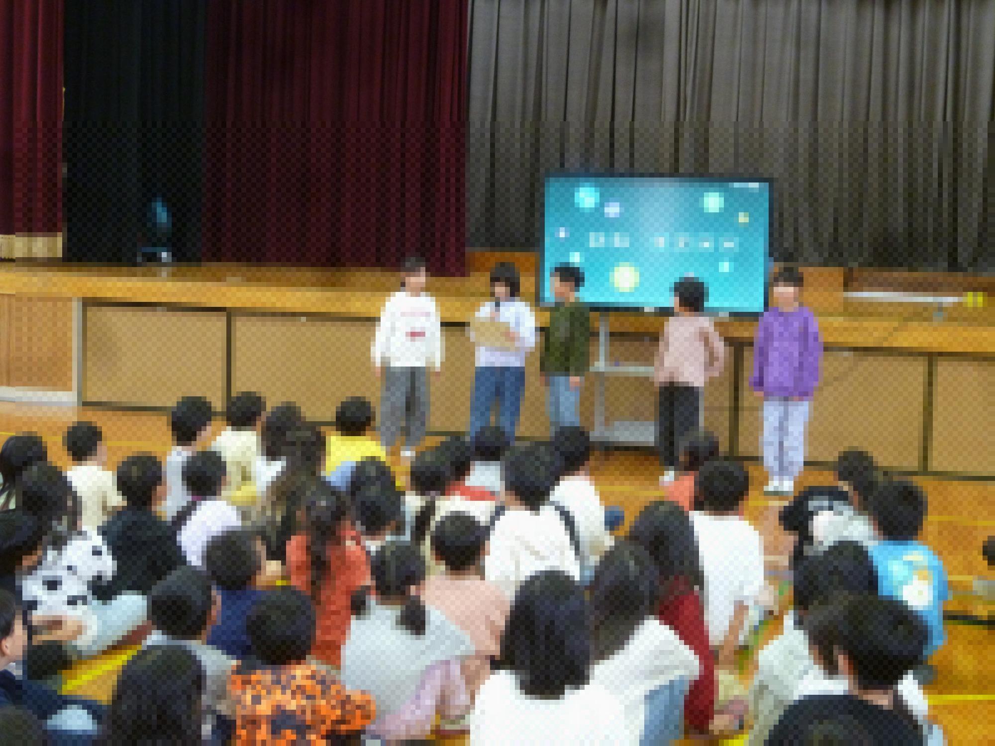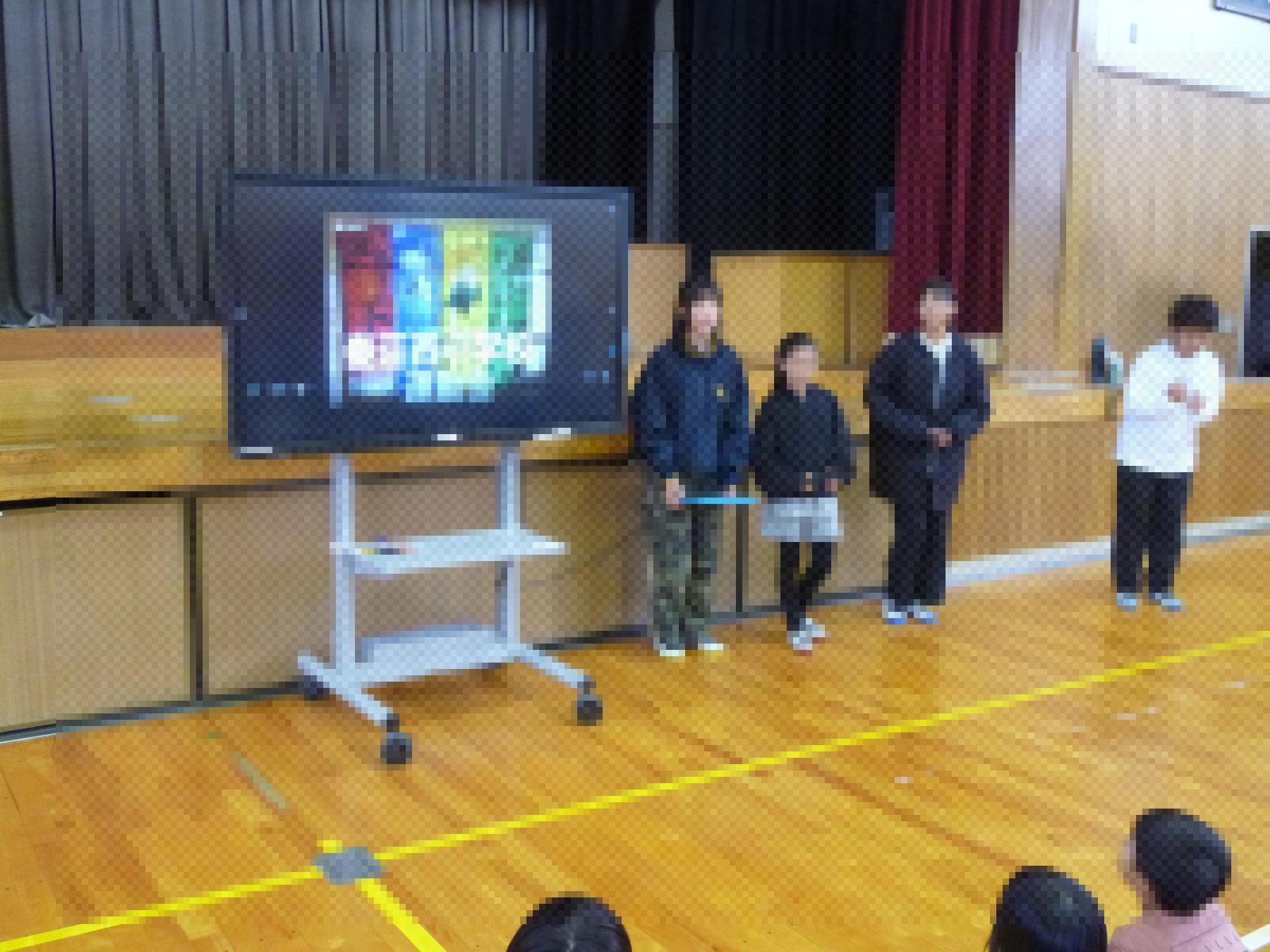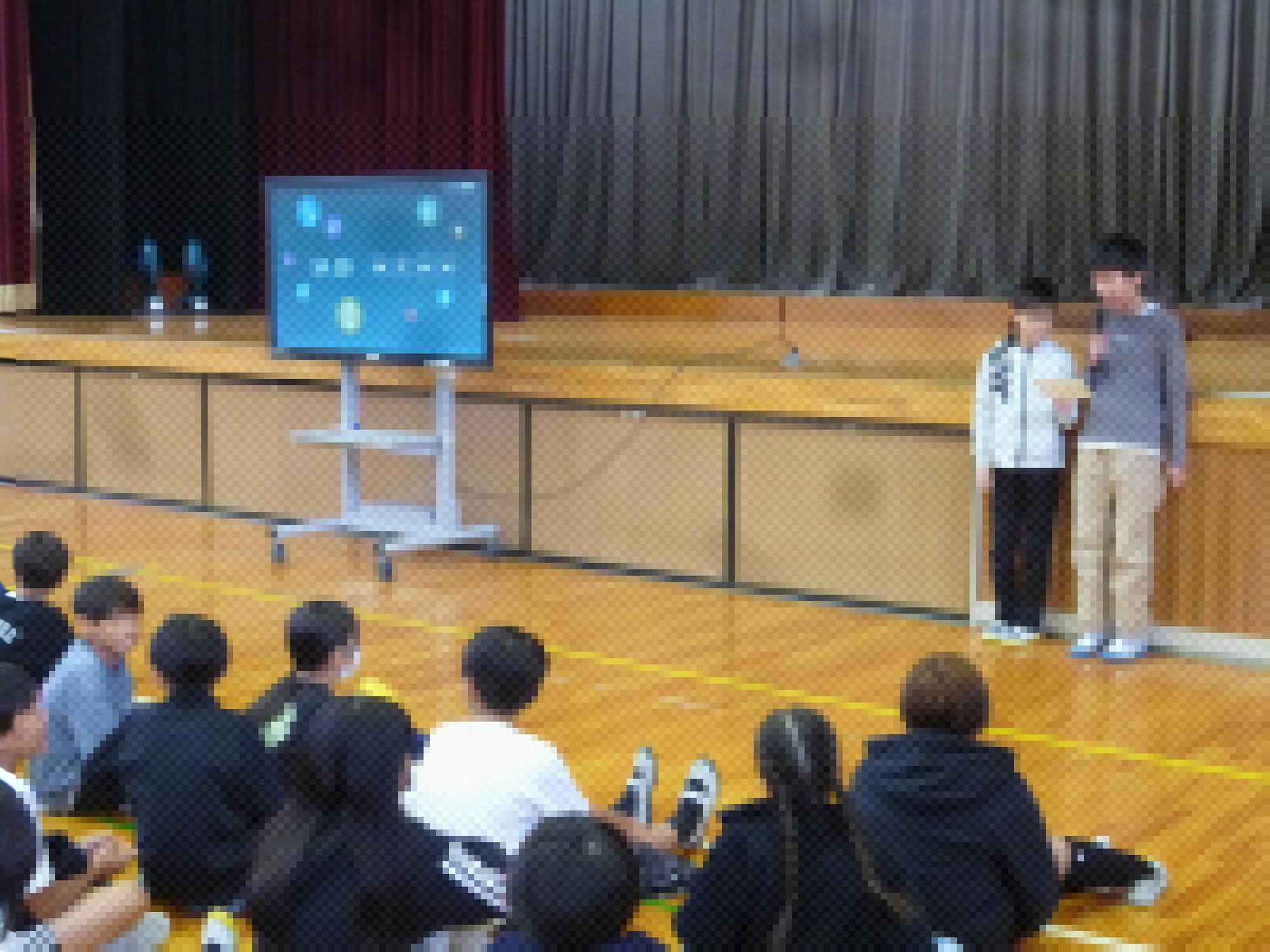 その後は5年生の思いやりボランティアによる発表です。11月は道徳教育における「思いやり重点月間」です。そこで5年生有志が、校舎内に「思いやりポスト」を作り、友達から受けた優しさを集めてくれています。その取組について発表しました。次に、6年生有志が運動会の振り返り動画を作成してくれたので、みんなで視聴しました。また各色の副団長が各色メンバーにお礼の言葉を送っていました。最後に環境委員から、中庭づくりボランティアの募集がありました。