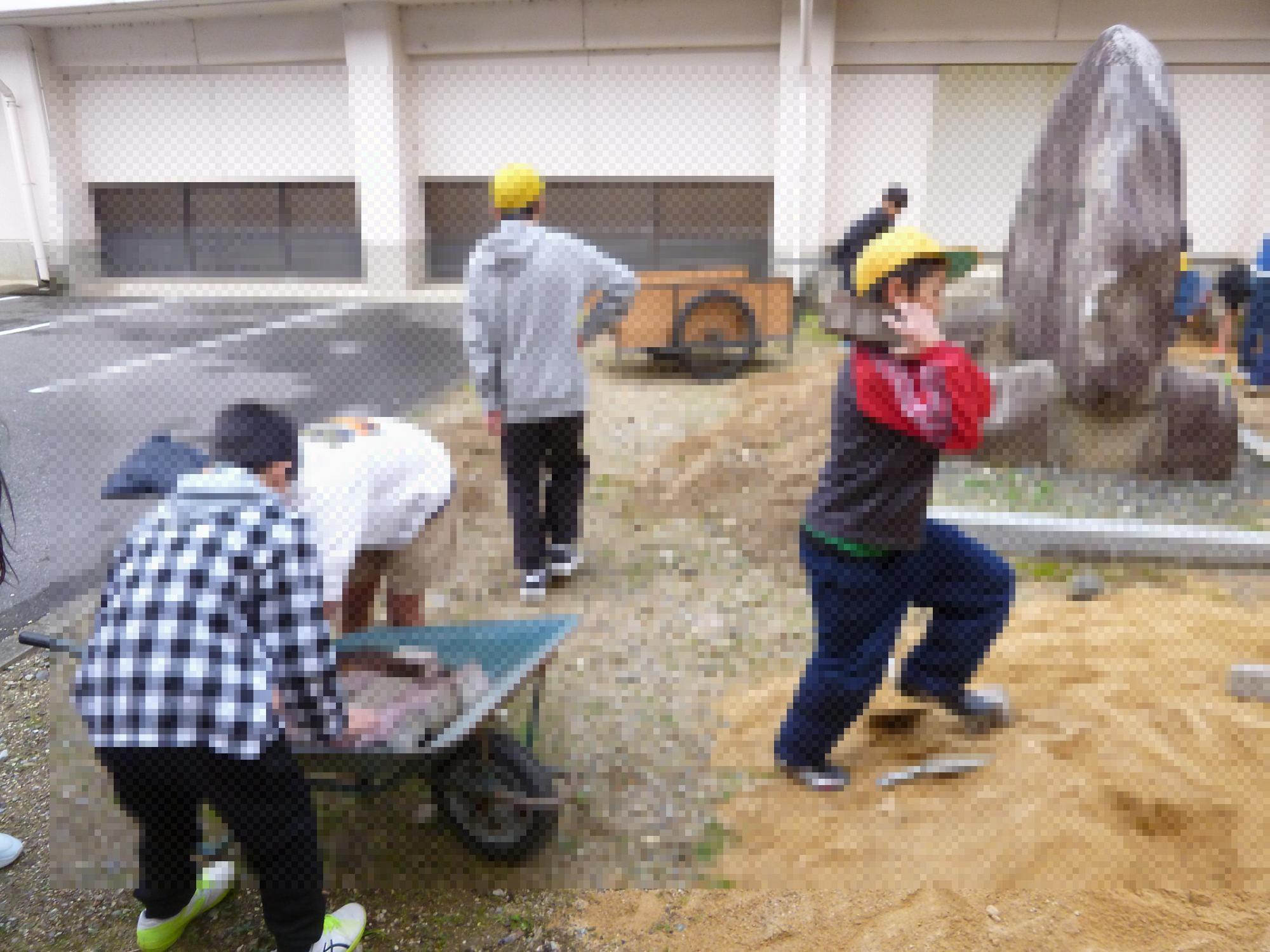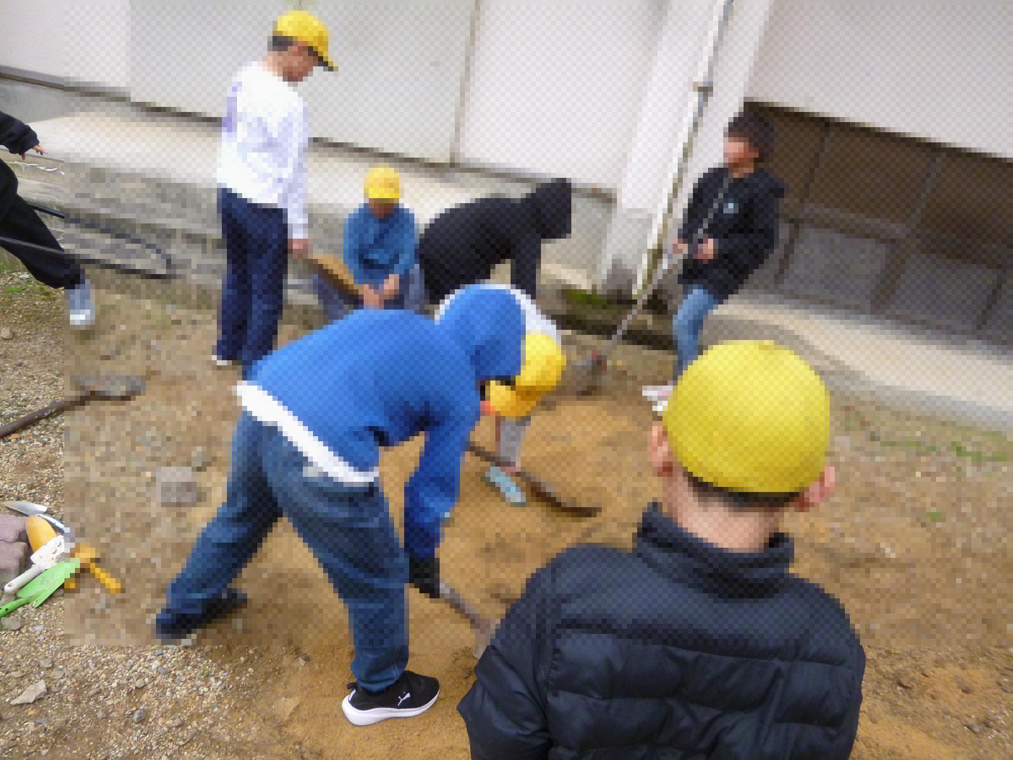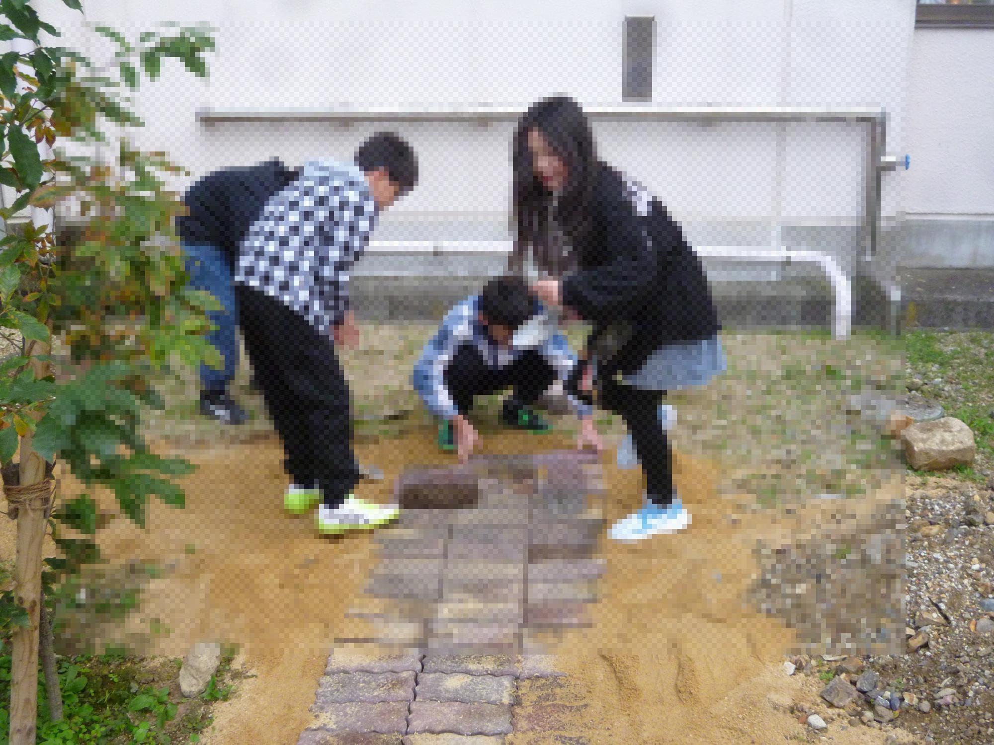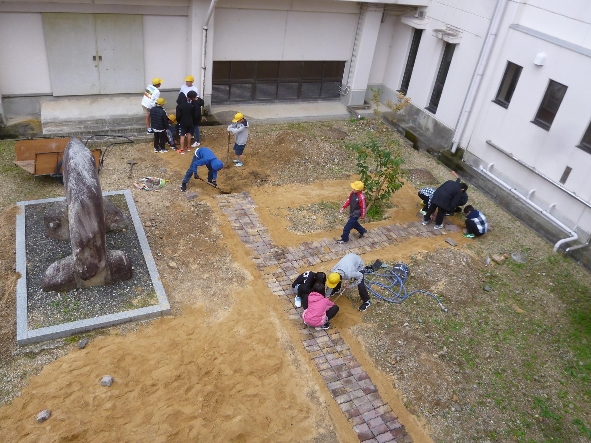 くじゃく小屋跡を、「みんなが集える憩いの場にしよう!」と募った中庭づくりボランティア。4年生以上16名の子どもたちが応募してくれました。ボランティアに参加してくれた子どもたちは休み時間に協力しながらレンガを並べ、中庭の道をつくってくれています。当初は昼休みのみの活動を計画していましたが、作業が進むにつれてレンガ敷きの道が出来上がっていく達成感が面白いようで、朝休みや中休みにも作業をしてくれています。道ができると、周囲に人工芝を敷く計画です。完成を楽しみにしています!