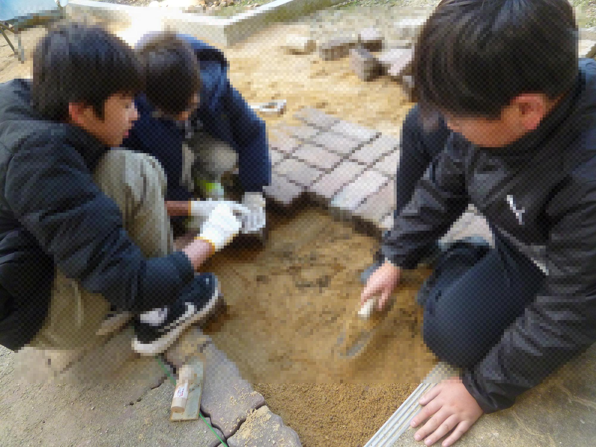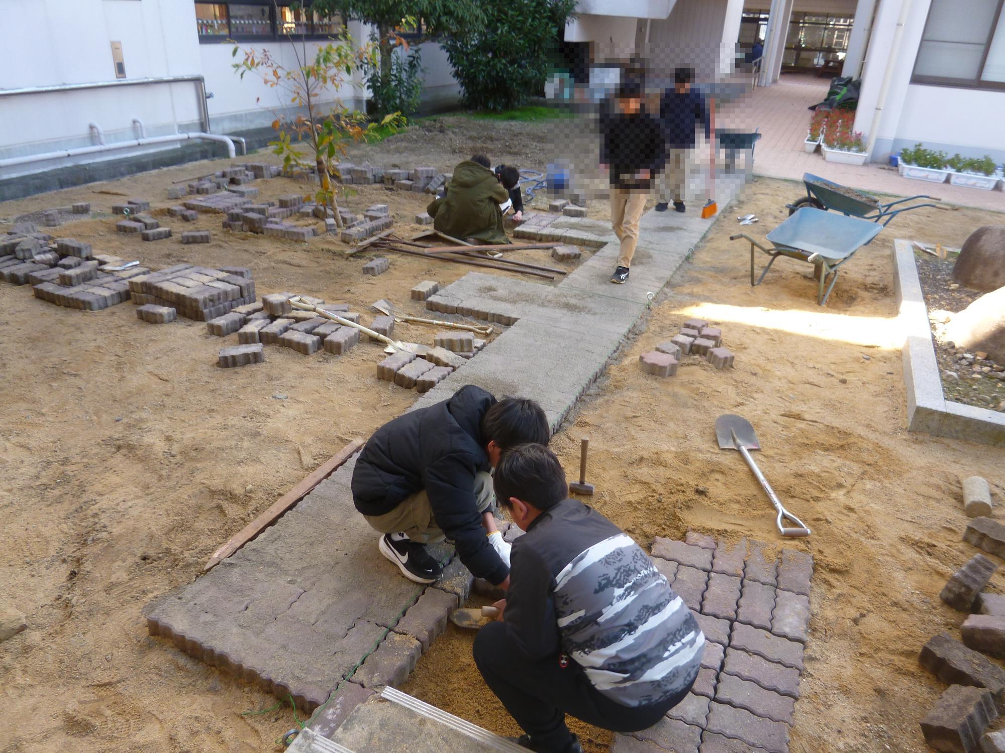クジャク小屋跡に中庭をつくるプロジェクトも進行中です。4~6年生のボランティアで中庭にレンガを並べて通路を作っています。通路の周囲に人工芝を敷き、そこにベンチを置き、上靴のまま外でくつろげる中庭を作っています。隣り合うレンガの高さを調整しながら並べる作業にもずいぶん慣れたようで、出来栄えも素晴らしいです。こちらも完成が楽しみです。