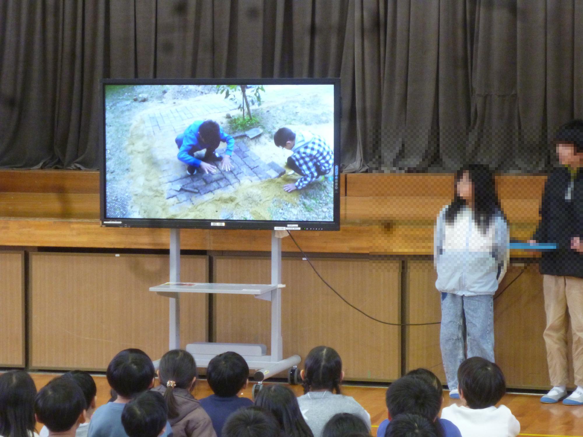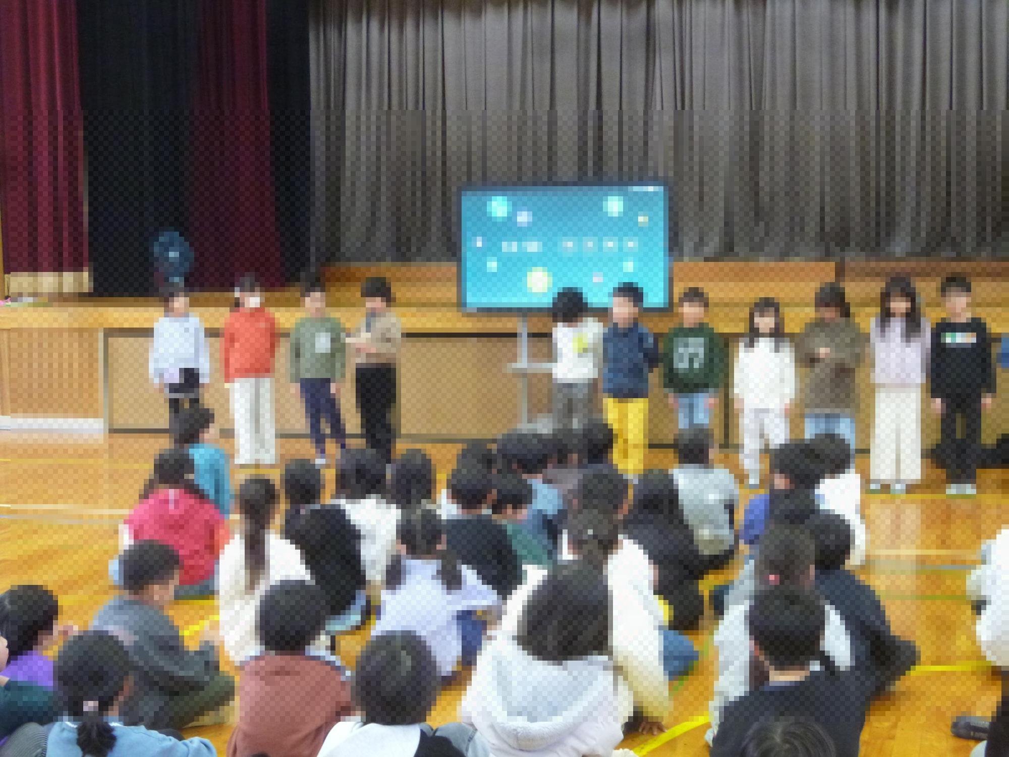 この日の秦西タイムは、月一回、全校児童が集う「秦西ミーティング」でした。まず、2年生が1月の生活目標を発表してくれました。2年生が決めた1月の全校生活目標は「元気にあいさつをしよう」です。2年生の学級会では、最近の学校の様子を話し合い、元気なあいさつができていないことに課題を感じ、この目標にしてくれたそうです。ミーティングの中では元気なあいさつの見本を見せてくれました。今月は特に元気なあいさつを意識したいものです。その後、中庭づくりボランティアのメンバーが今の進行状況を発表してくれました。最後に秦西まつりボランティアが、人気のブース投票の結果を発表し、表彰してくれました。また、この日は、北海道から中学校の先生が視察に来ていたため、急遽、北海道の学校について質問コーナーが設けられ、全校児童からのいろんな質問に北海道の先生が丁寧に答えてくれました。短時間でしたが、中身の濃い、ミーティングとなりました。