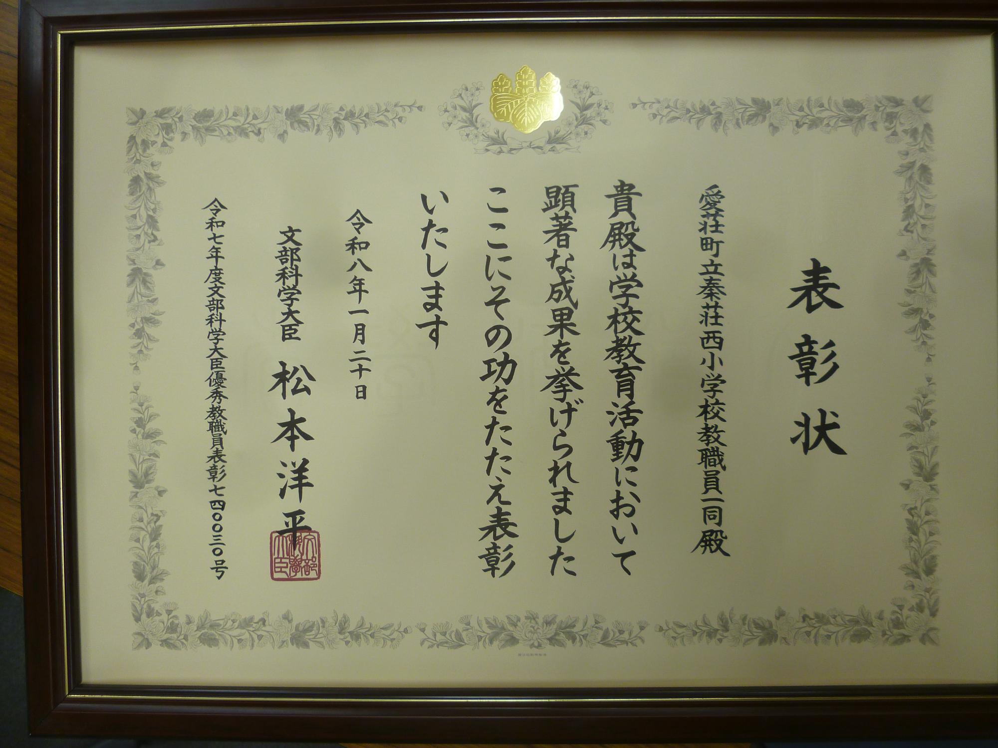 この度、本校教職員組織が令和7年度文部科学大臣優秀教職員表彰を受賞いたしました。柔軟な教育課程を取り入れ、児童の成長につながるアイデアに満ちた教育活動を実践している点が評価を受けました。この受賞を励みに、これからも地道に秦荘西小に集う児童の成長を願いながら実践を積み重ねていきたいと思います。